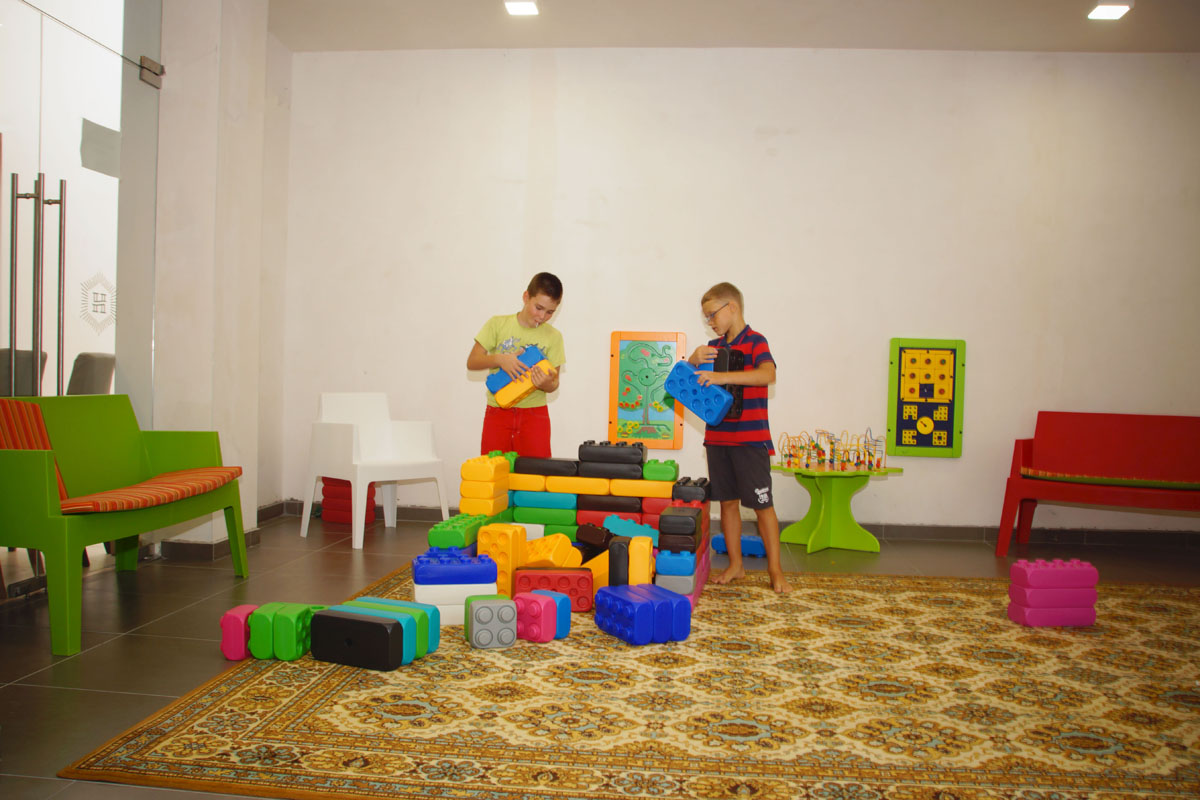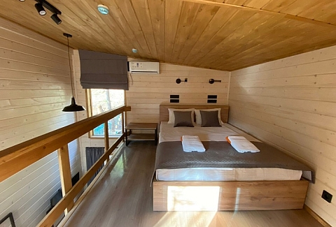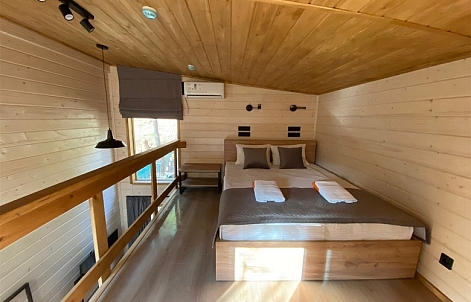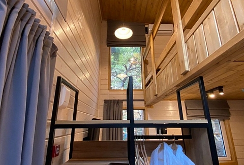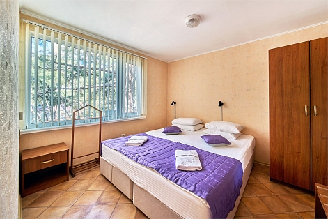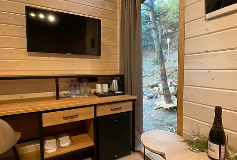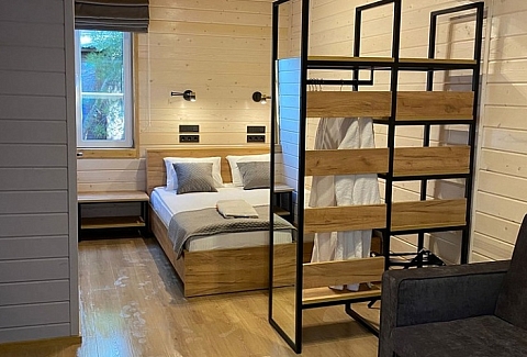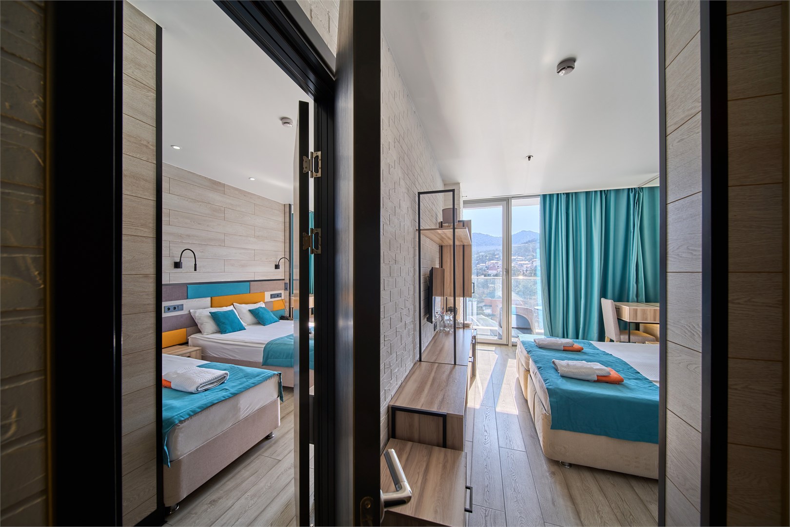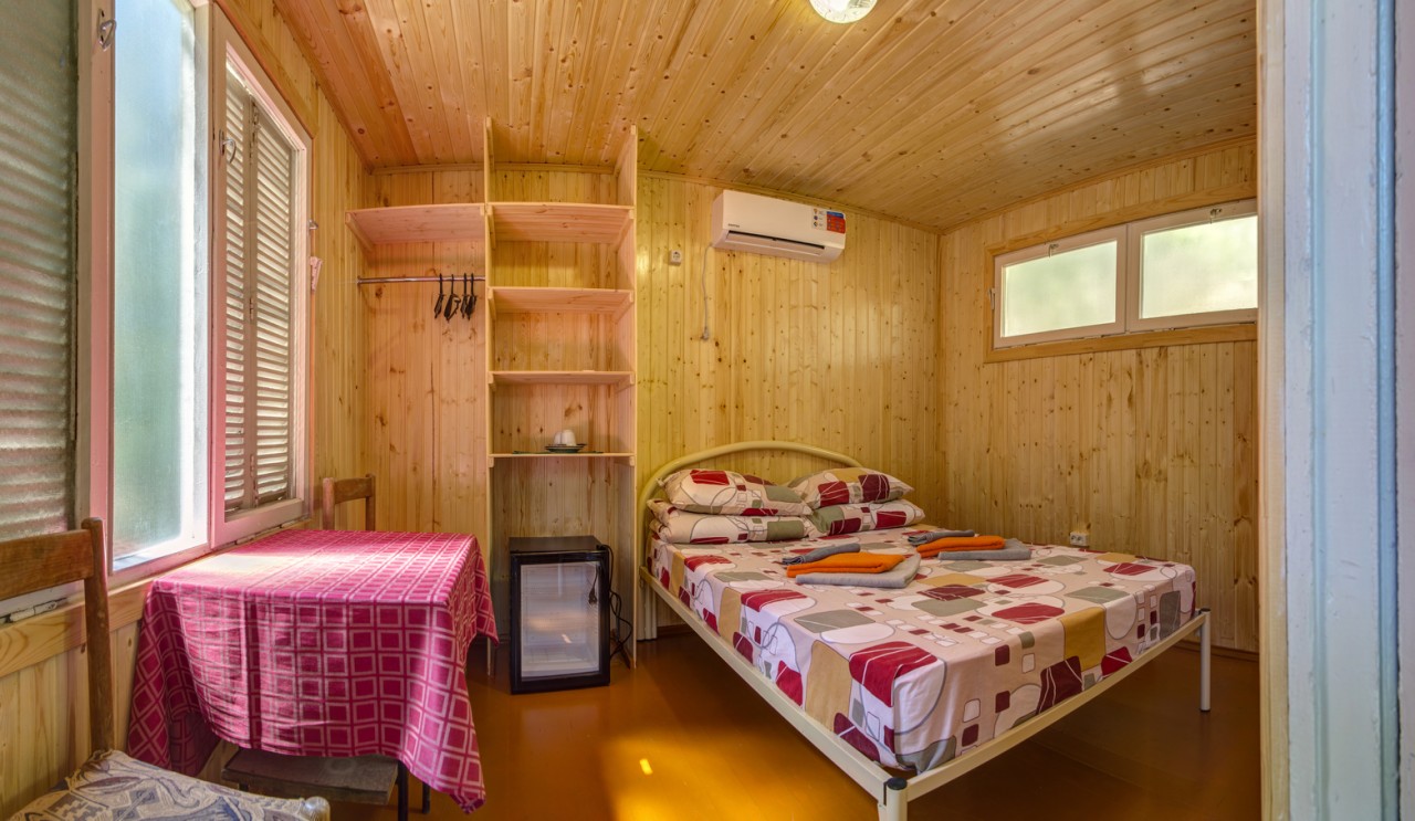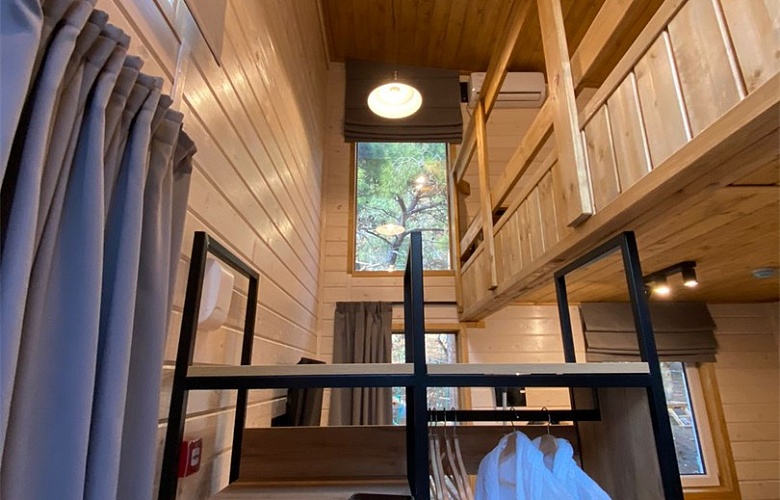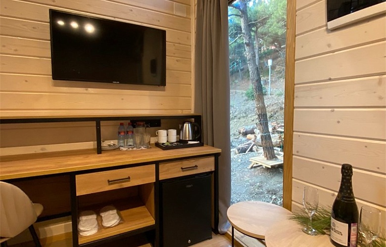 В номере: вешалка, зеркало, кровать двуспальная, кровать двухъярусная, прикроватные тумбочки, стулья, шкаф, кондиционер, мини-холодильник, набор посуды, телевизор ЖК, электрочайник