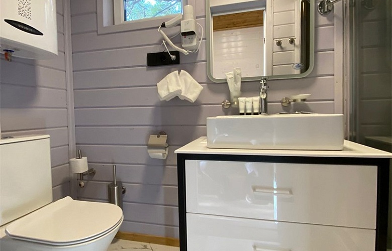 Санузел: бойлер, с душем, туалетные принадлежности, фен, халат