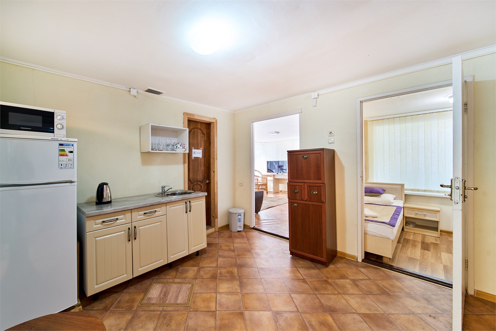 В номере: вешалка, зеркало, кресло-кровать, кровати односпальные /одна двуспальная кровать, кровать односпальная, кровать полутороспальная, кухонная мебель, прикроватные тумбочки, стол, стулья, шкаф, кондиционер, сейф, телевизор, телефон, холодильник, чайный набор посуды, электрочайник