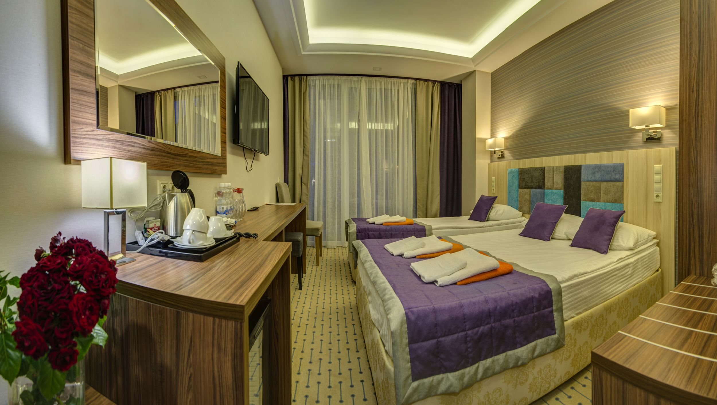 В номере: вешалка, диван, зеркало, кровати односпальные /одна двуспальная кровать, прикроватные тумбочки, столик журнальный, стулья, шкаф встроенный, кондиционер, мини-холодильник, телевизор ЖК, чайный набор посуды, электрочайник