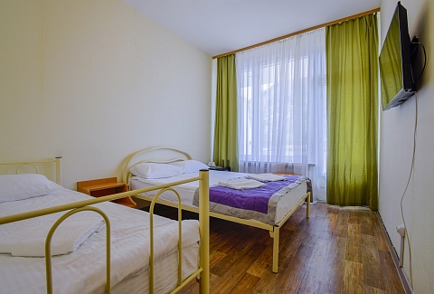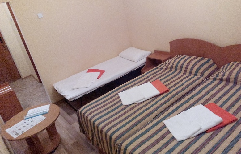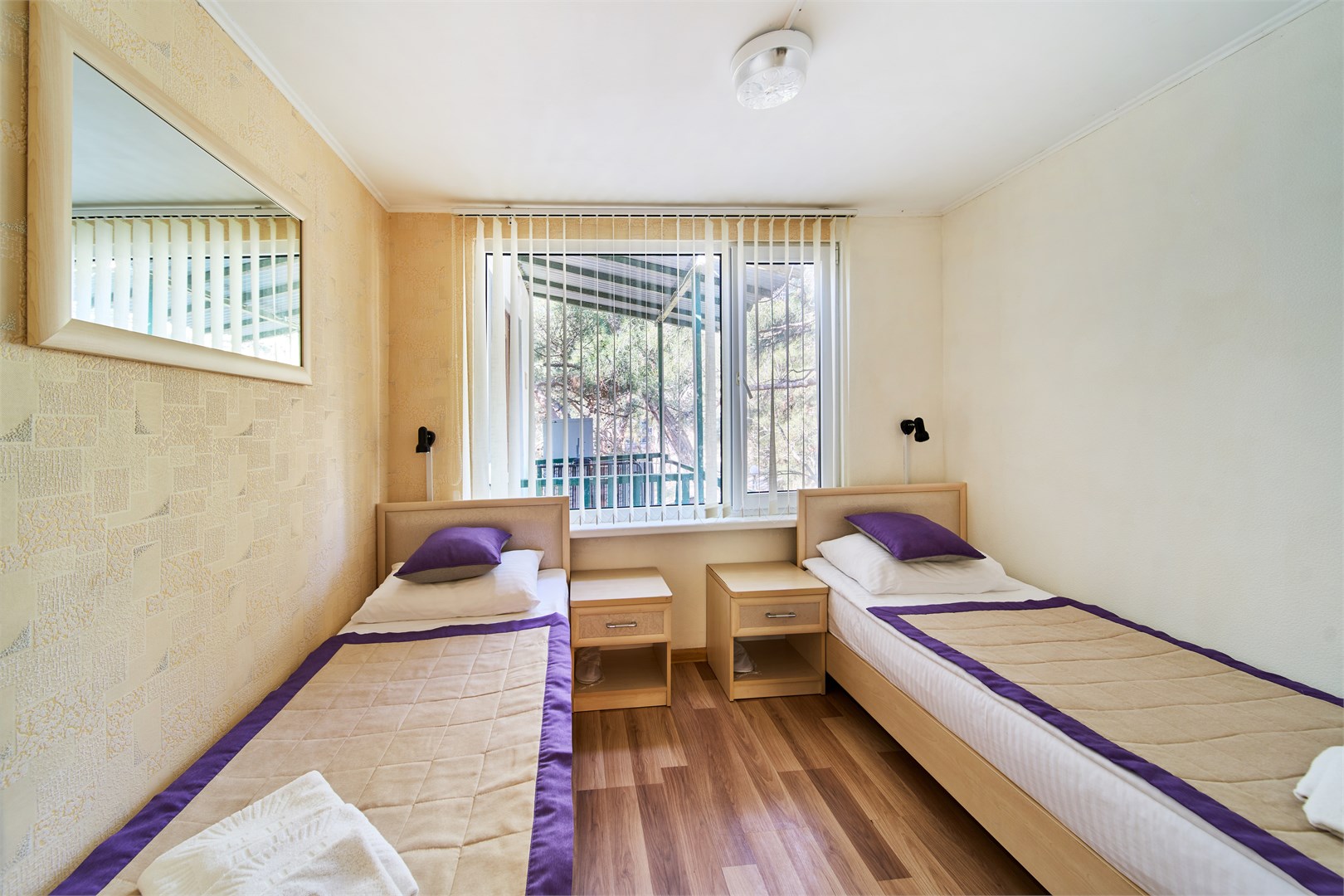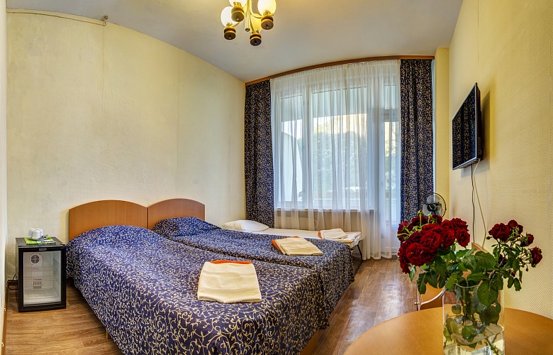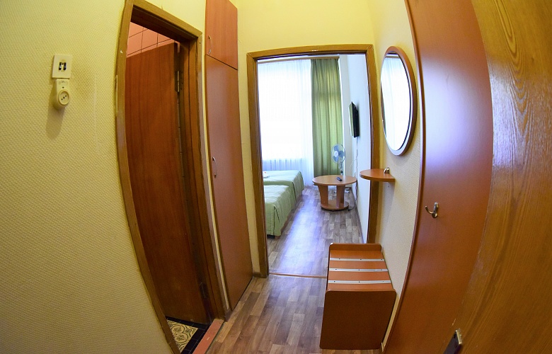 В номере: вешалка, диван раскладной, зеркало, кровати односпальные, прикроватные тумбочки, стол, стулья, шкаф встроенный, кондиционер, сейф, телевизор, телефон, холодильник, чайный набор посуды, электрочайник