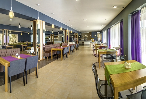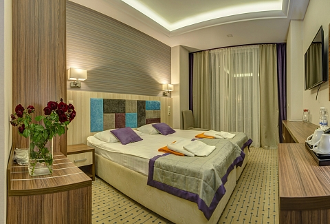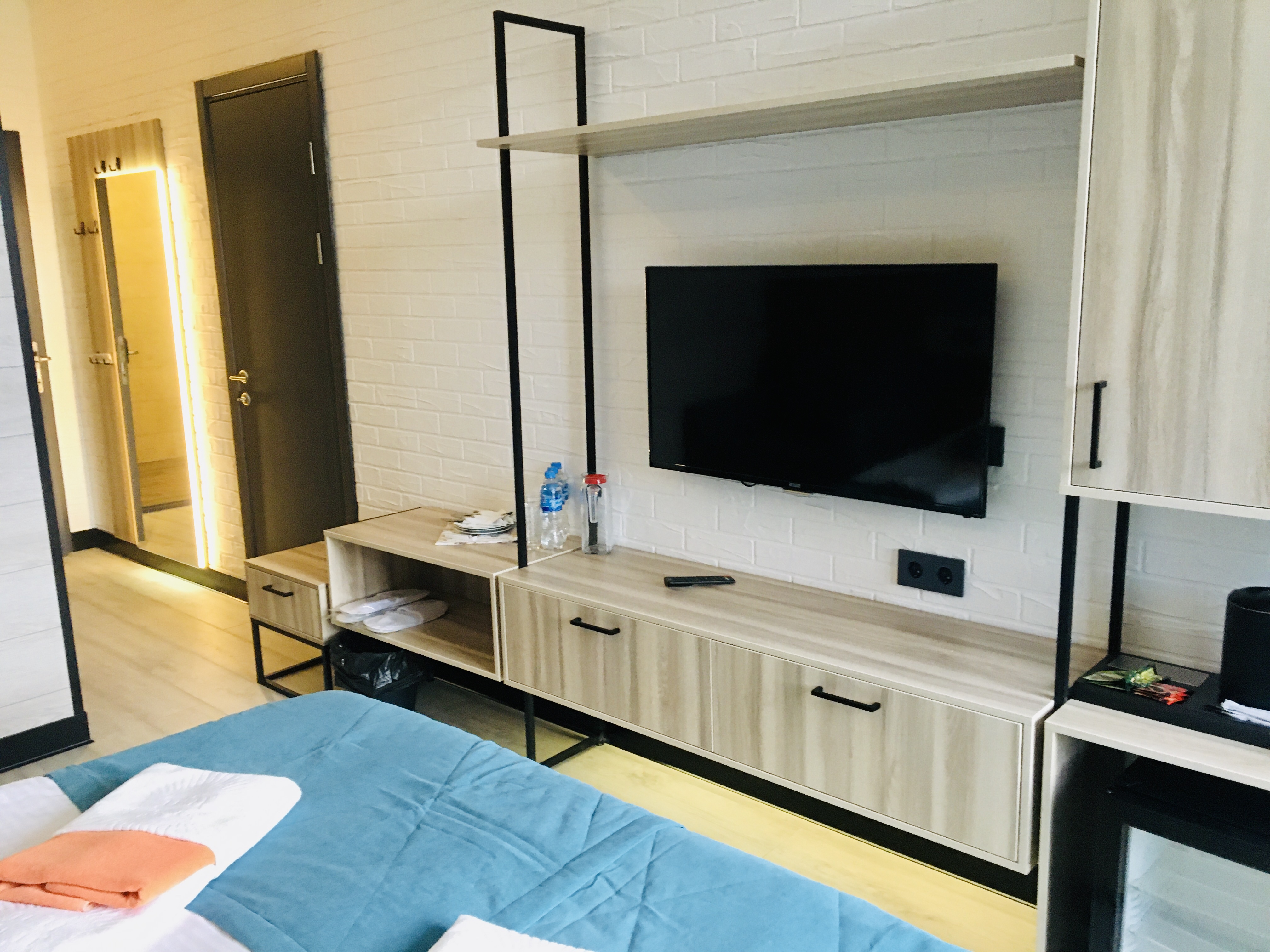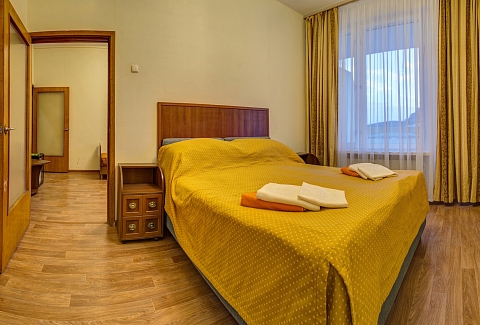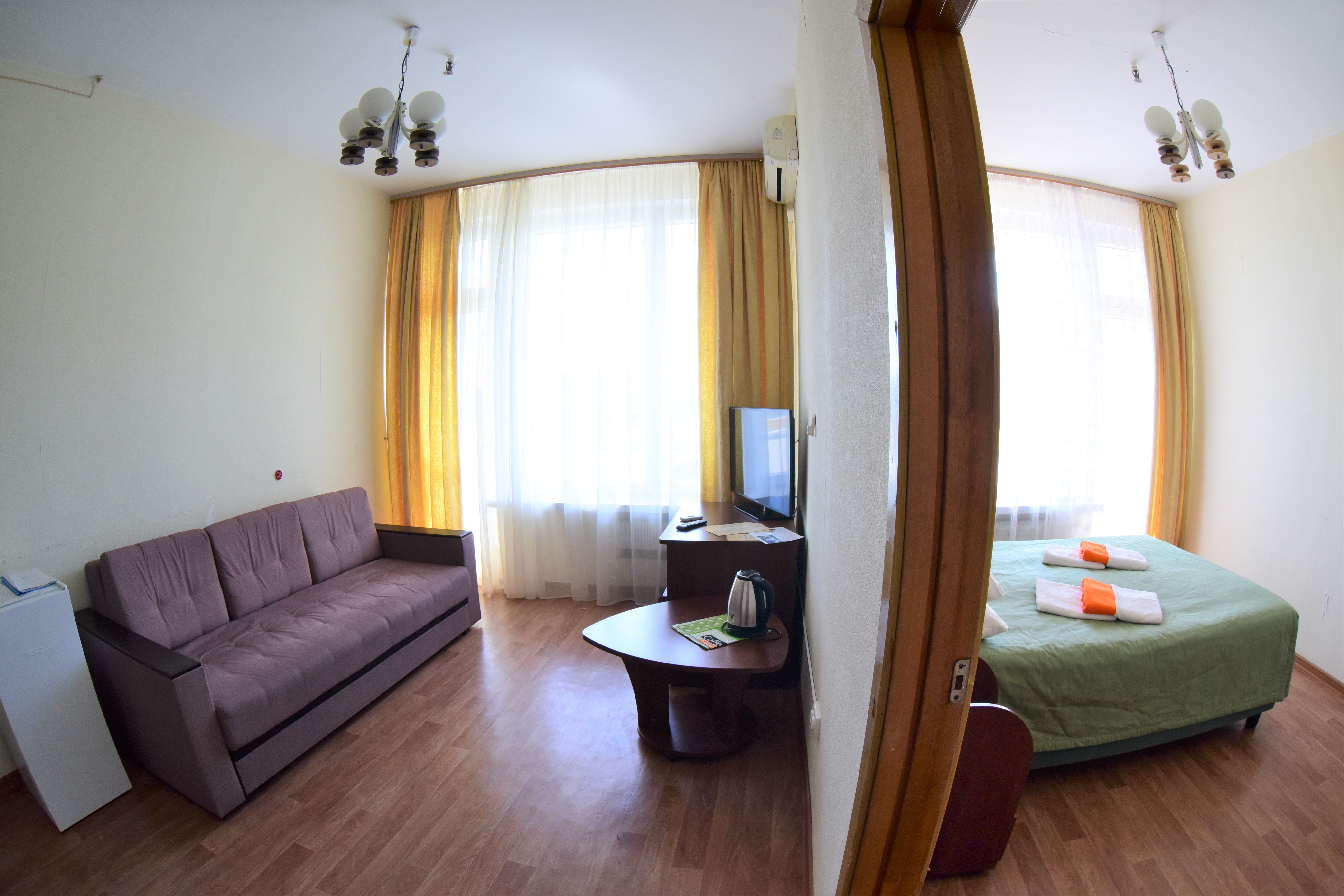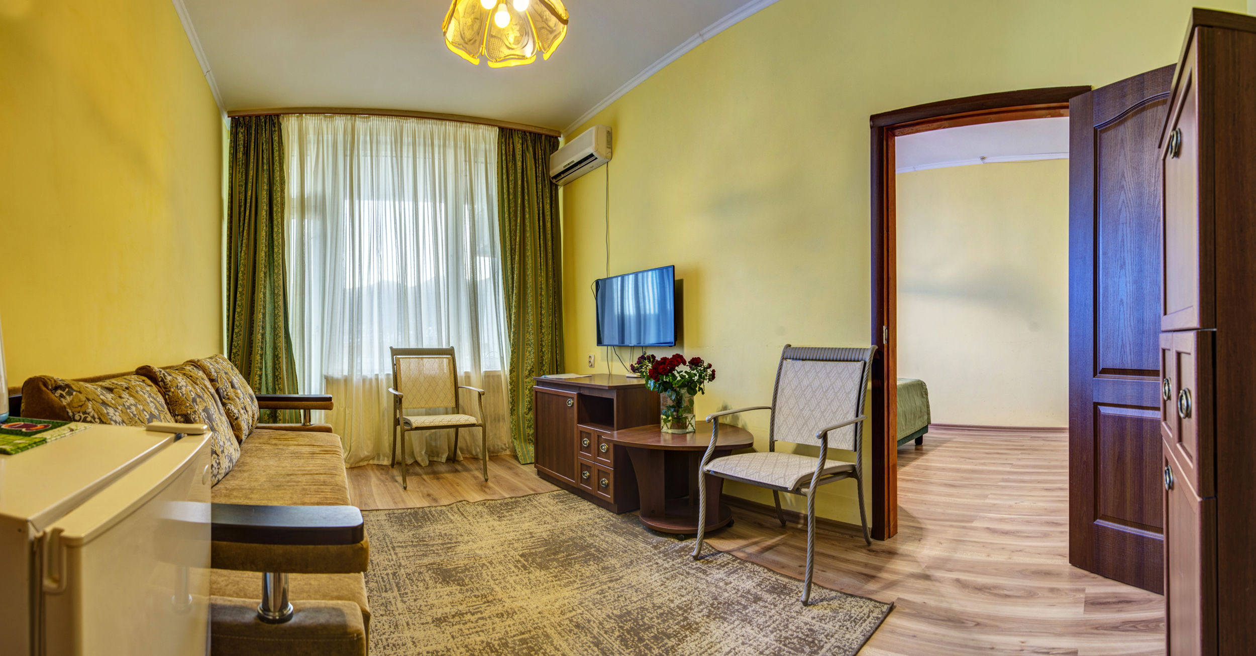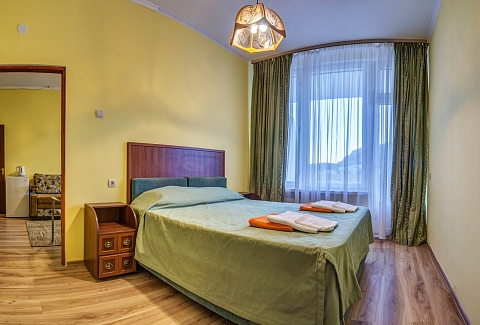 В номере: вешалка, диван, зеркало, кровать двуспальная, стол, столик журнальный, стулья, тумба, шкаф, кондиционер, набор посуды, сейф, телевизор, холодильник, электрочайник