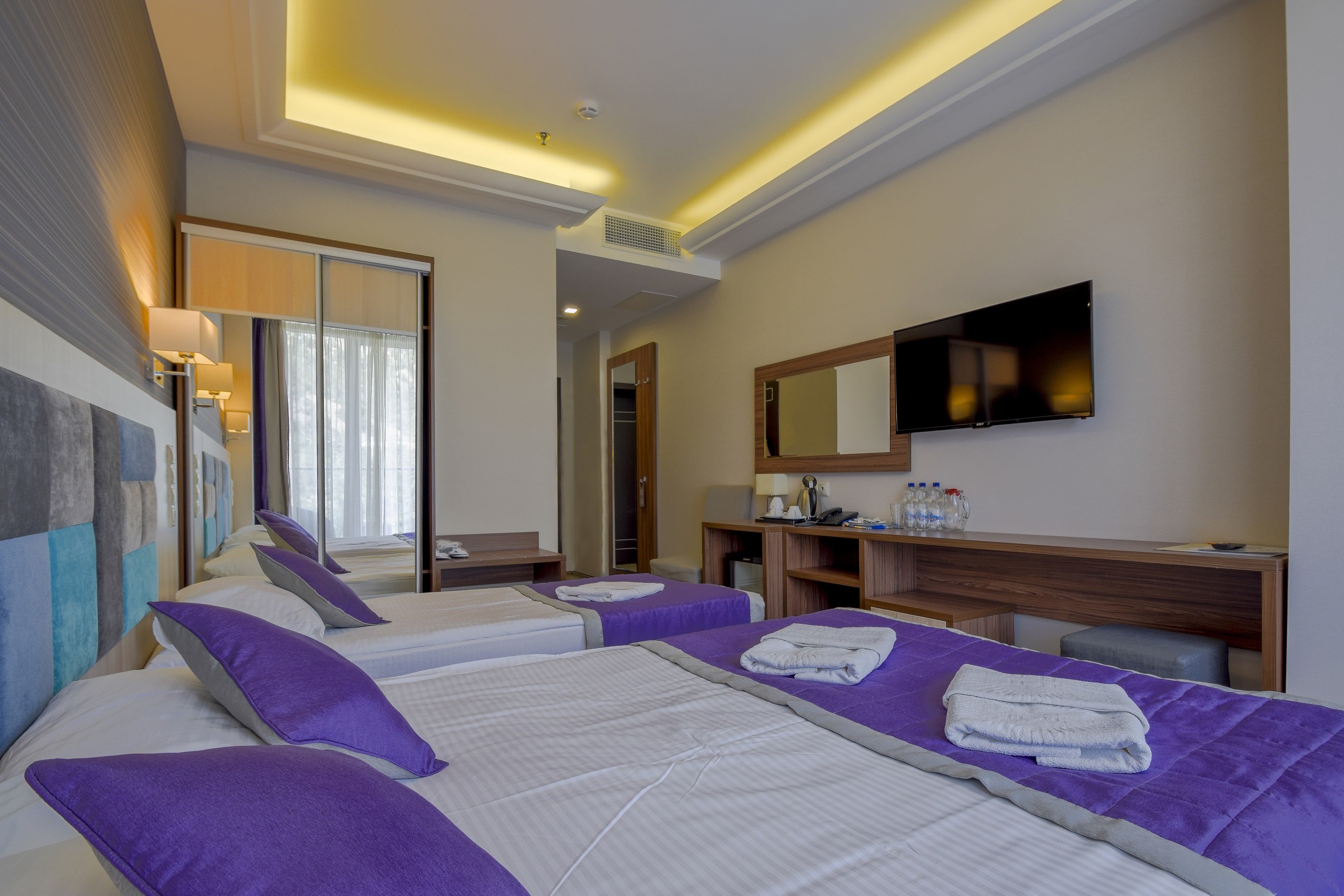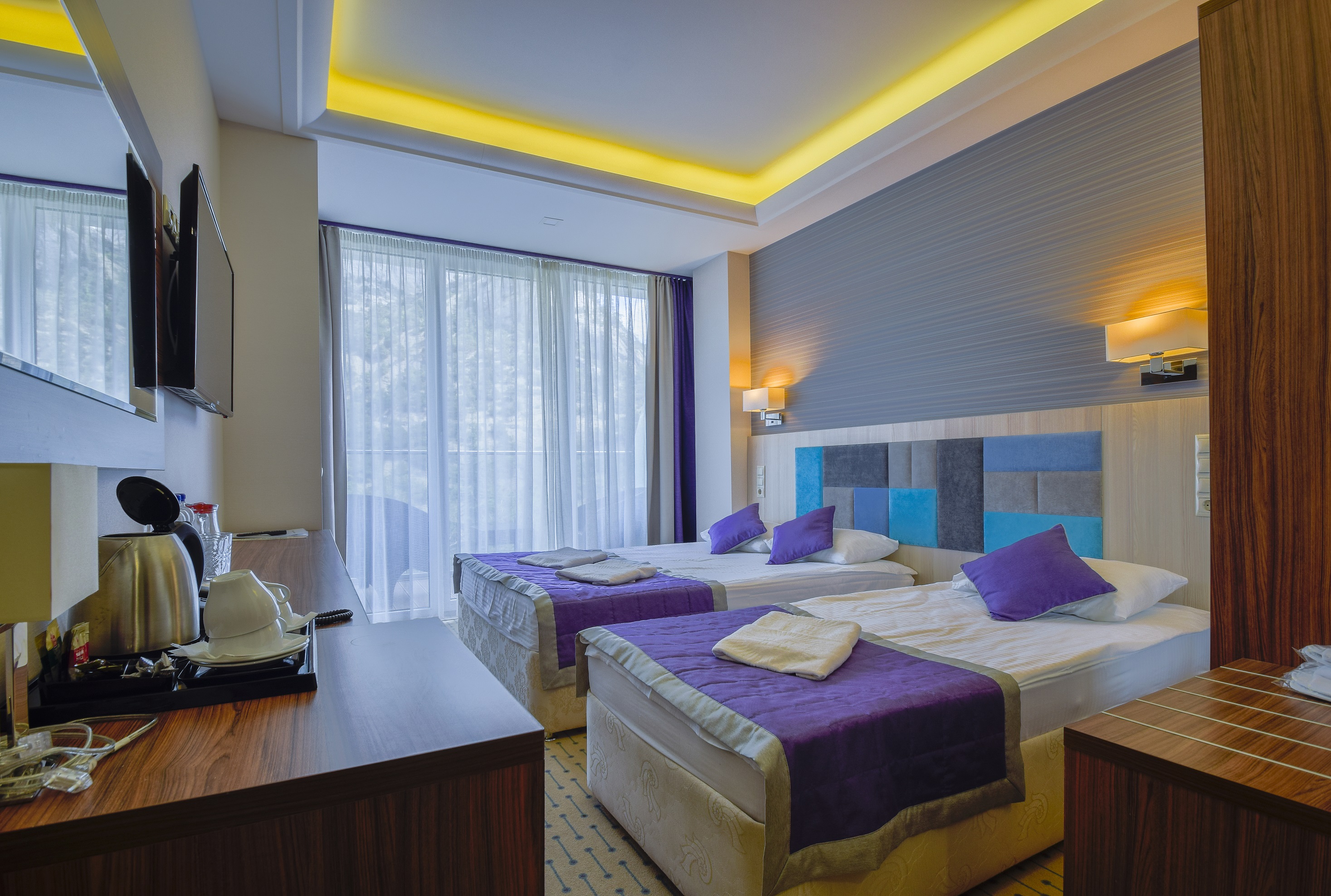 В номере: вешалка, зеркало, кровати односпальные /одна двуспальная кровать, прикроватные тумбочки, стол, стул, шкаф, кондиционер, сейф, телевизор, телефон, холодильник, чайный набор посуды, электрочайник