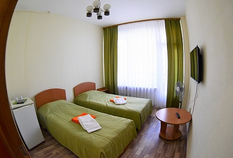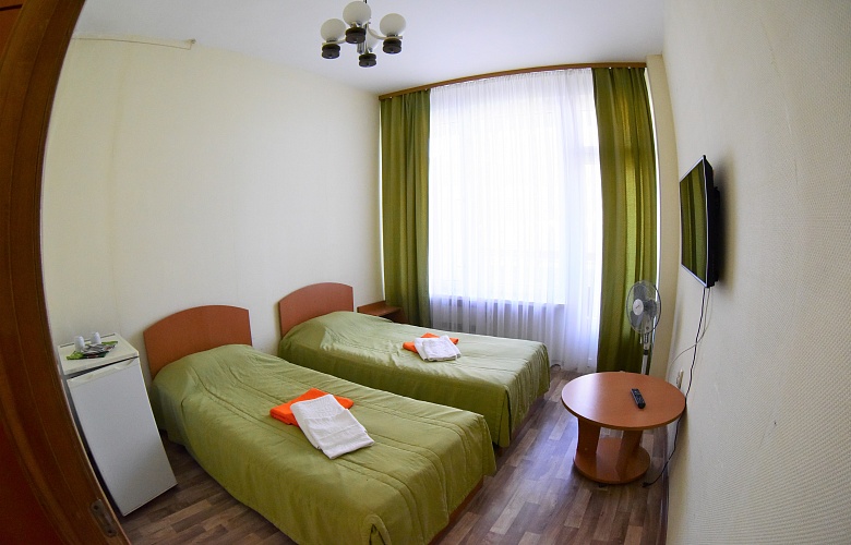 В номере: вешалка, зеркало, кровати односпальные, прикроватные тумбочки, стол, стулья, шкаф, вентилятор, мини-холодильник, набор посуды, телевизор ЖК