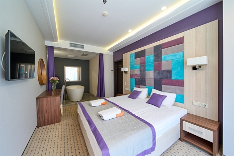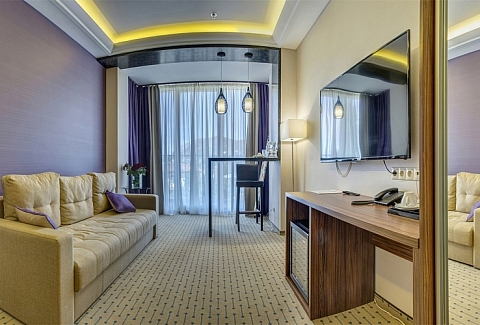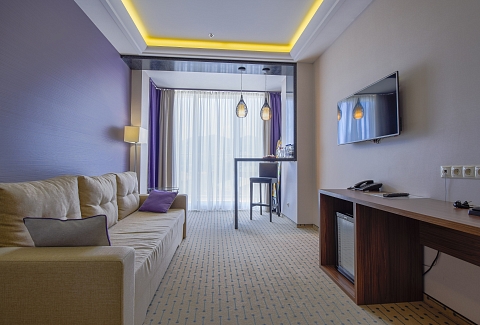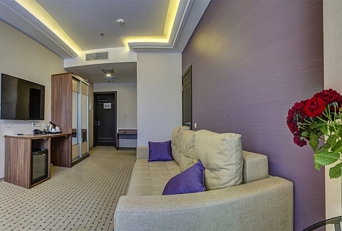 В номере: вешалка, диван, зеркало, кровать двуспальная, прикроватные тумбочки, стол, столик журнальный, стулья, тумба, шкаф, кондиционер, сейф, телевизор, холодильник, электрочайник