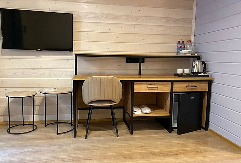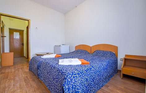 В номере: вешалка, зеркало, кровать двуспальная, кровать двухъярусная, кровать односпальная, прикроватные тумбочки, столик журнальный, стулья, тумба, шкаф, кондиционер, холодильник, чайный набор посуды, электрочайник