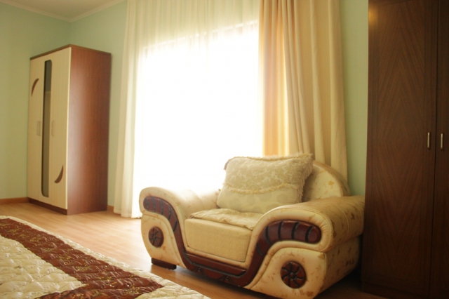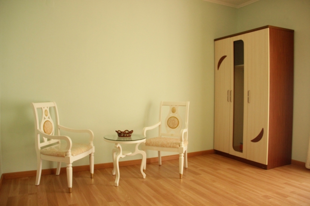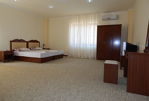 В номере: вешалка, диван, зеркало, кресло, кровать двуспальная, прикроватные тумбочки, стол, стулья, шкаф, кондиционер, телевизор, холодильник