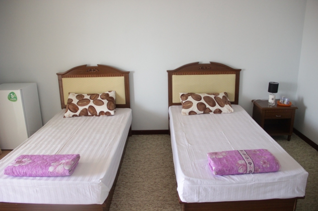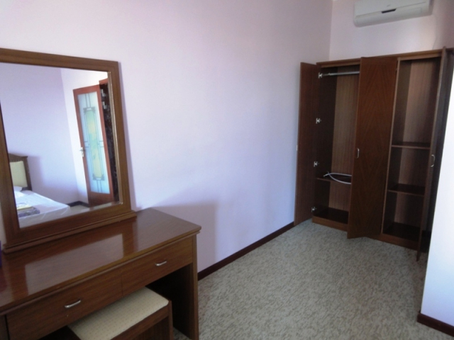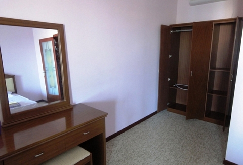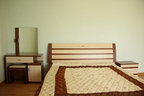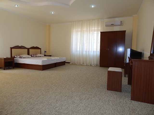 В номере: кровать двуспальная, прикроватные тумбочки, стол, стул, шкаф, кондиционер, телевизор, холодильник