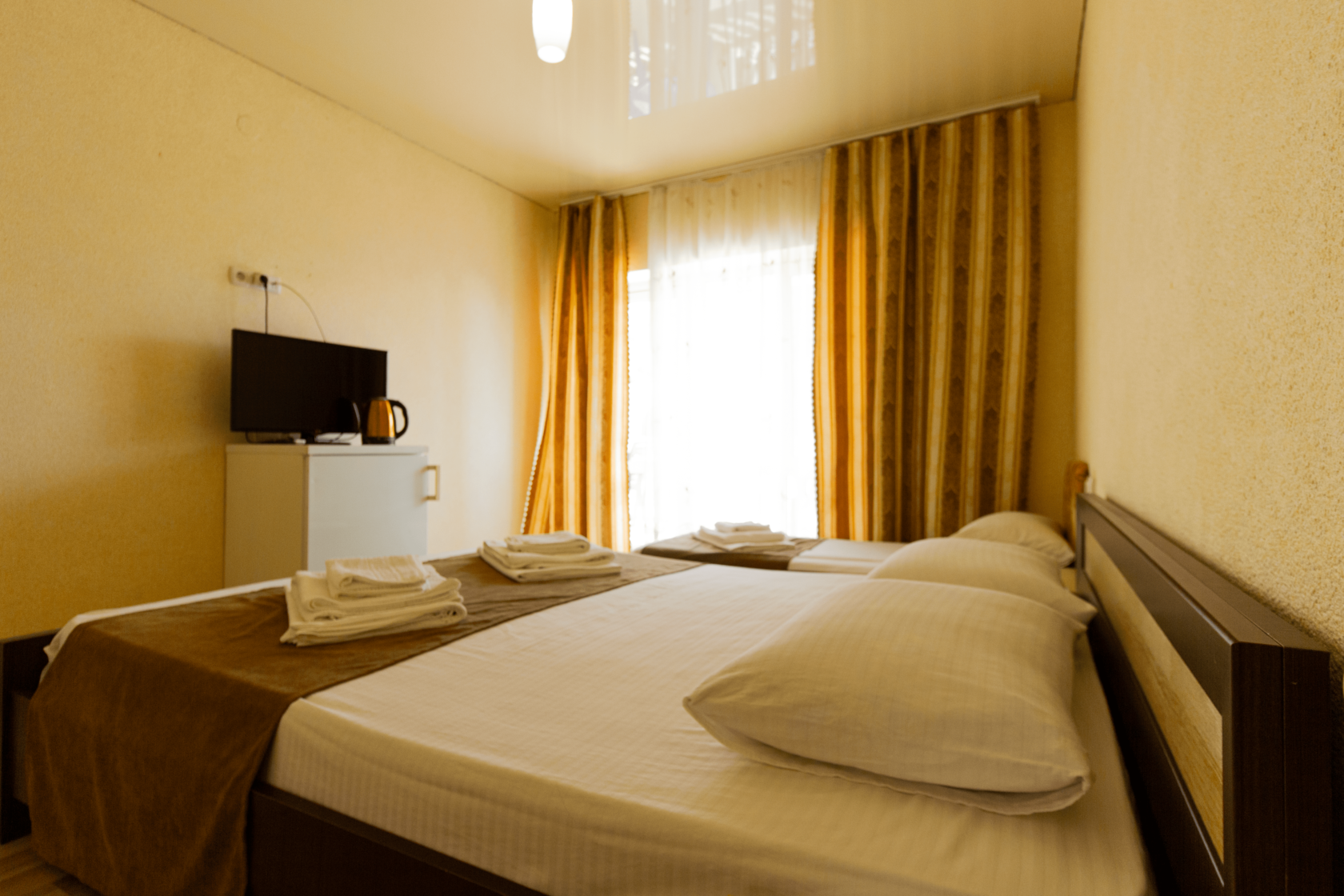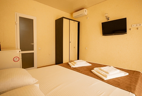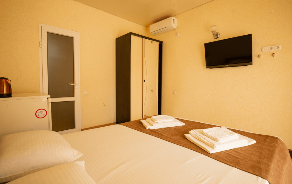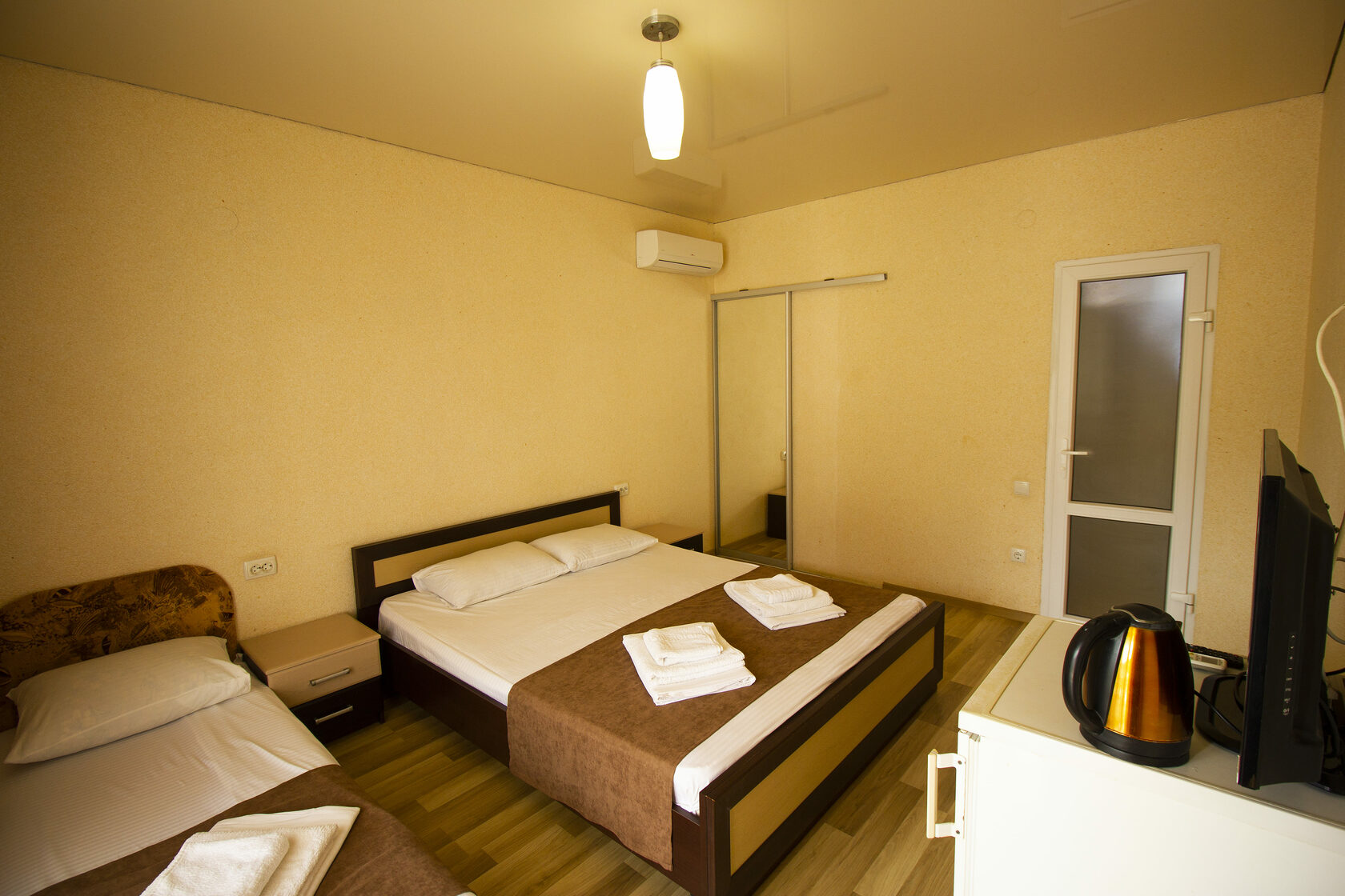 В номере: вешалка, зеркало, кровать двуспальная, кровать односпальная, прикроватные тумбочки, шкаф, кондиционер, телевизор, холодильник, чайный набор посуды, электрочайник
