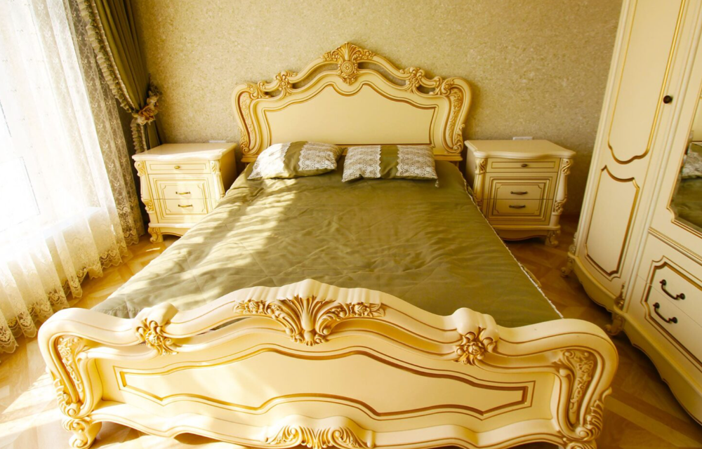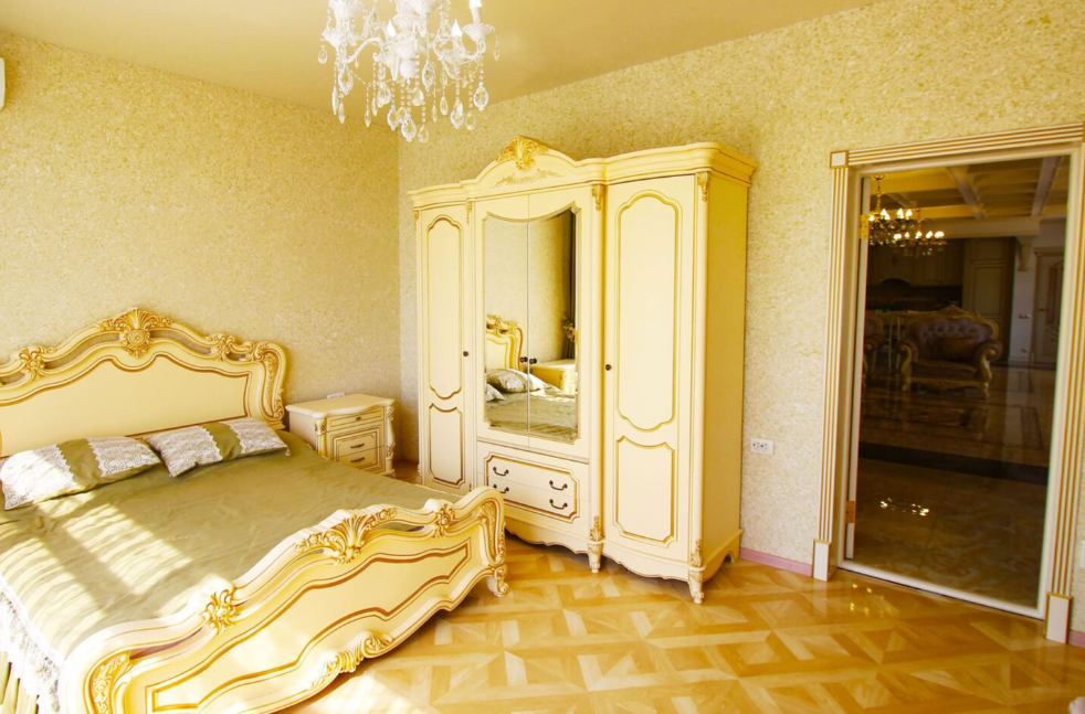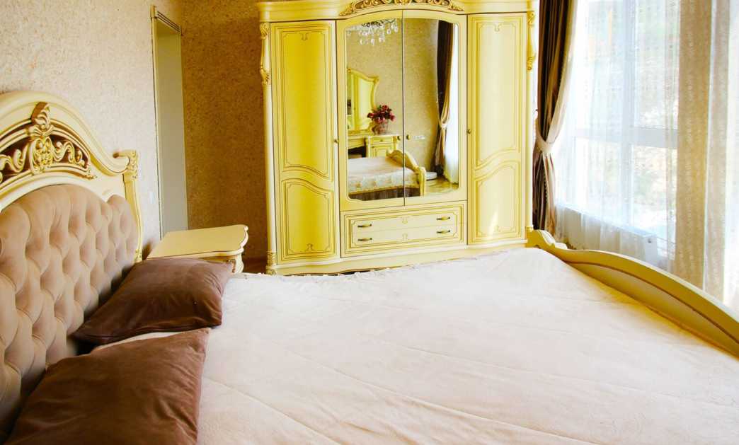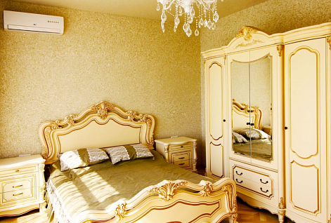 В номере: вешалка, диван, зеркало, кресла, кровать двуспальная, кухонная мебель, прикроватные тумбочки, стол, стулья, тумба, шкаф, кондиционер, микроволновая печь, набор посуды, плита электрическая, стиральная машина, телевизор, холодильник, чайный набор посуды, электрочайник