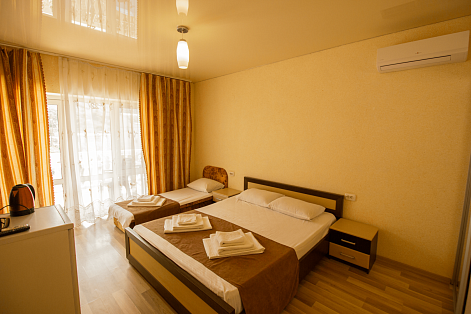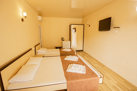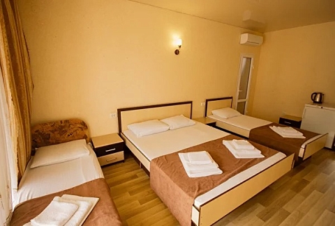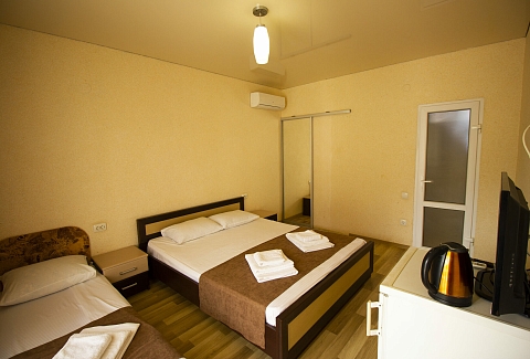 В номере: вешалка, зеркало, кровати односпальные, кровать двуспальная, прикроватные тумбочки, шкаф, кондиционер, телевизор, холодильник, чайный набор посуды, электрочайник