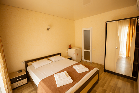В номере: вешалка, зеркало, кровать двуспальная, прикроватные тумбочки, шкаф, кондиционер, телевизор, холодильник, чайный набор посуды, электрочайник
