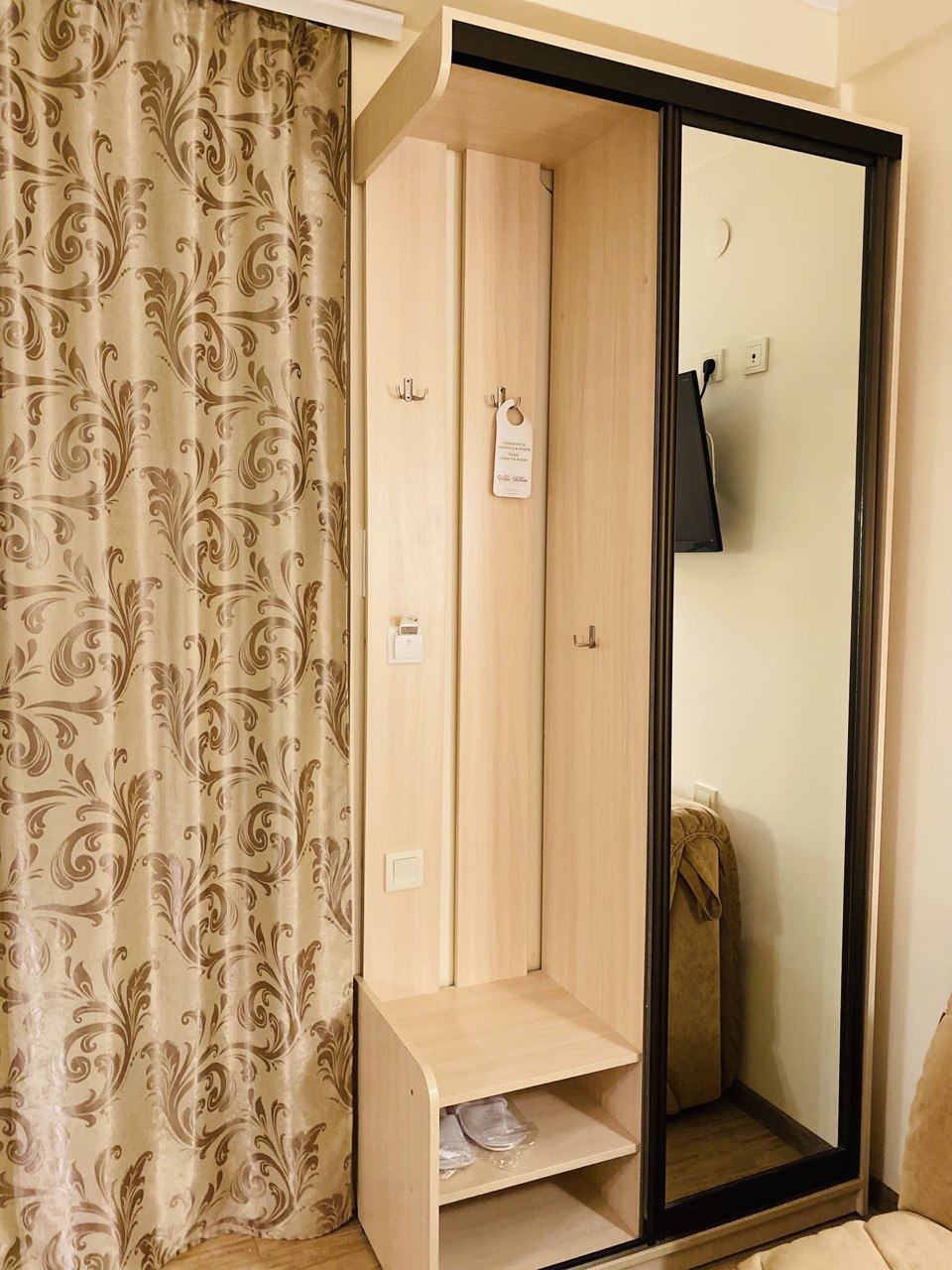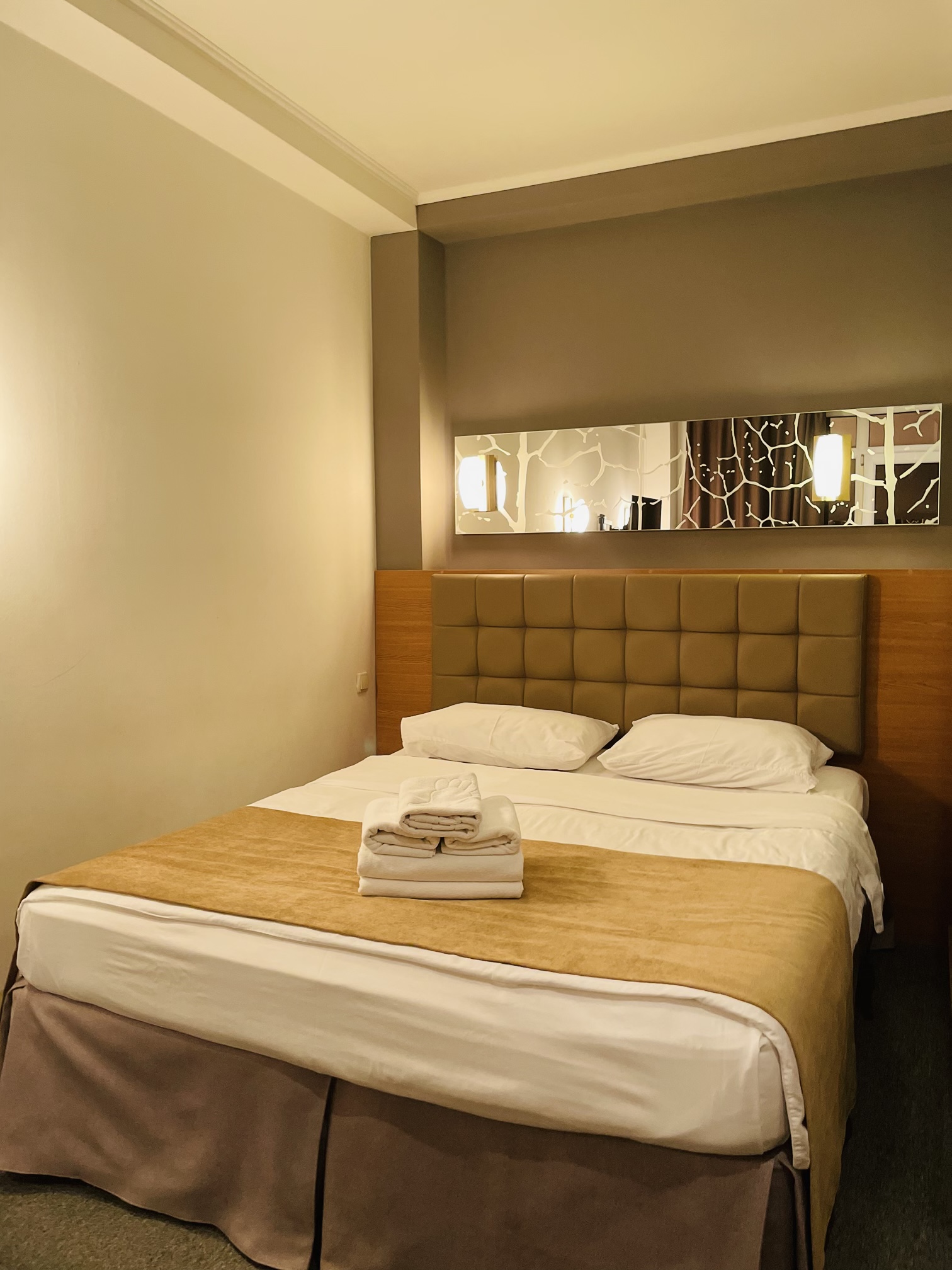 В номере: вешалка, зеркало, кровать двуспальная, прикроватные тумбочки, столик журнальный, столик туалетный, стул, шкаф, кондиционер, сейф, телевизор, холодильник, чайный набор посуды, электрочайник