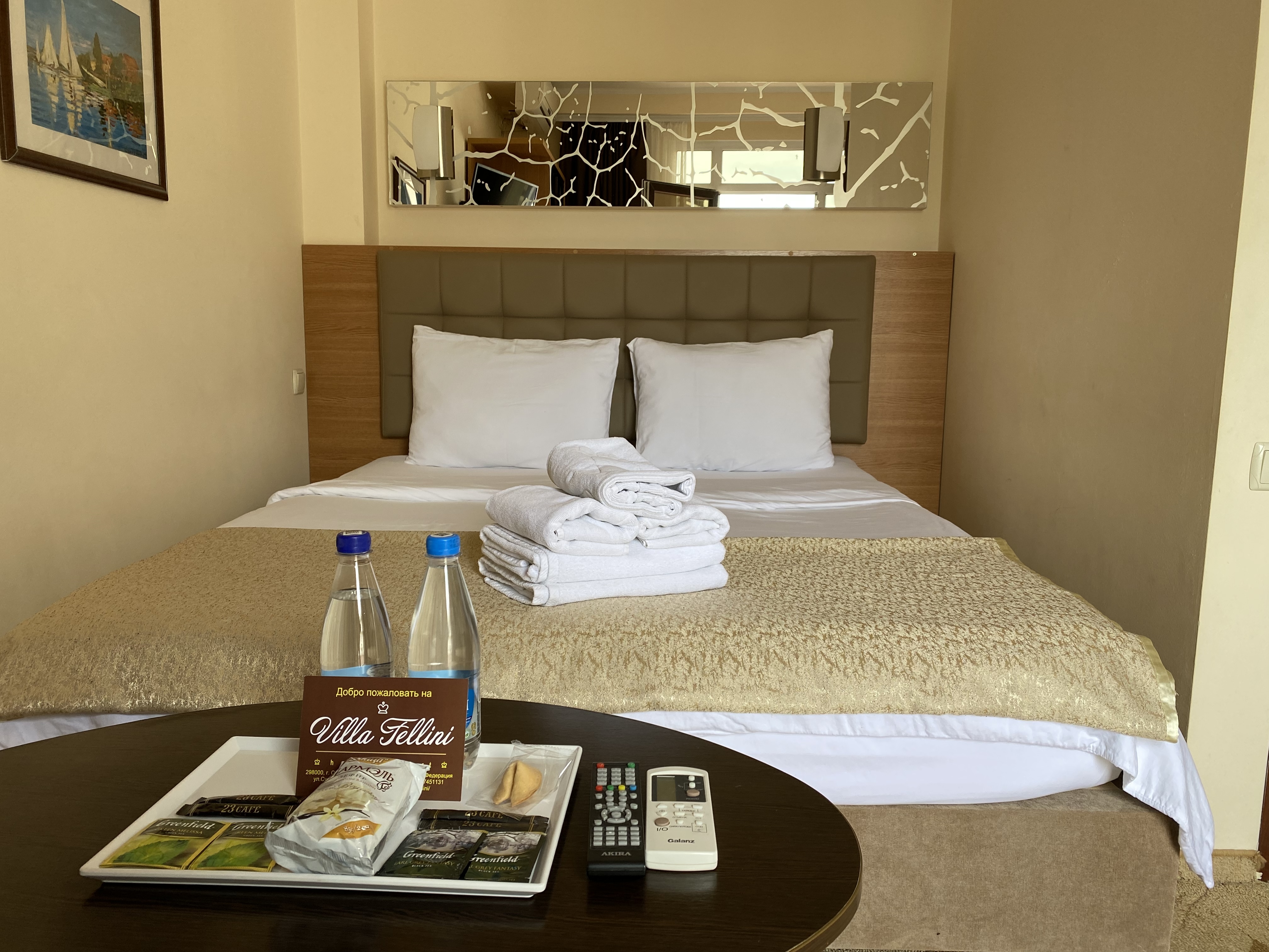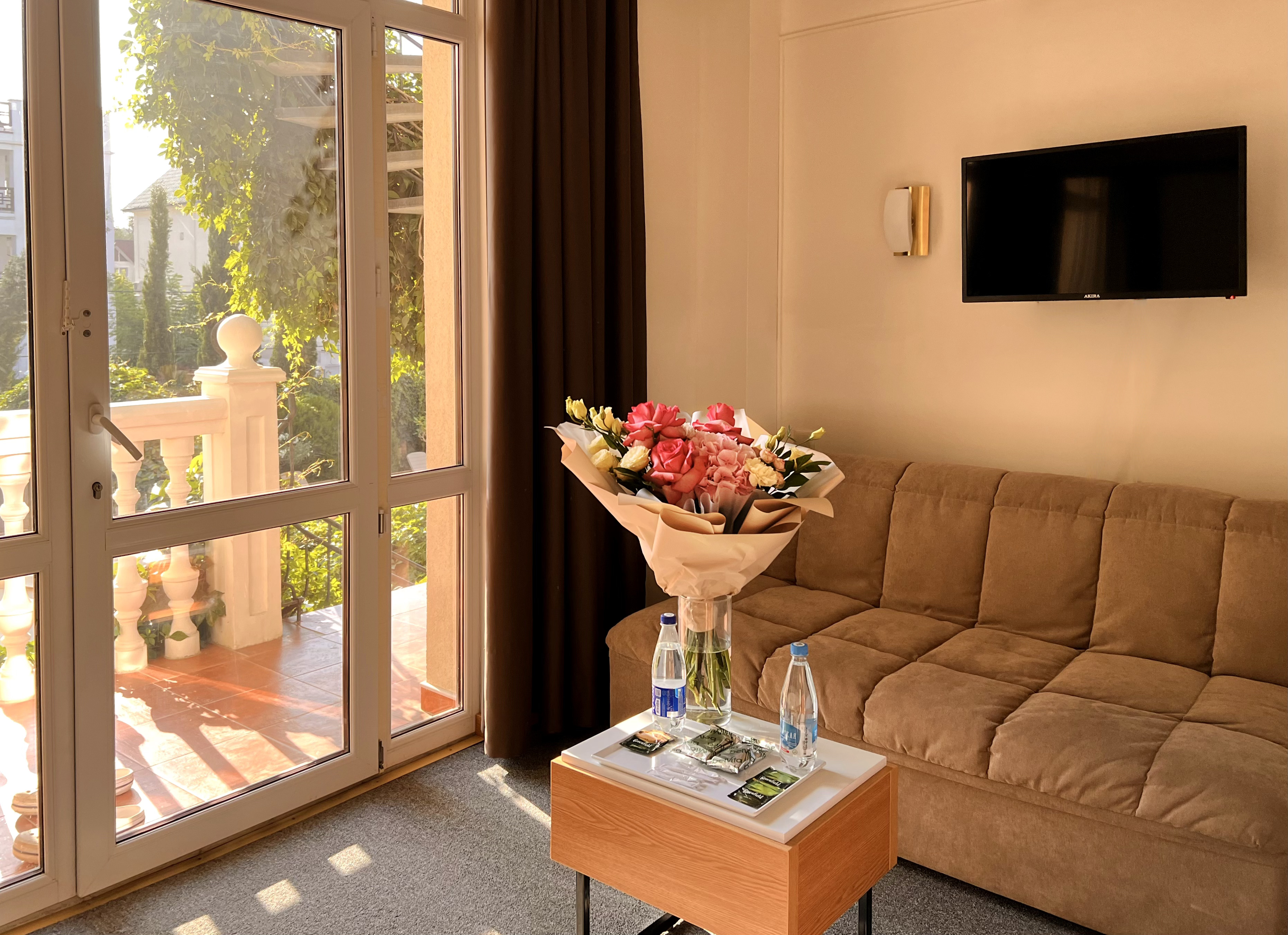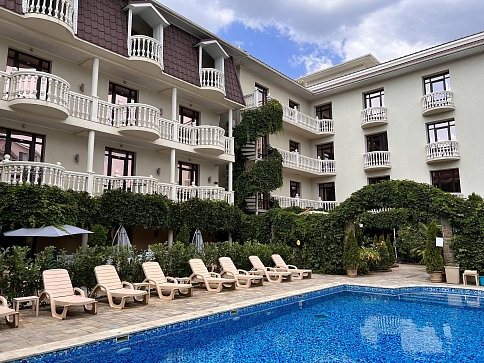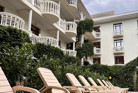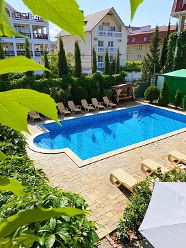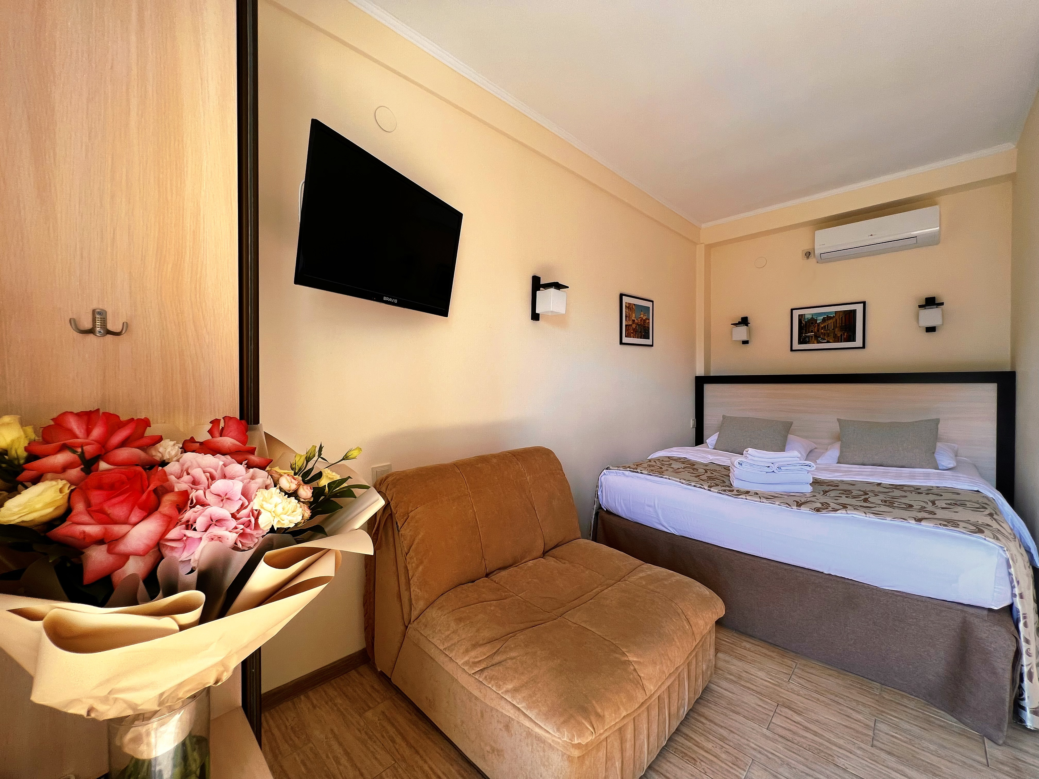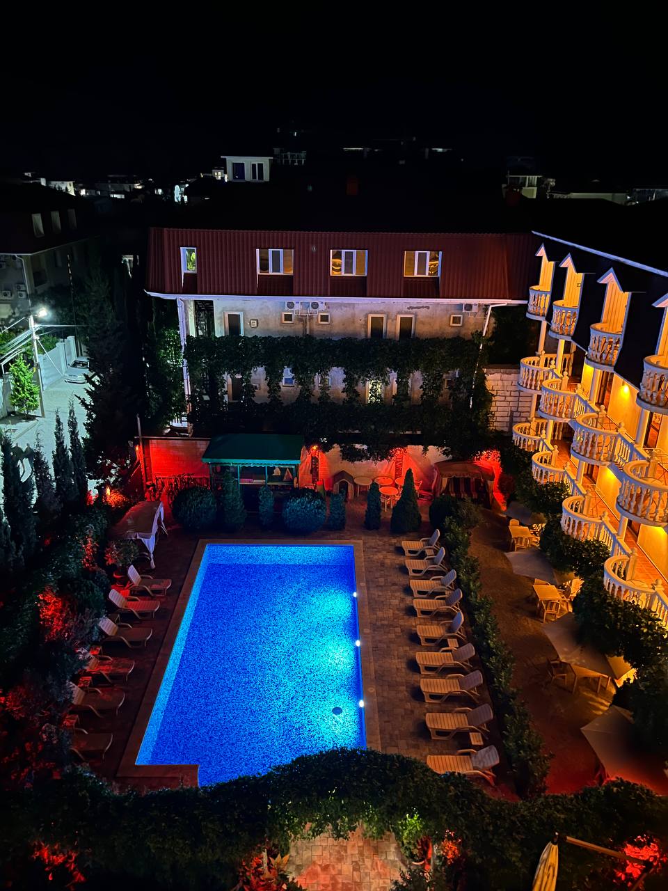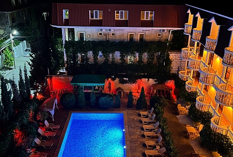Гостей ожидают комфортабельные уютные номера разной категории, в том числе Люксы и Апартаменты. Все номера оснащены ванной комнатой, кондиционером и укомплектованы бытовой техникой — везде есть плазменный телевизор, фен, электрочайник.При отеле работает кафе, где отдыхающие могут заказать для себя завтраки и ужины. В распоряжении отдыхающих бассейн, обустроенная терраса для загара на крыше, доступен wi-fi, для автовладельцев организована охраняемая парковка. Гости могут арендовать на ресепшене велосипеды для прогулок по городу.В 600 м от отеля разместился городской песчано-галечный пляж. На побережье установлены раздевалки, навесы, работают кафе, есть пункт проката шезлонгов, доступны водные и пляжных развлечений.