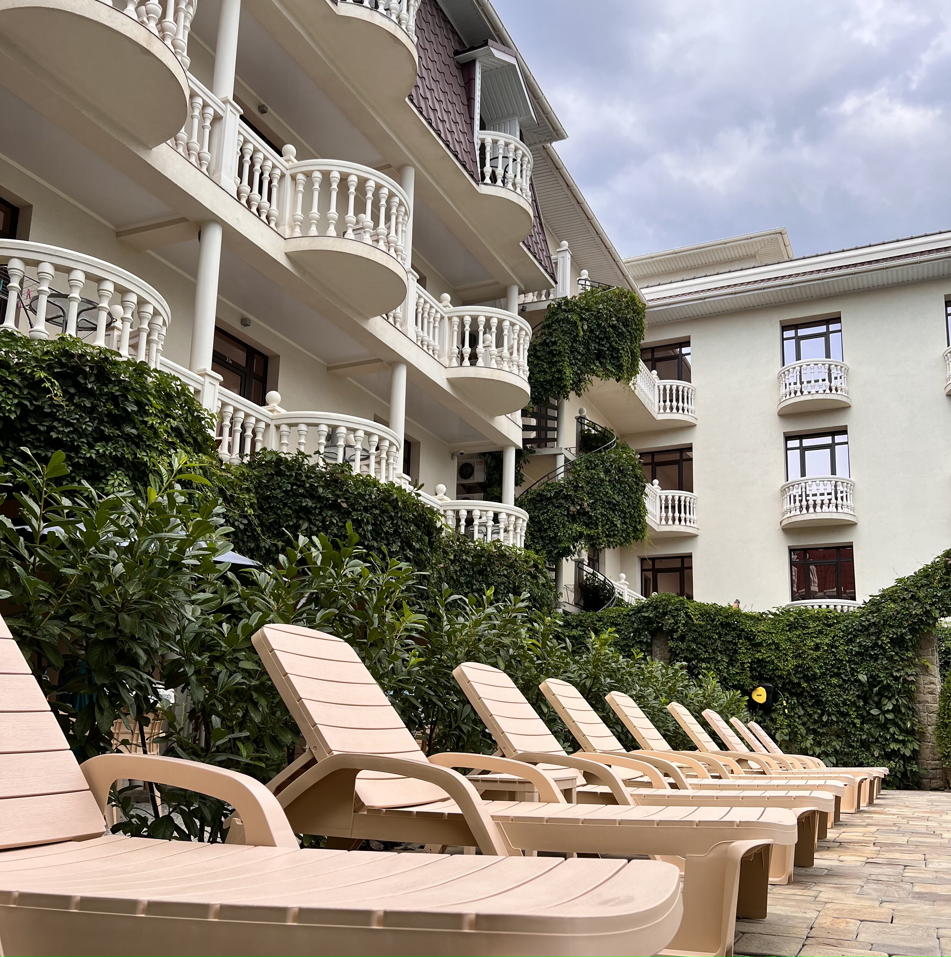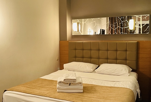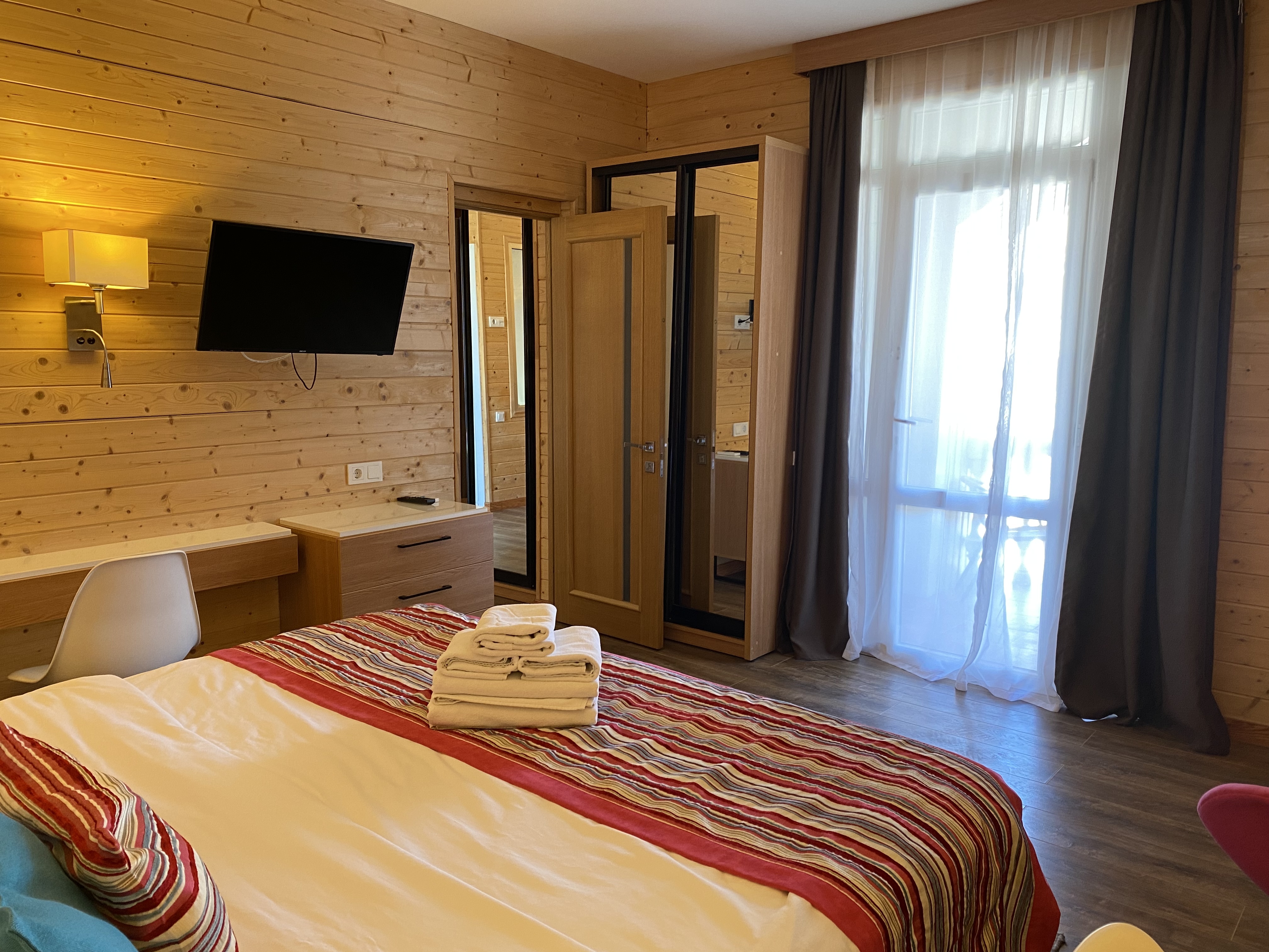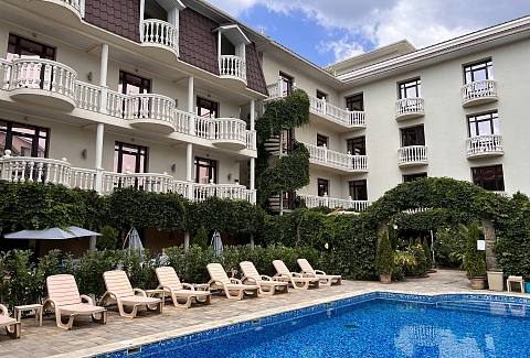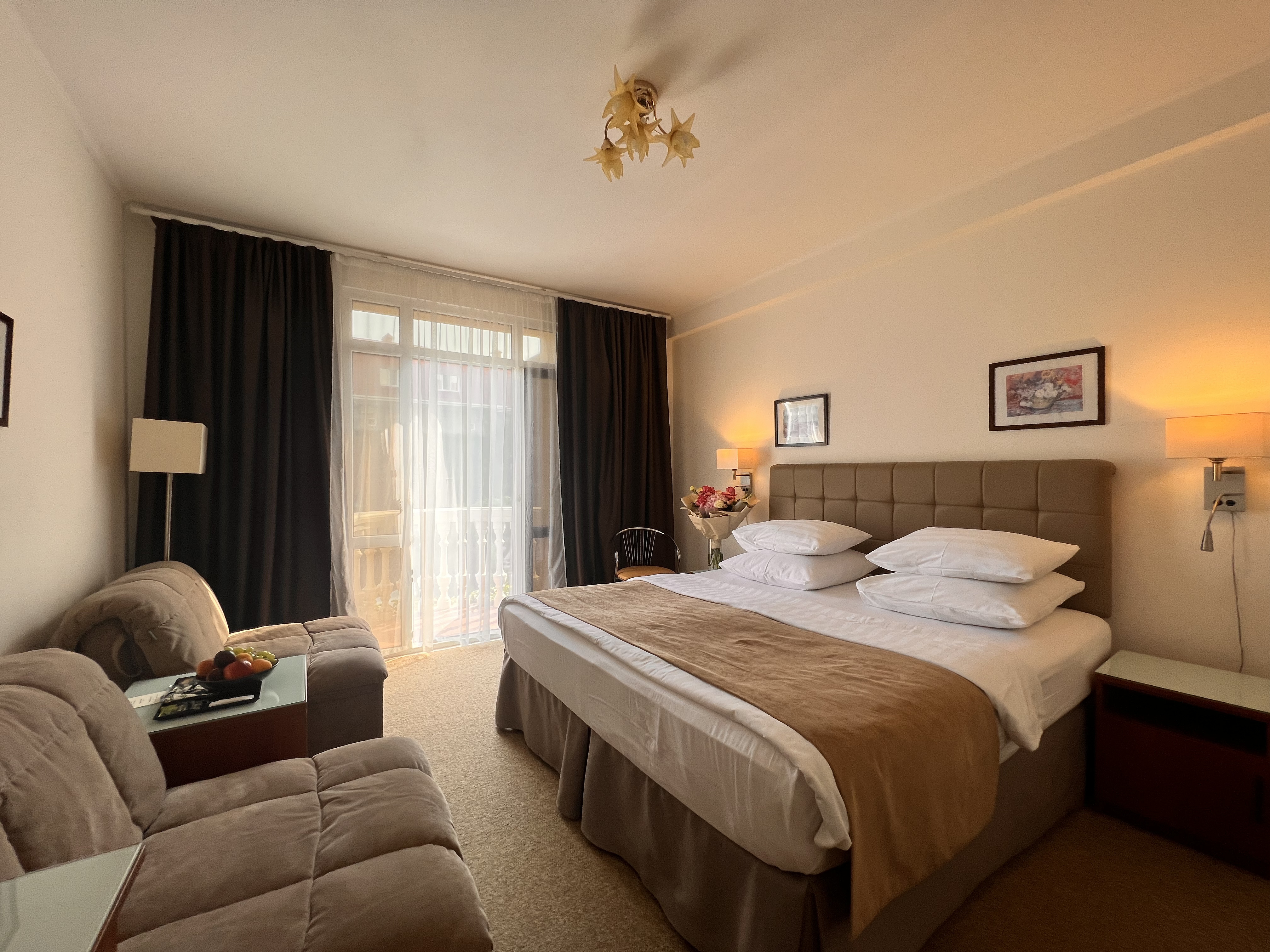 Гостей ожидают комфортабельные уютные номера разной категории, в том числе Люксы и Апартаменты. Все номера оснащены ванной комнатой, кондиционером и укомплектованы бытовой техникой — везде есть плазменный телевизор, фен, электрочайник.При отеле работает кафе, где отдыхающие могут заказать для себя завтраки и ужины. В распоряжении отдыхающих бассейн, обустроенная терраса для загара на крыше, доступен wi-fi, для автовладельцев организована охраняемая парковка. Гости могут арендовать на ресепшене велосипеды для прогулок по городу.В 600 м от отеля разместился городской песчано-галечный пляж. На побережье установлены раздевалки, навесы, работают кафе, есть пункт проката шезлонгов, доступны водные и пляжных развлечений.