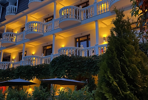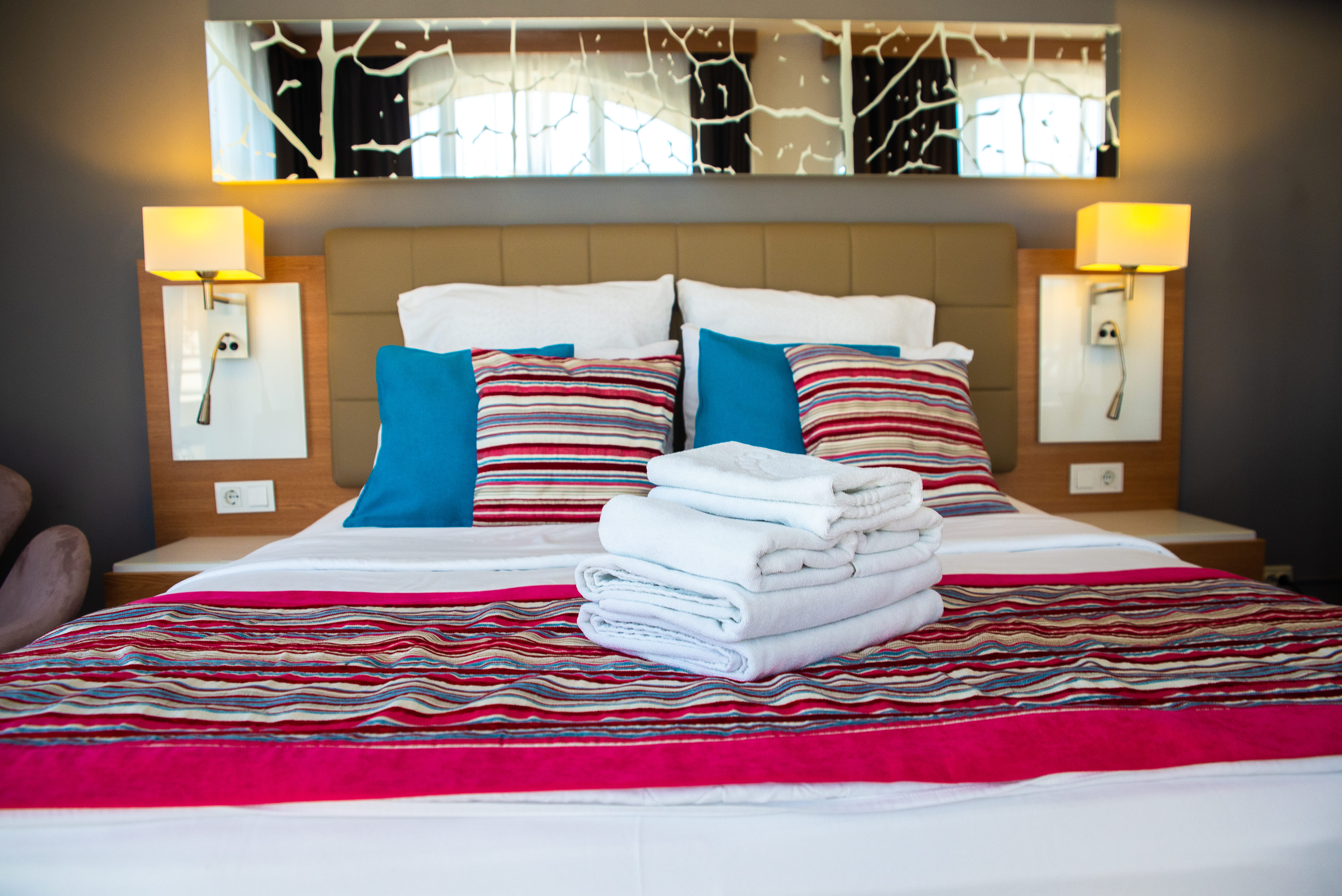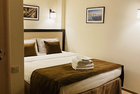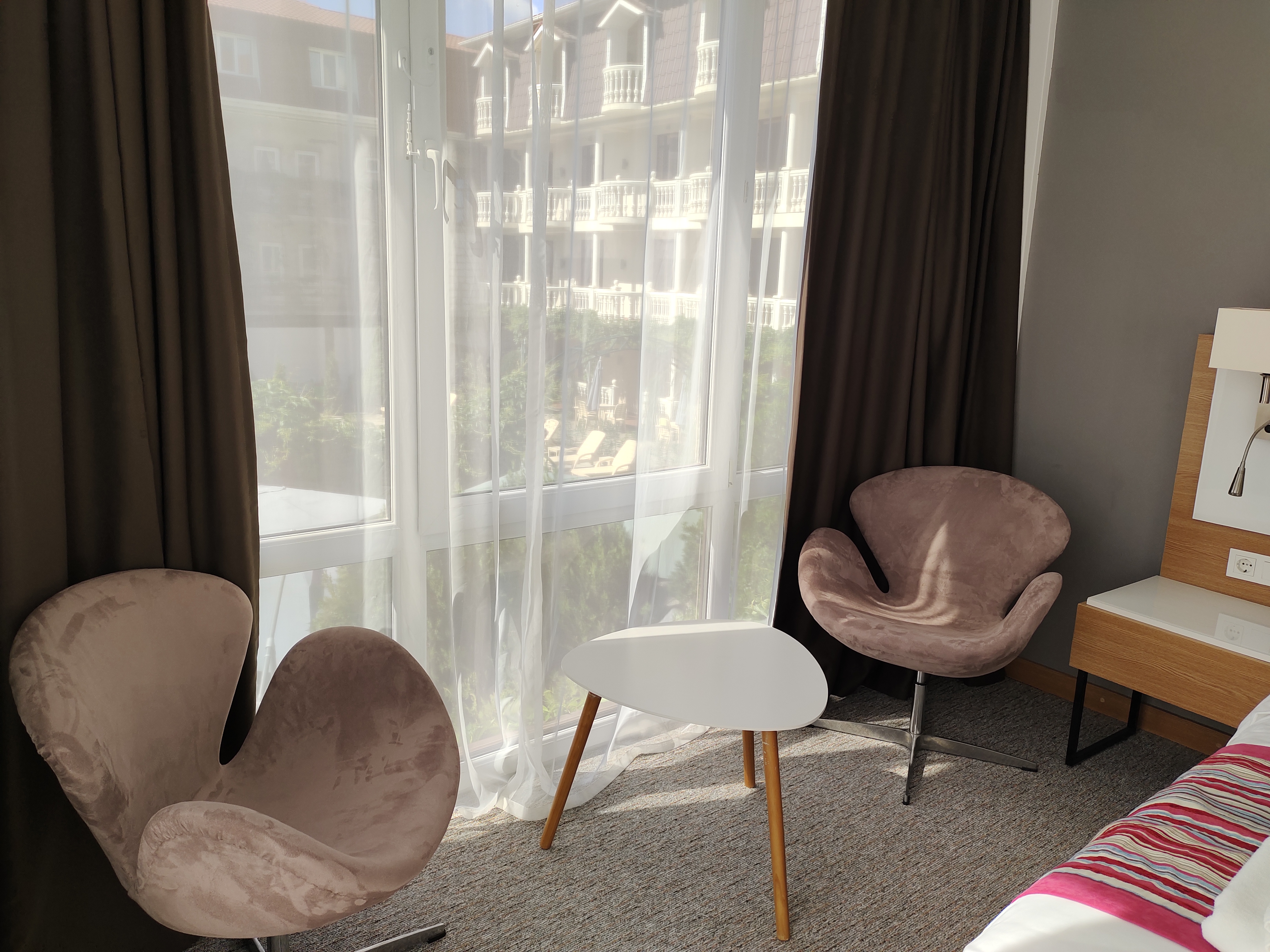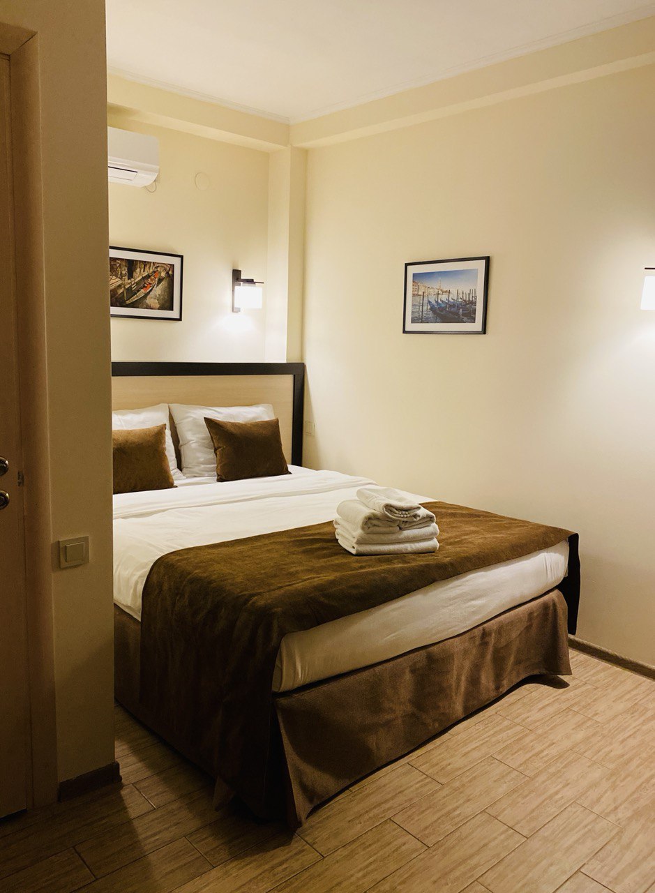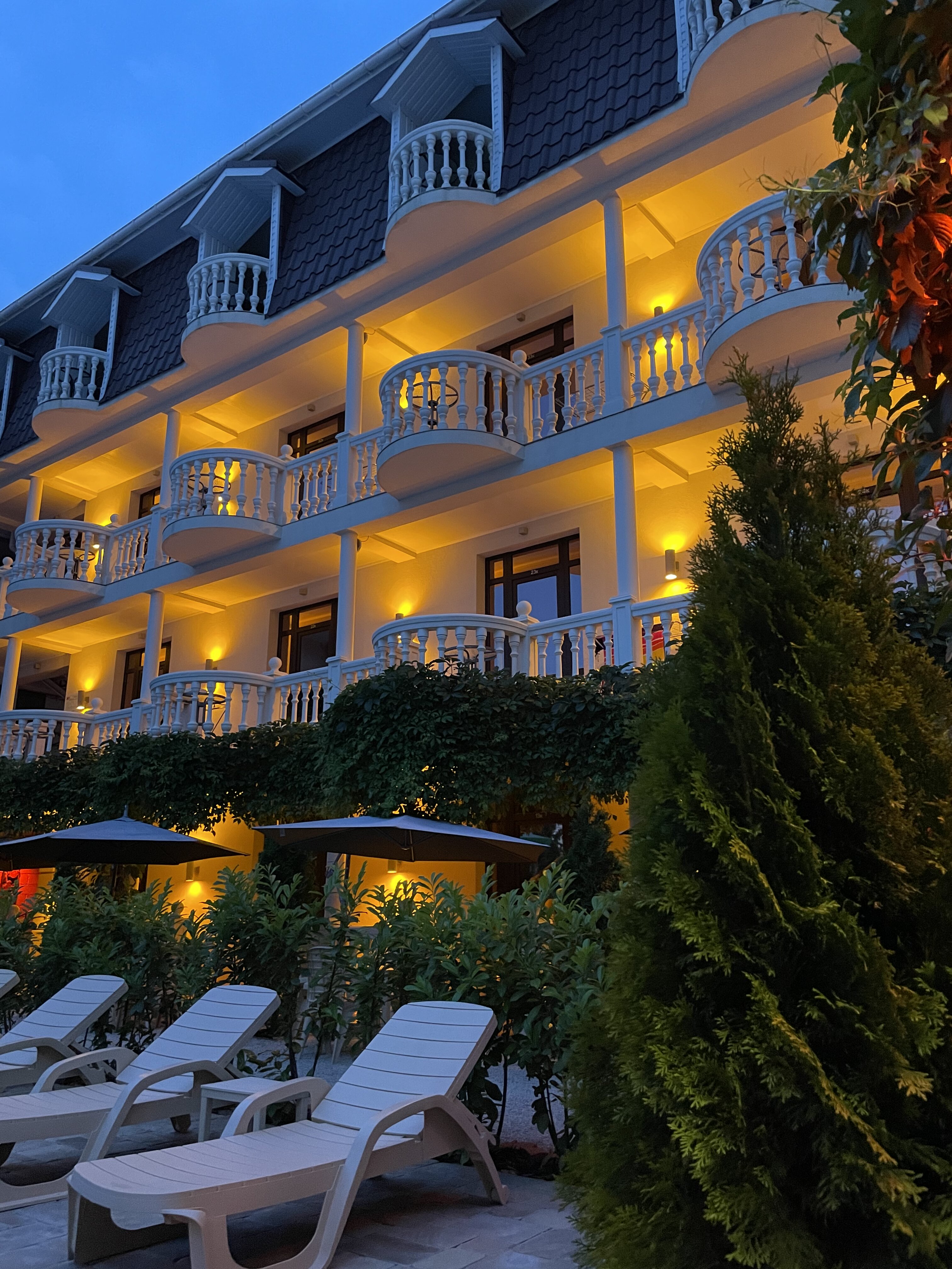 Гостей ожидают комфортабельные уютные номера разной категории, в том числе Люксы и Апартаменты. Все номера оснащены ванной комнатой, кондиционером и укомплектованы бытовой техникой — везде есть плазменный телевизор, фен, электрочайник.При отеле работает кафе, где отдыхающие могут заказать для себя завтраки и ужины. В распоряжении отдыхающих бассейн, обустроенная терраса для загара на крыше, доступен wi-fi, для автовладельцев организована охраняемая парковка. Гости могут арендовать на ресепшене велосипеды для прогулок по городу.В 600 м от отеля разместился городской песчано-галечный пляж. На побережье установлены раздевалки, навесы, работают кафе, есть пункт проката шезлонгов, доступны водные и пляжных развлечений.