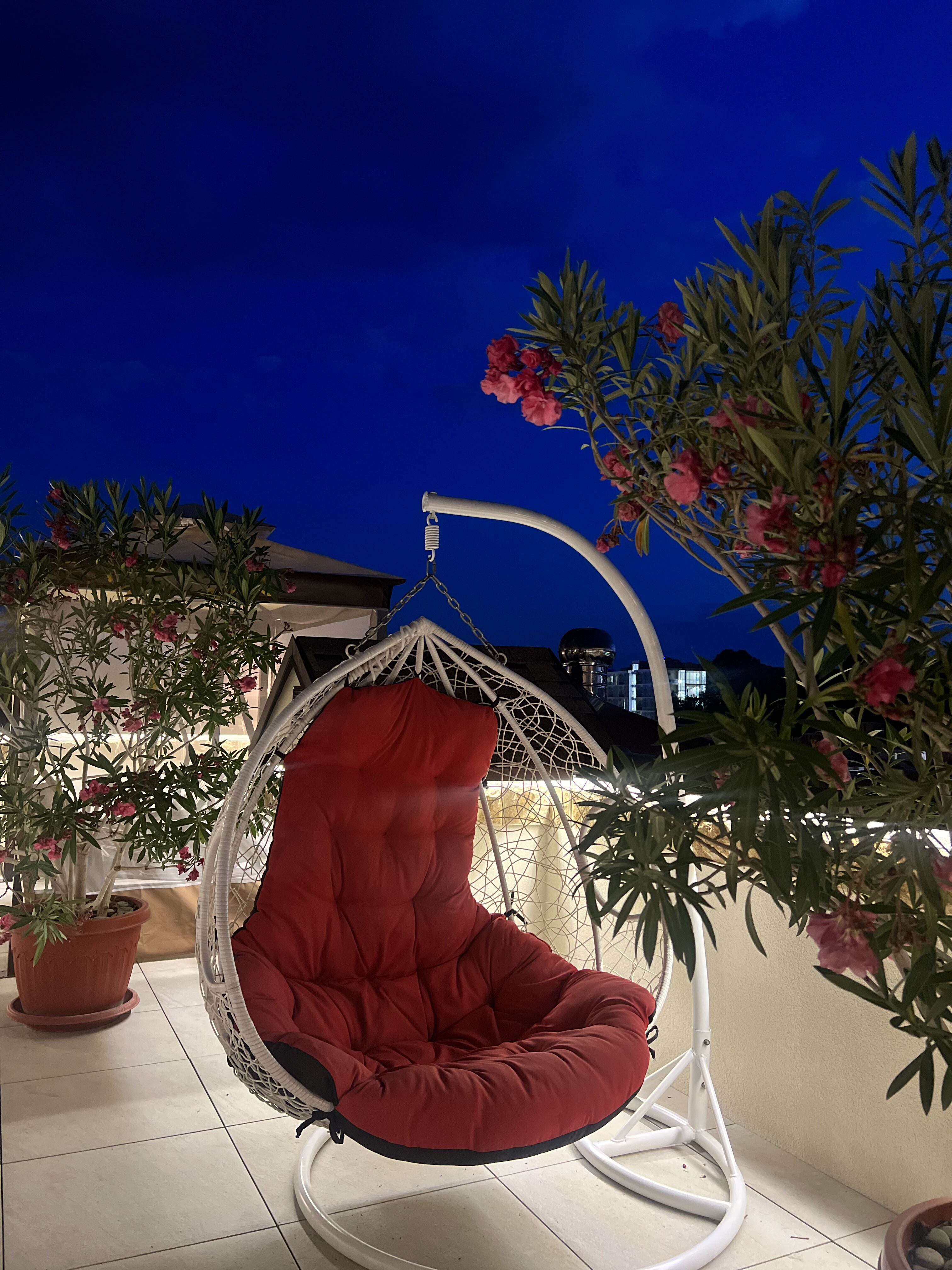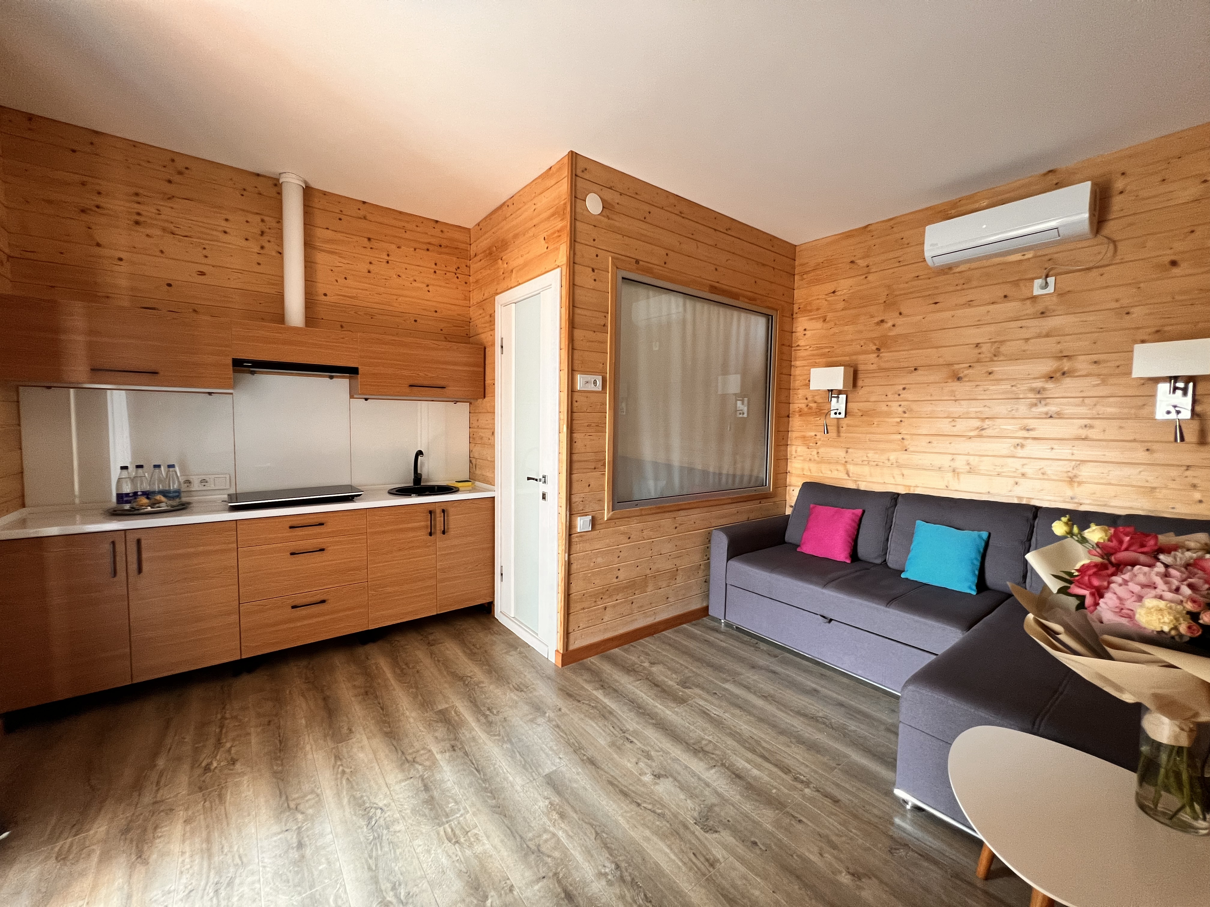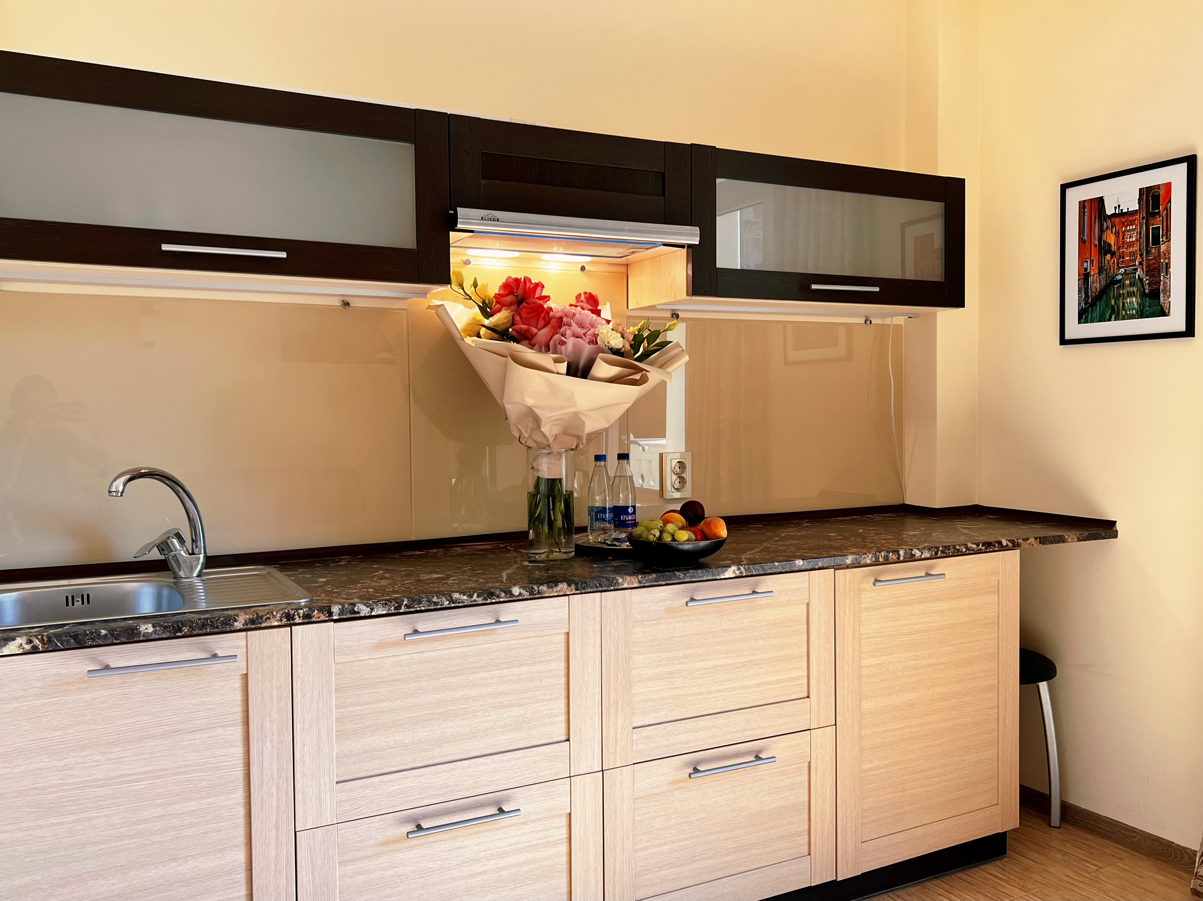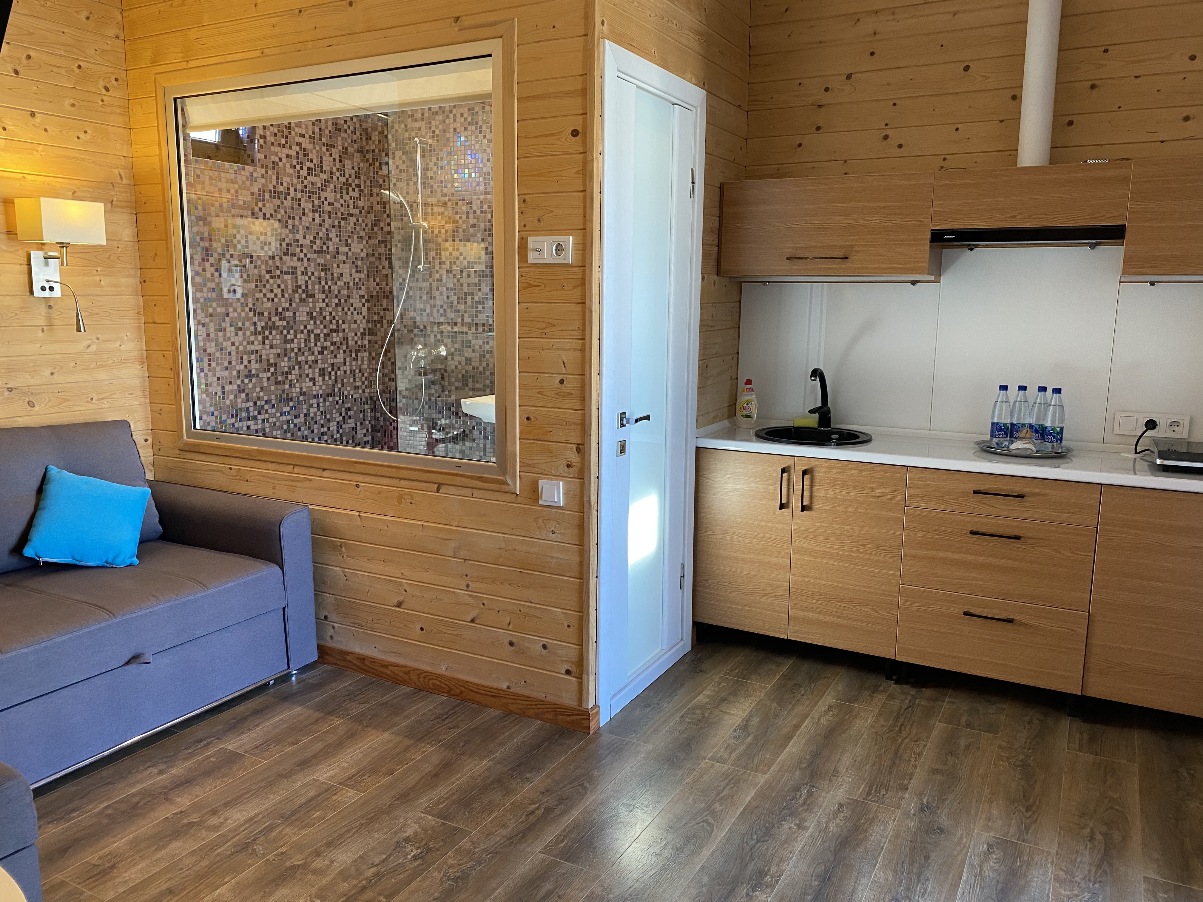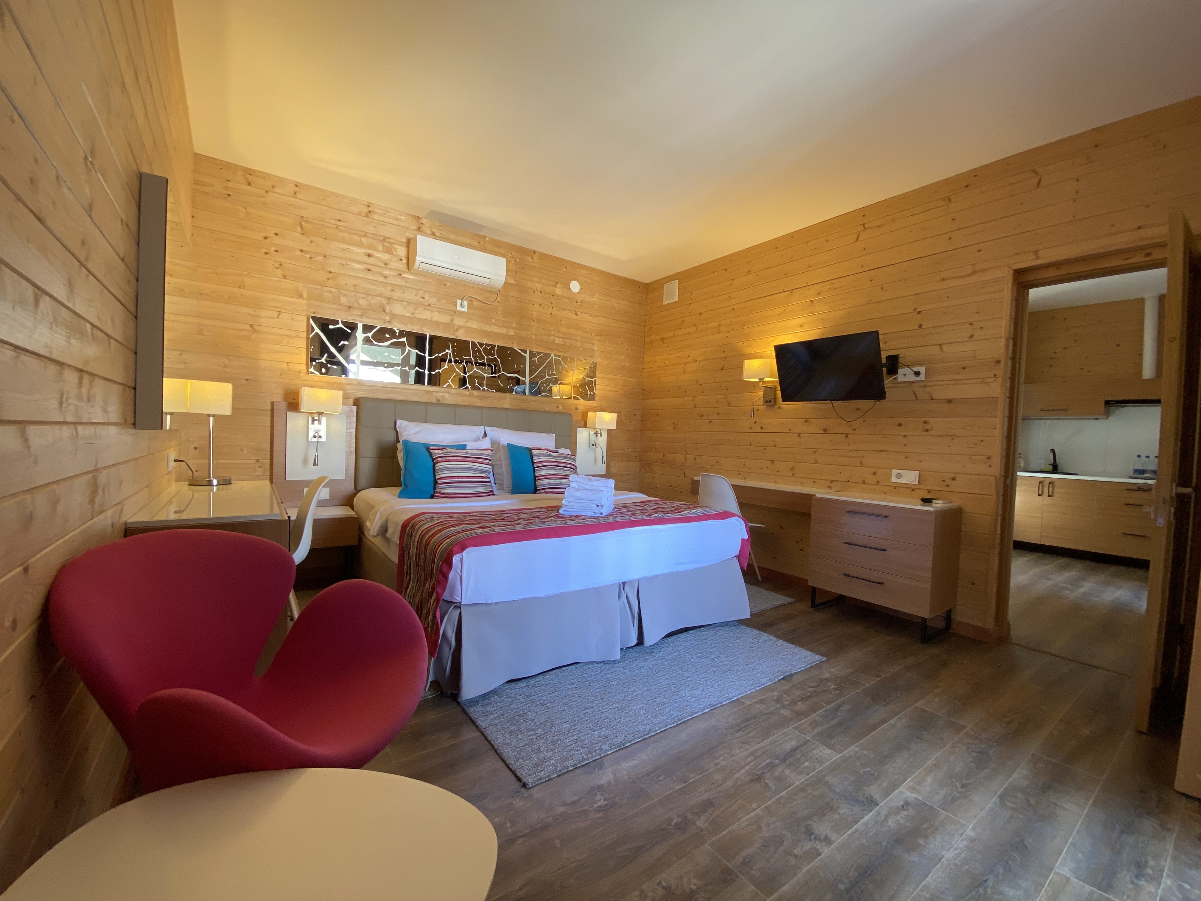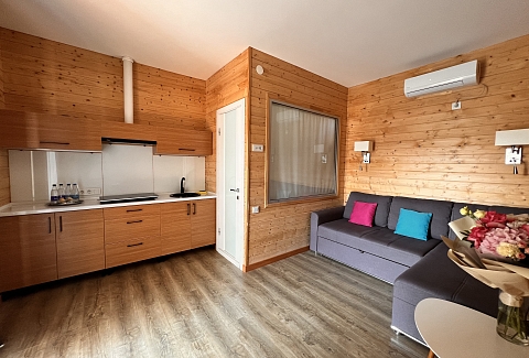 В номере: вешалка, диван раскладной, зеркало, кресла, кровать двуспальная, кухонная мебель, прикроватные тумбочки, стол, стулья, шкаф-купе, кондиционер, набор посуды, сейф, телевизор ЖК, холодильник