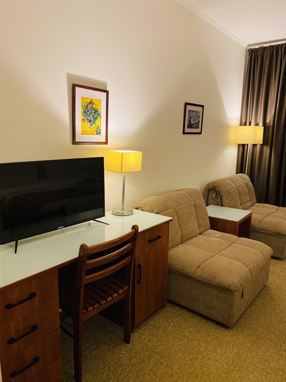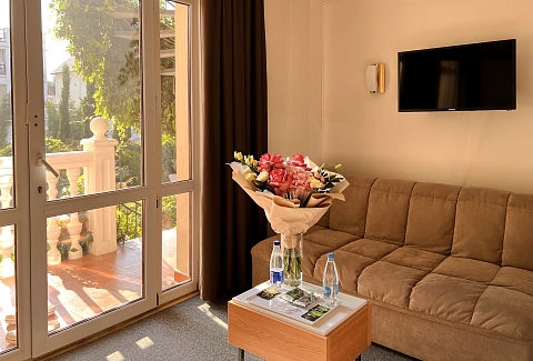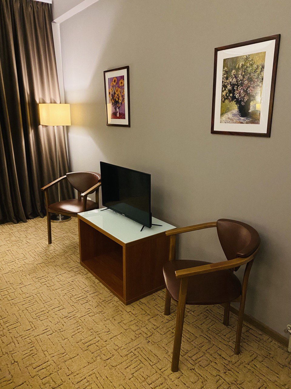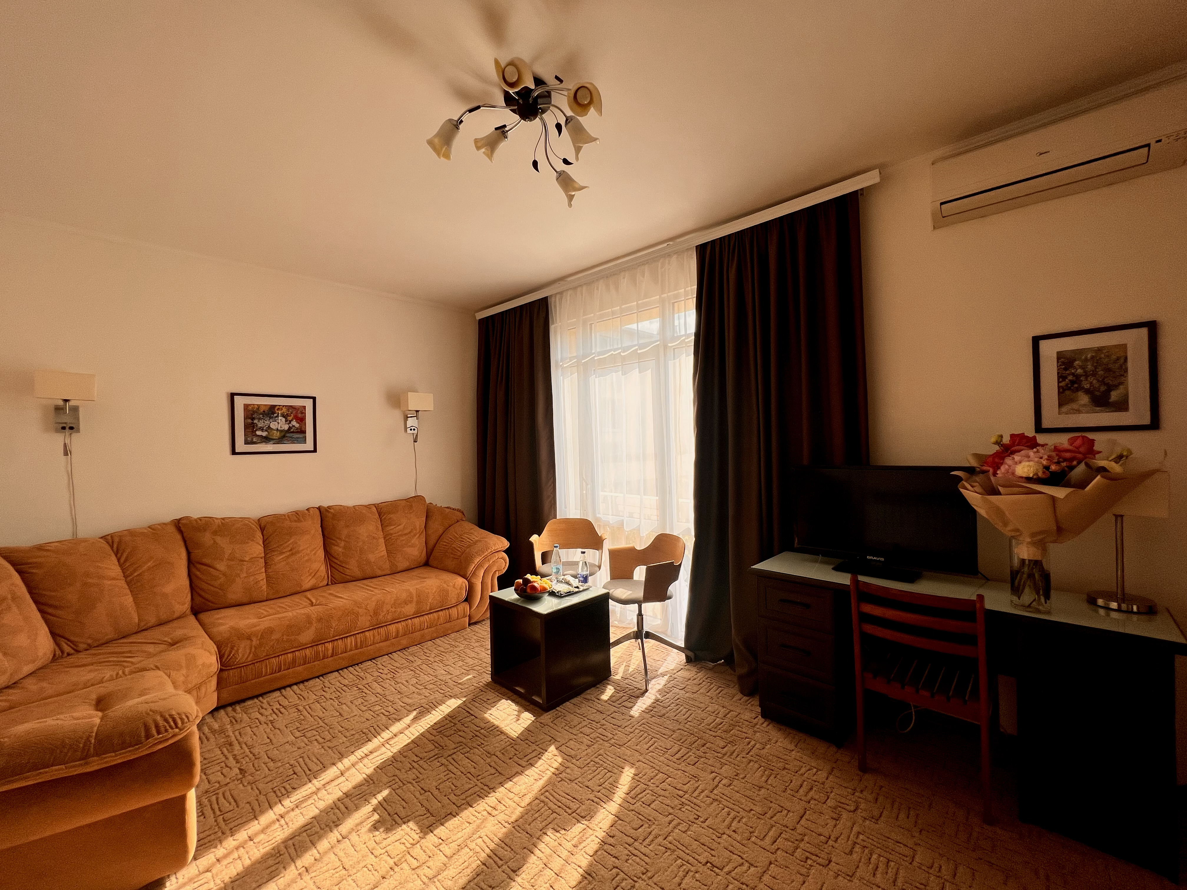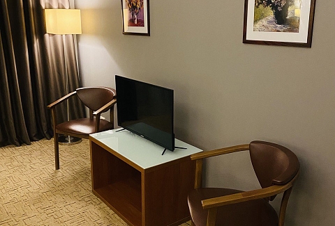 В номере: вешалка, диван раскладной, зеркало, кресла, кровать двуспальная, прикроватные тумбочки, столик журнальный, столик туалетный, стулья, шкаф, кондиционер, мини-холодильник, сейф, телевизор, чайный набор посуды, электрочайник