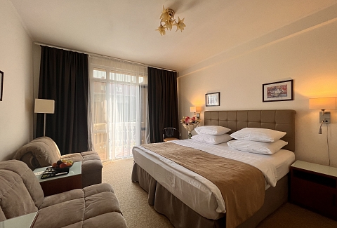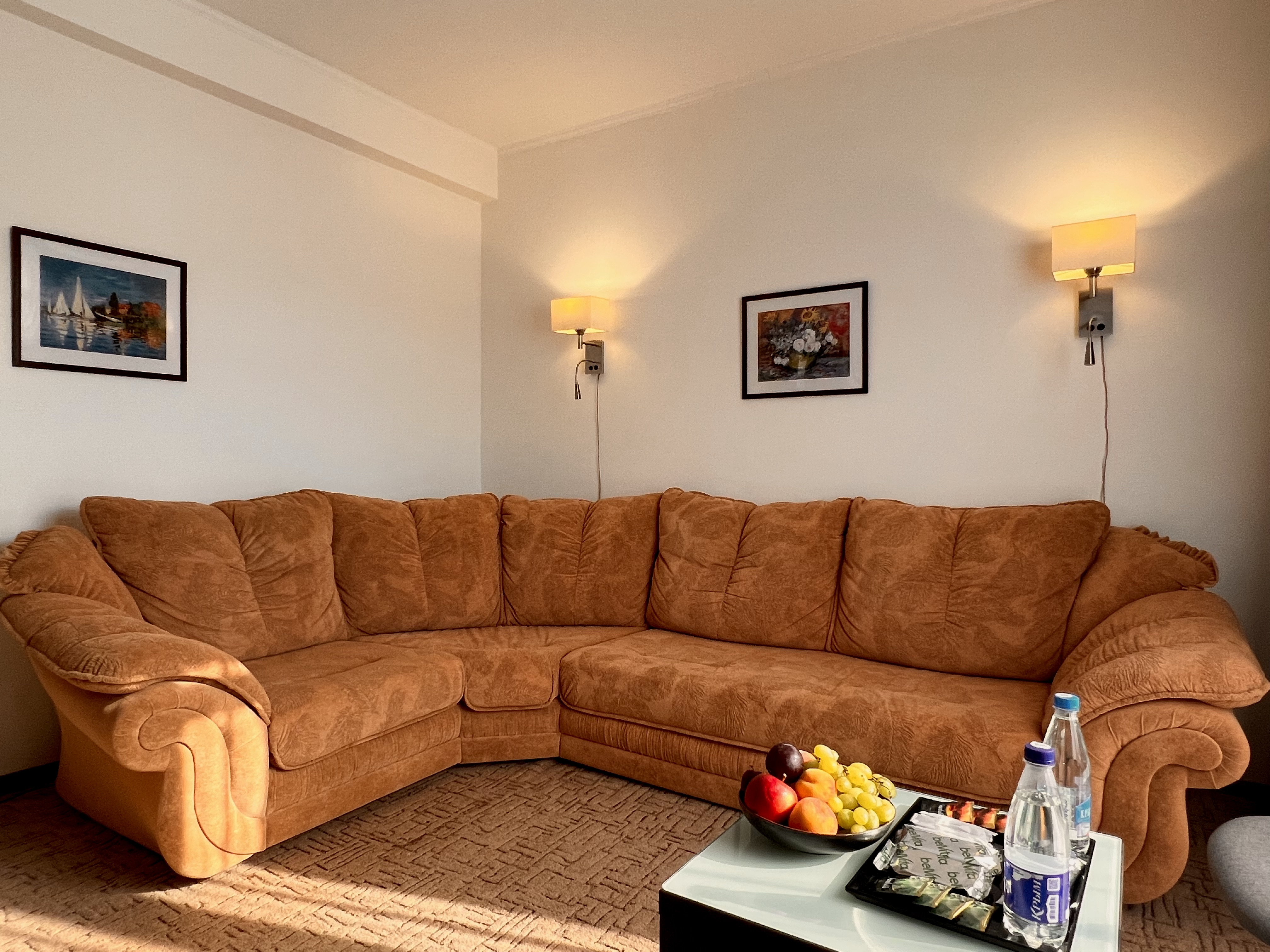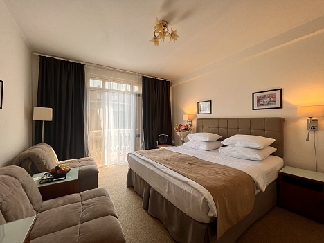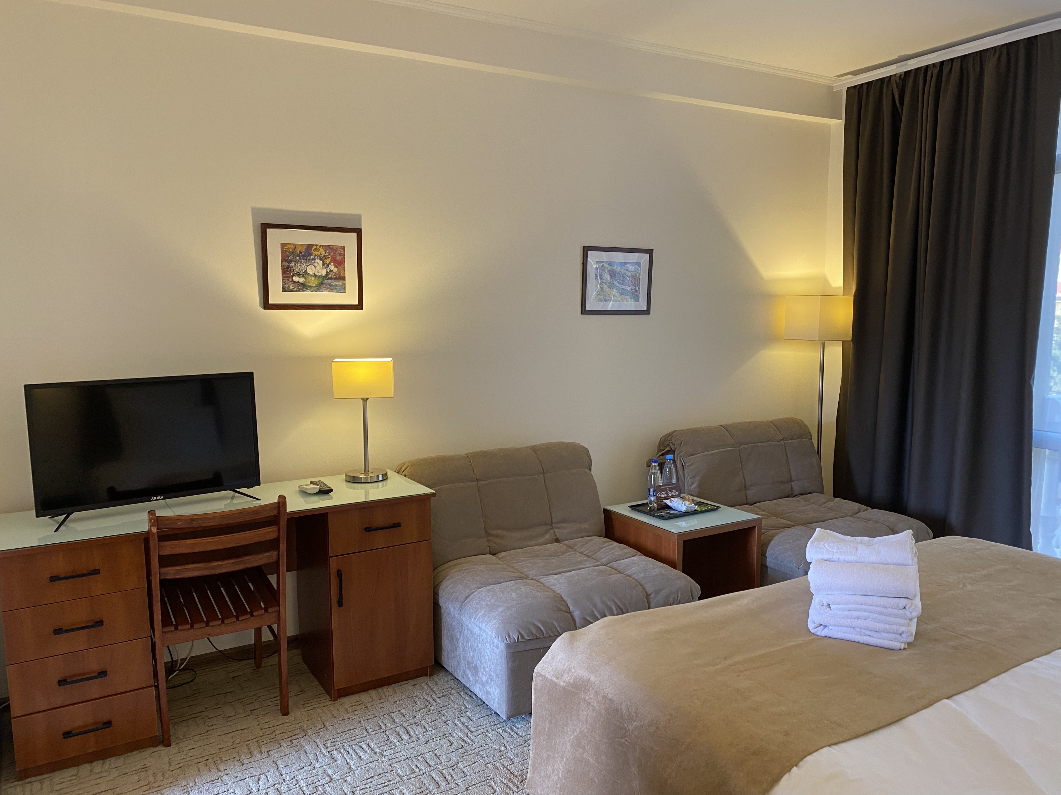 В номере: вешалка, диван раскладной, зеркало, кресла, кровать двуспальная, прикроватные тумбочки, столик журнальный, столик туалетный, стулья, шкаф, кондиционер, мини-холодильник, сейф, телевизор, чайный набор посуды, электрочайник