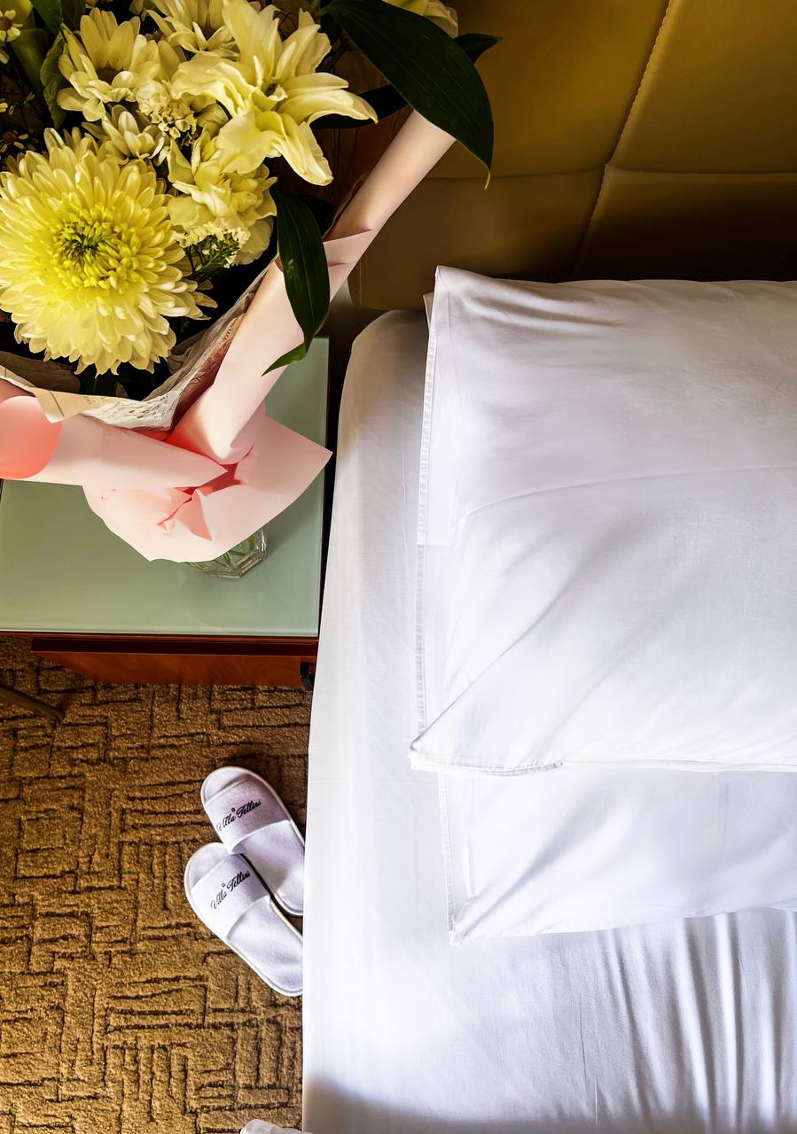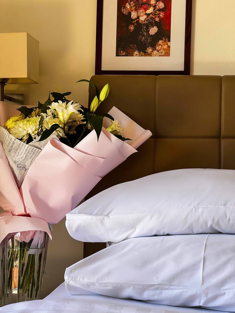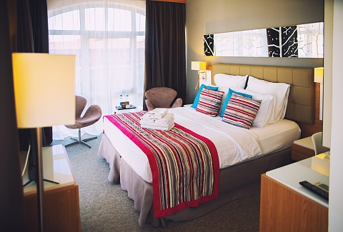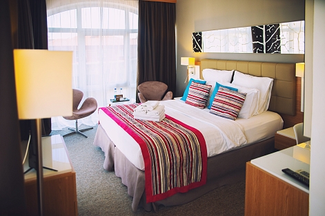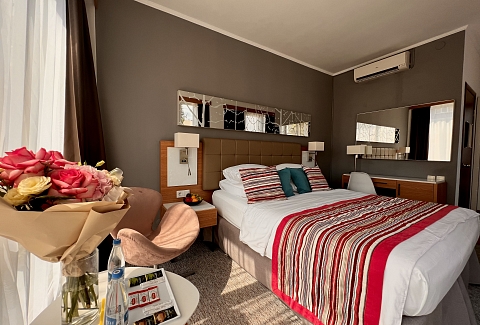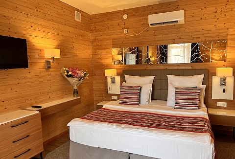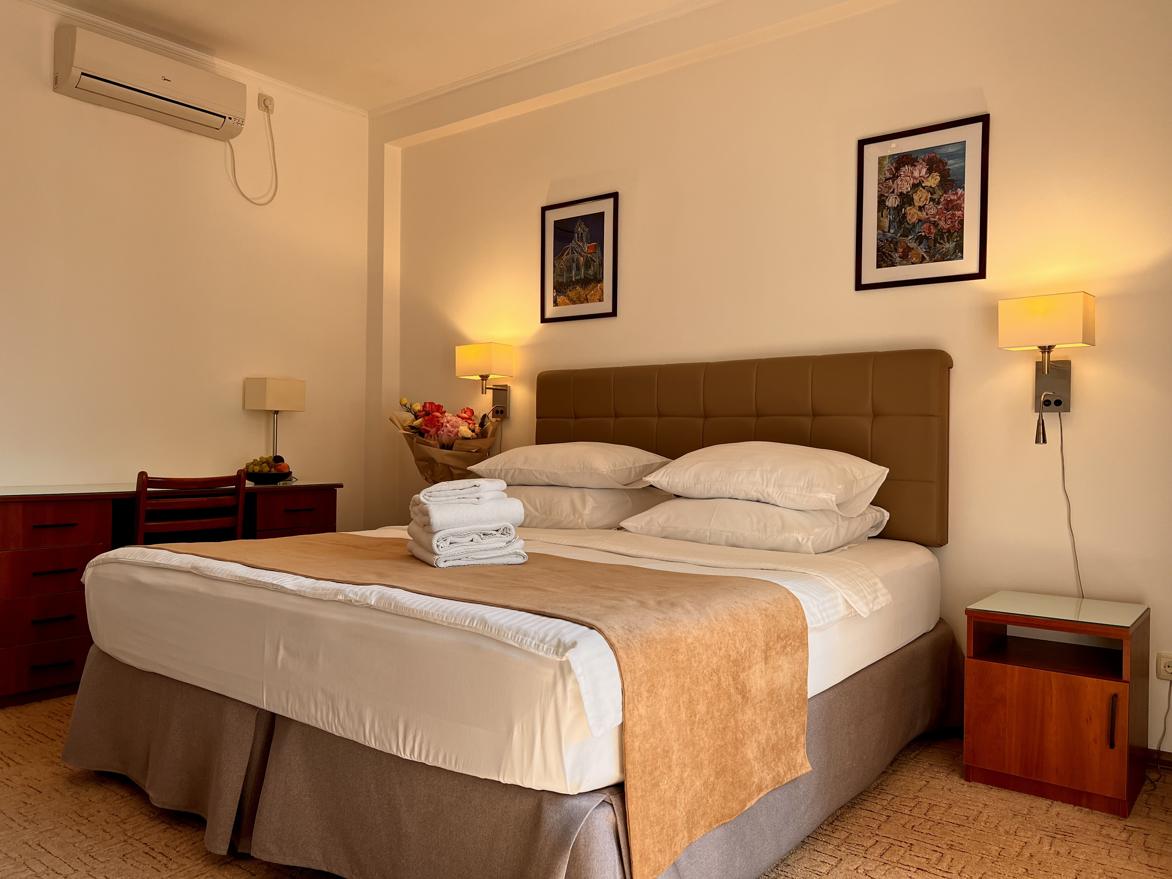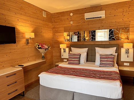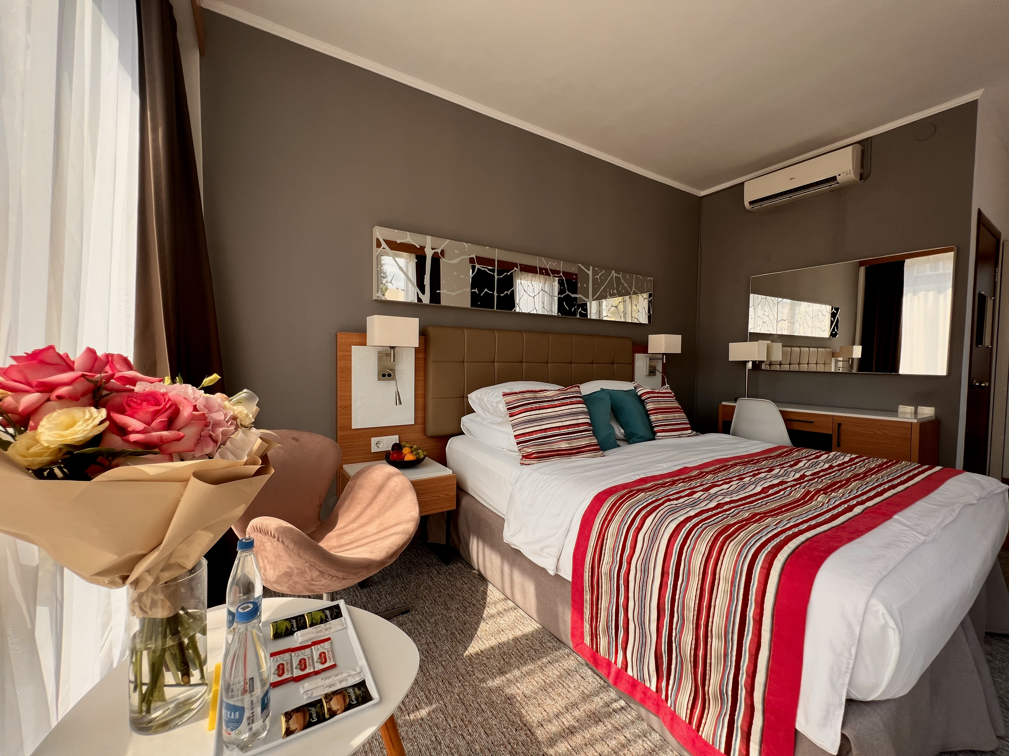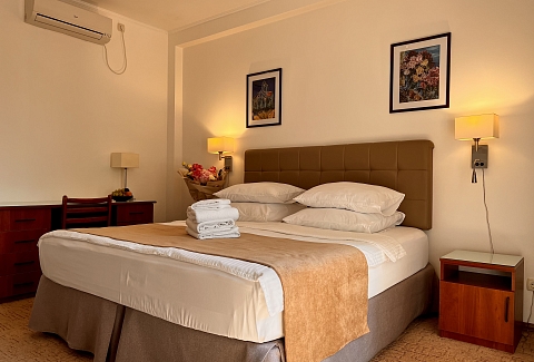 В номере: вешалка, зеркало, кровать двуспальная, прикроватные тумбочки, столик журнальный, столик туалетный, стулья, шкаф, кондиционер, сейф, телевизор, холодильник, чайный набор посуды, электрочайник