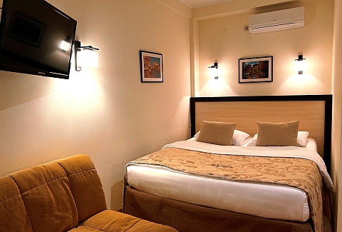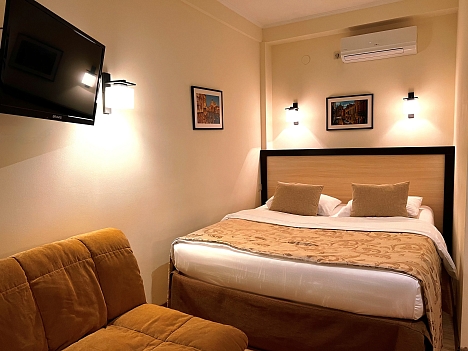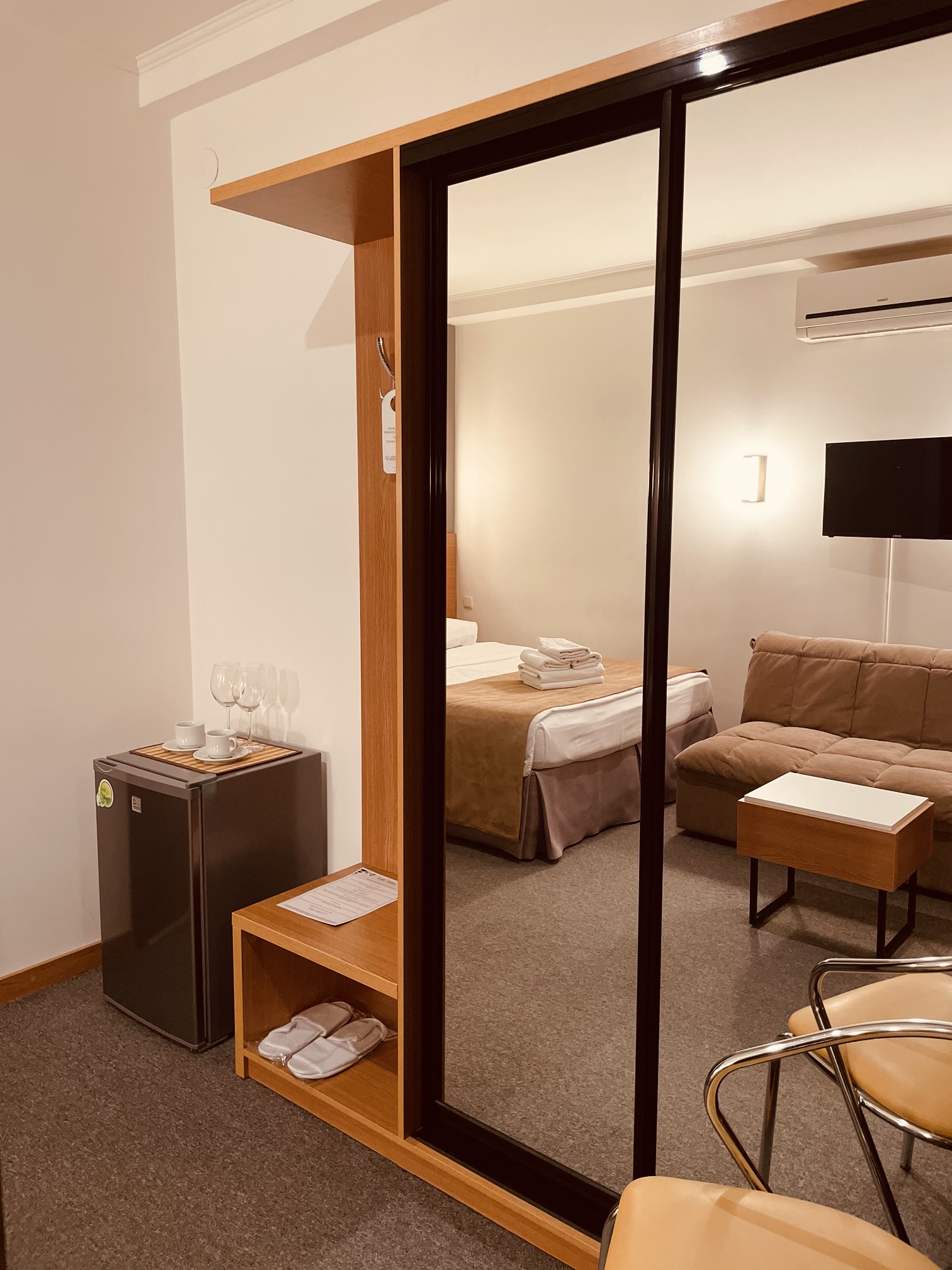 В номере: вешалка, зеркало, кровать двуспальная, прикроватные тумбочки, столик журнальный, стул, шкаф-купе, кондиционер, сейф, телевизор, холодильник, чайный набор посуды, электрочайник