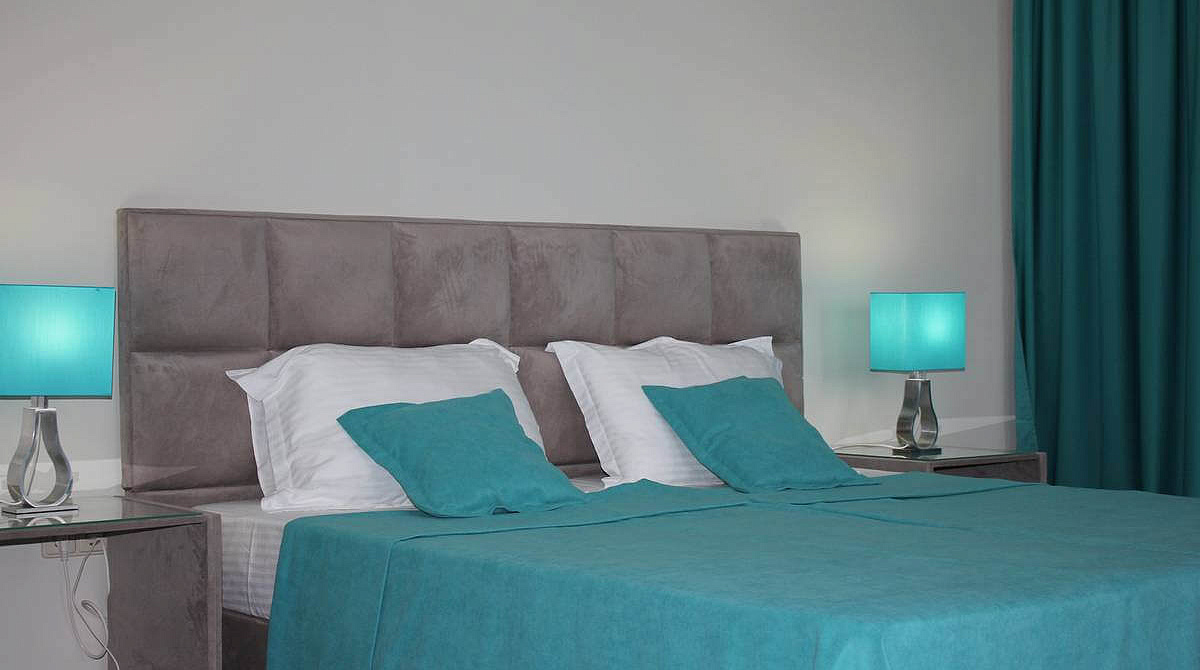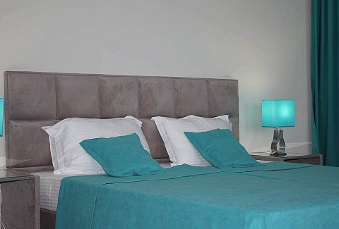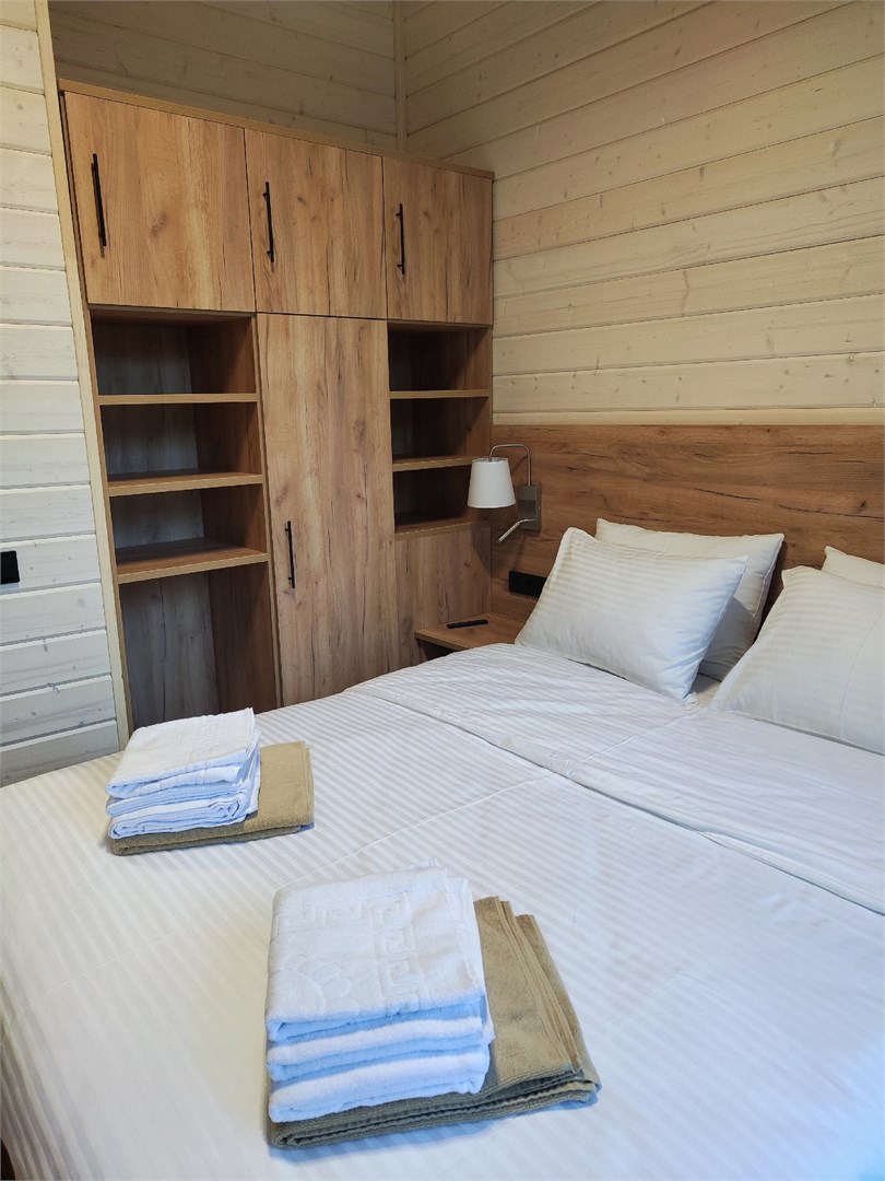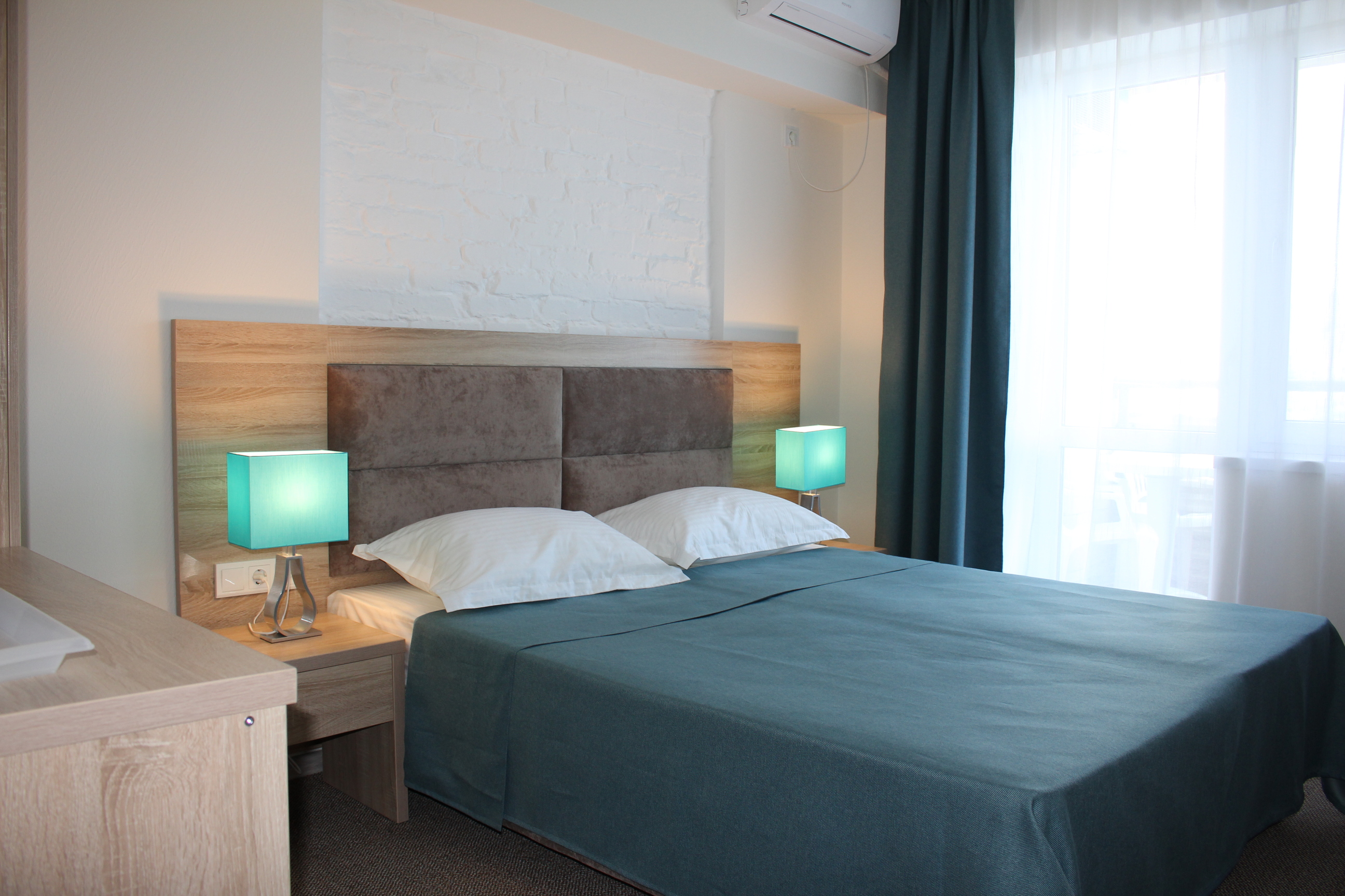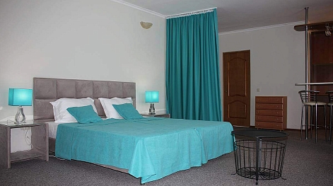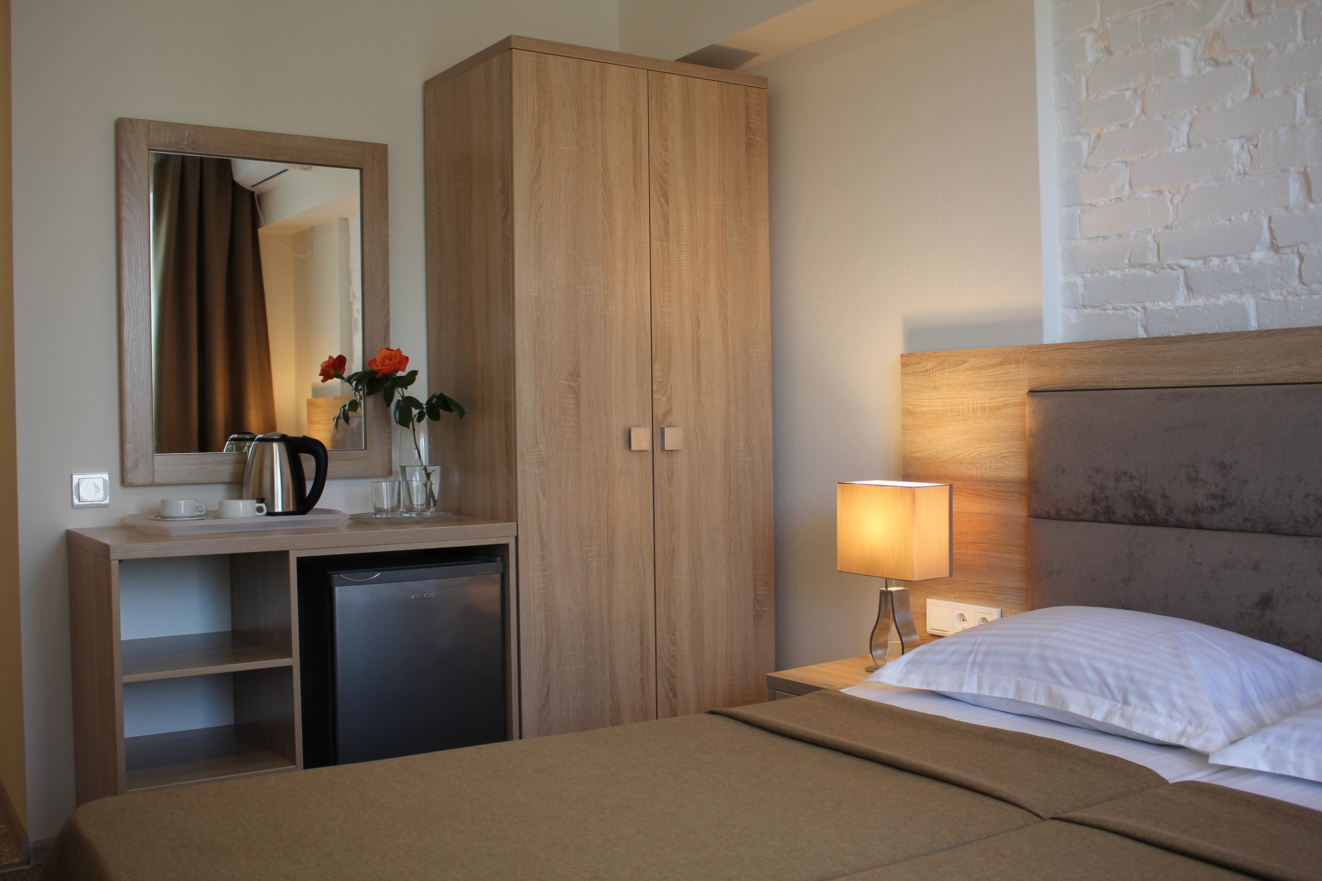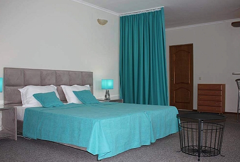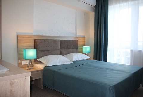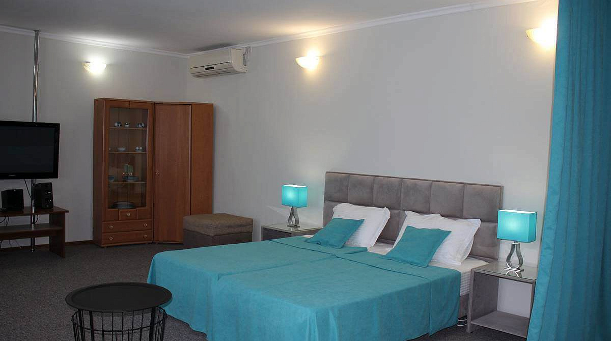 В номере: вешалка, зеркало, кровать двуспальная, прикроватные тумбочки, стол, стулья, шкаф, кондиционер, набор посуды, телевизор, холодильник