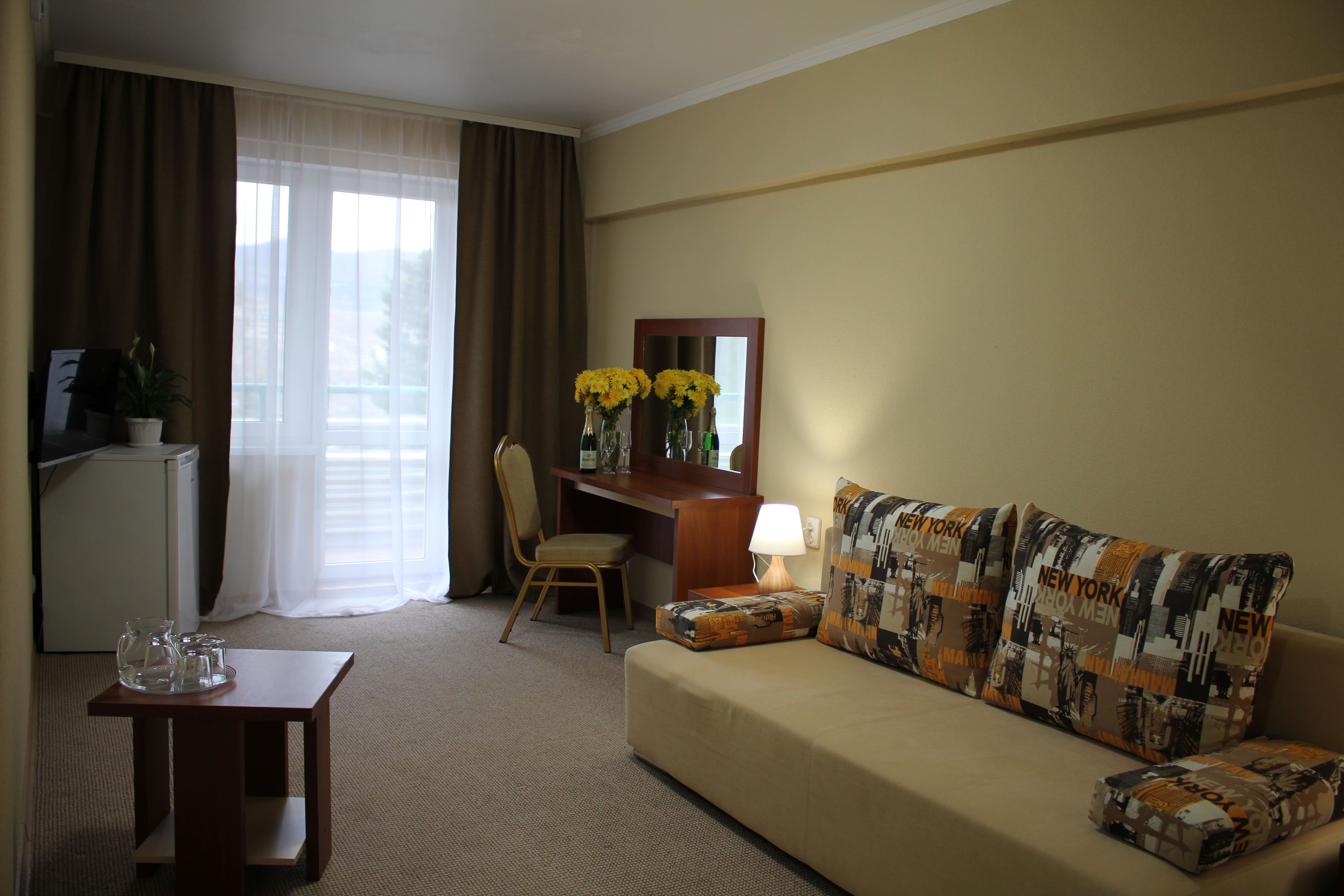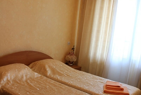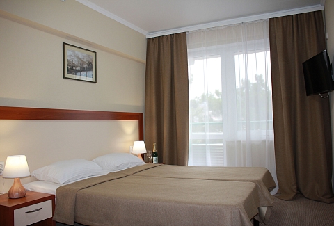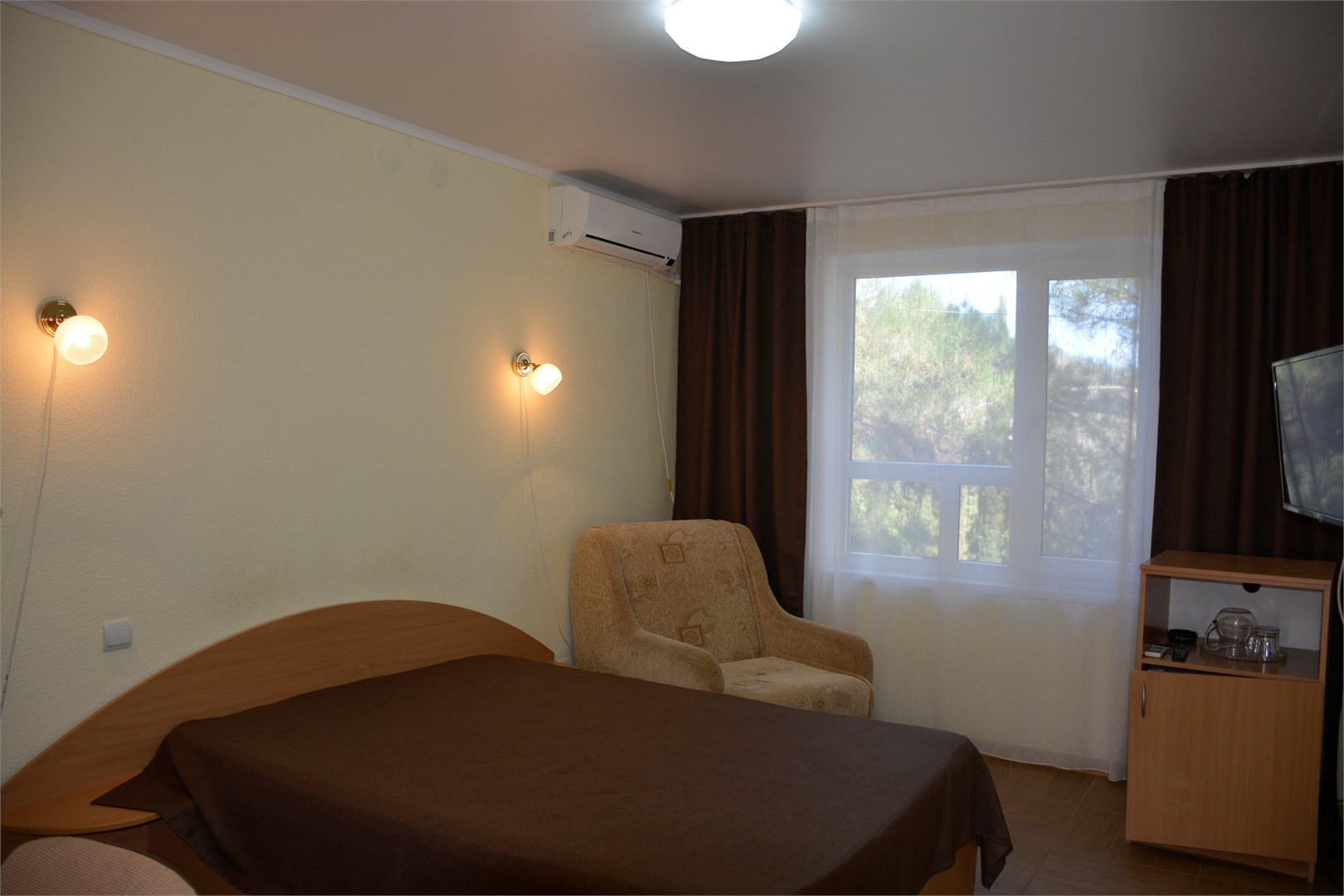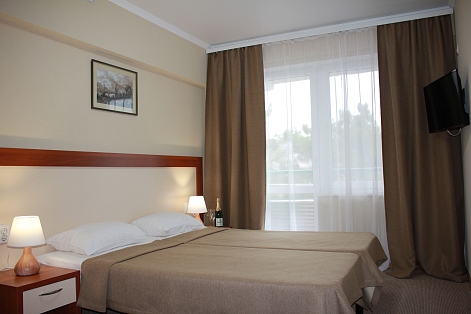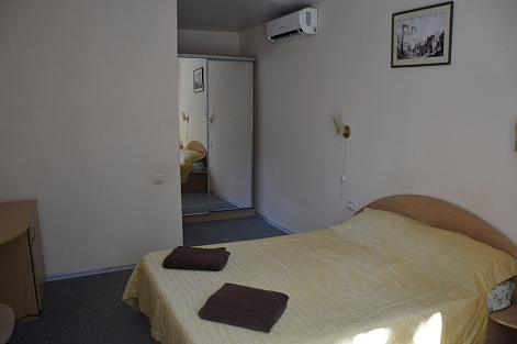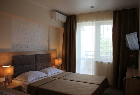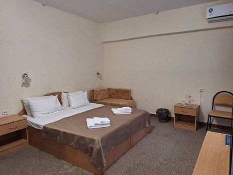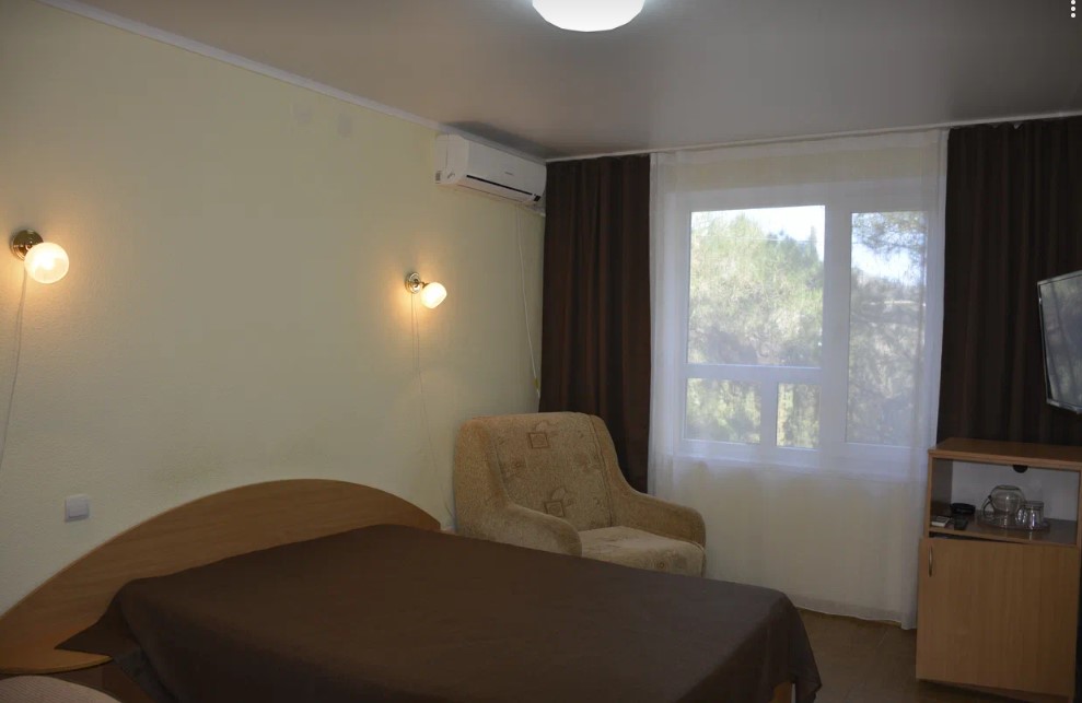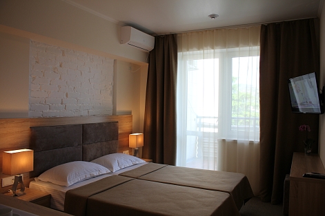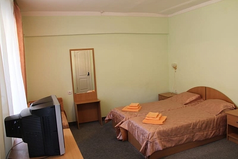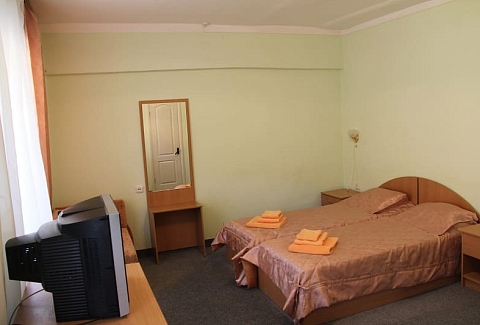 В номере: вешалка, зеркало, кровати односпальные /одна двуспальная кровать, прикроватные тумбочки, стол, стулья, шкаф, кондиционер, набор посуды, телевизор, холодильник, электрочайник
