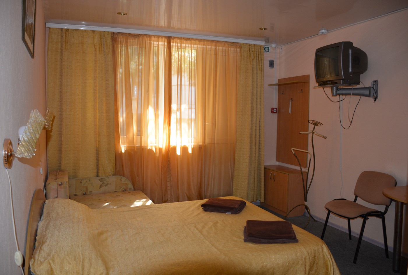 В номере: вешалка, зеркало, кровать односпальная, прикроватная тумбочка, стул, шкаф, телевизор, холодильник