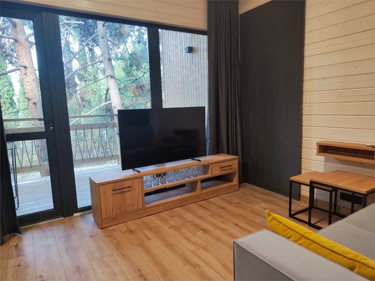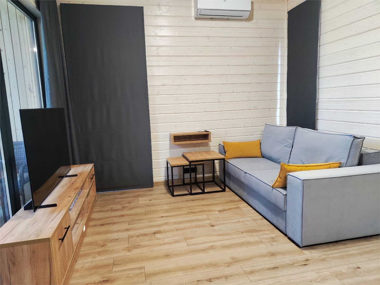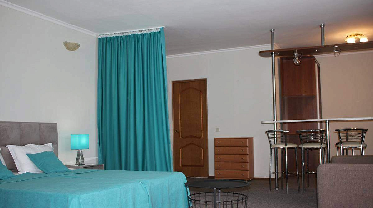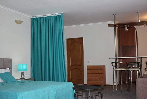 В номере: вешалка, диван раскладной, зеркало, кровать двуспальная, кухонная мебель, набор мягкой мебели, прикроватные тумбочки, столик туалетный, стулья, тумба под телевизор, шкаф, гладильная доска, кондиционер, микроволновая печь, набор посуды, стиральная машина, телевизор ЖК, утюг, холодильник, чайный набор посуды, электрочайник