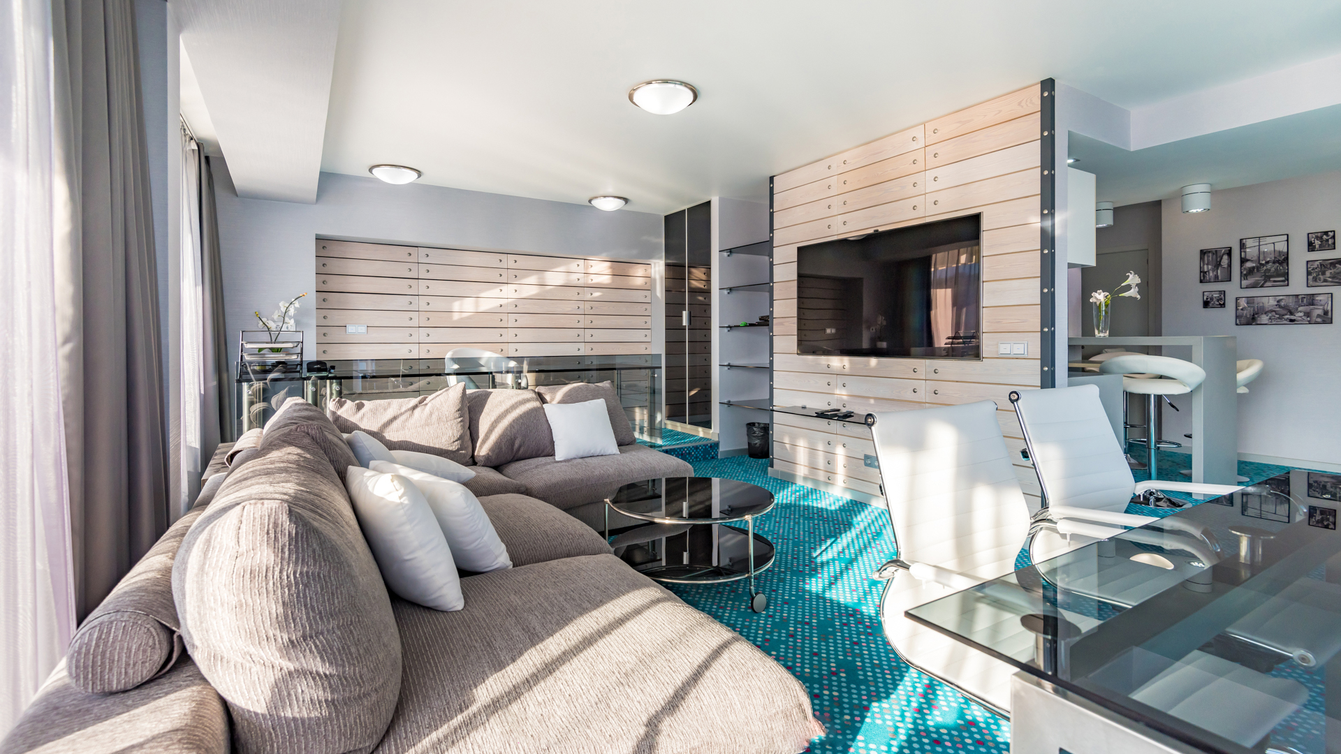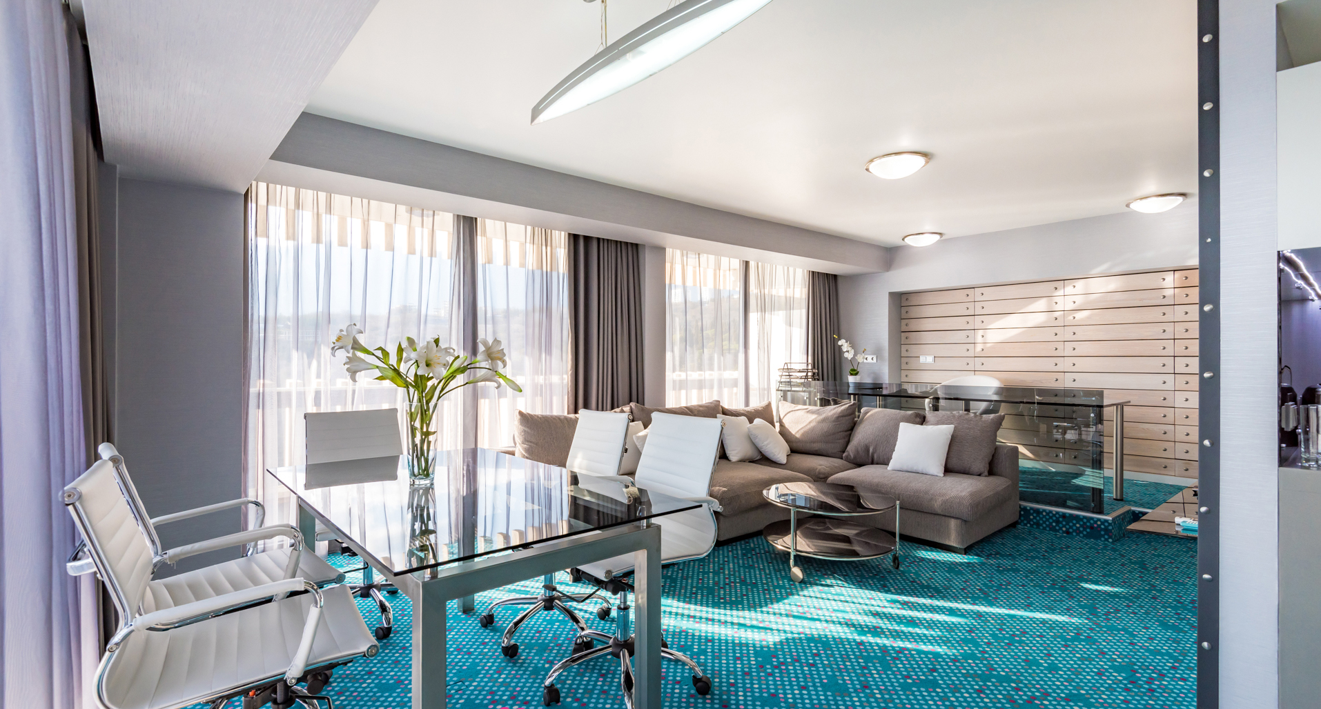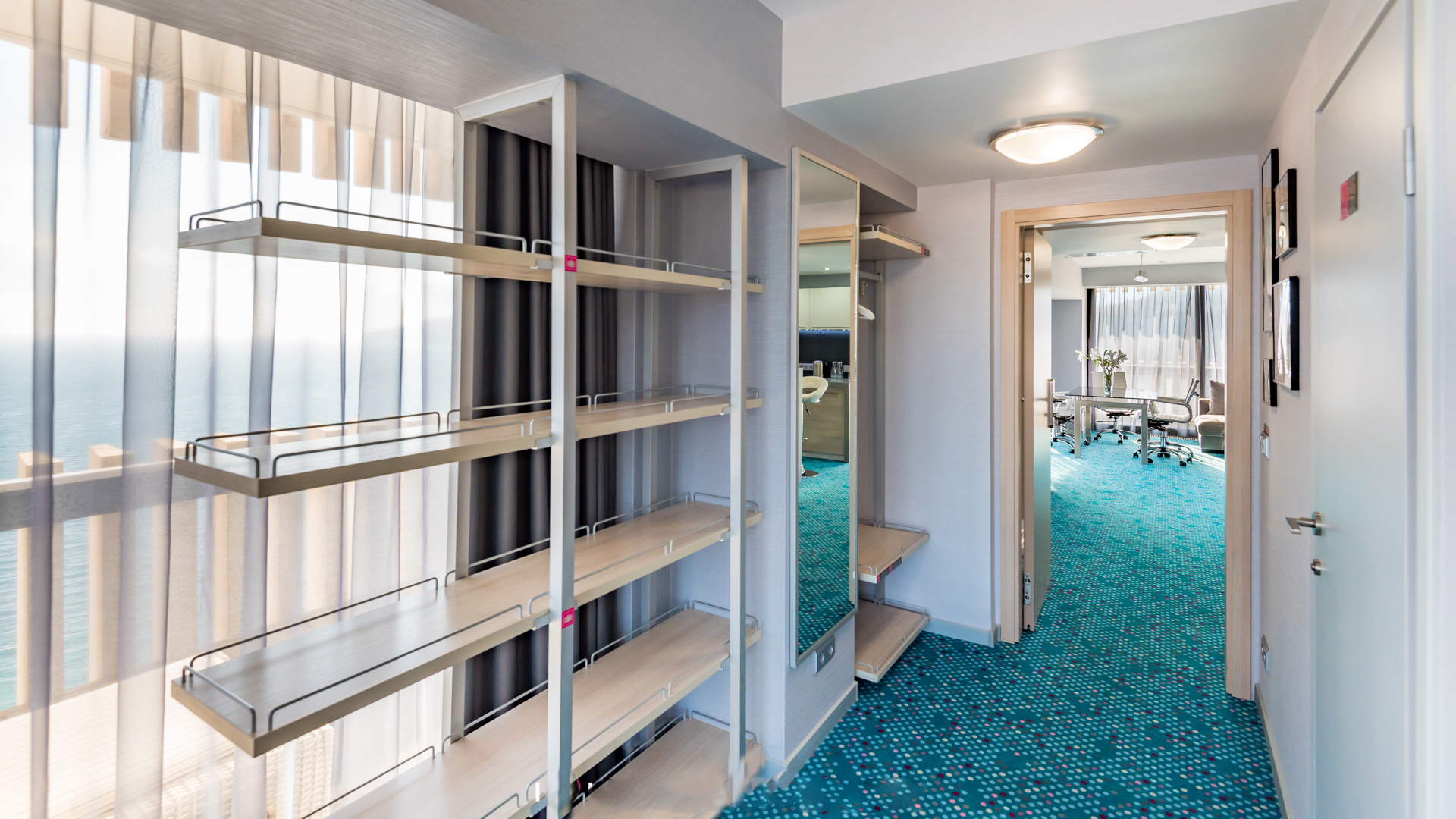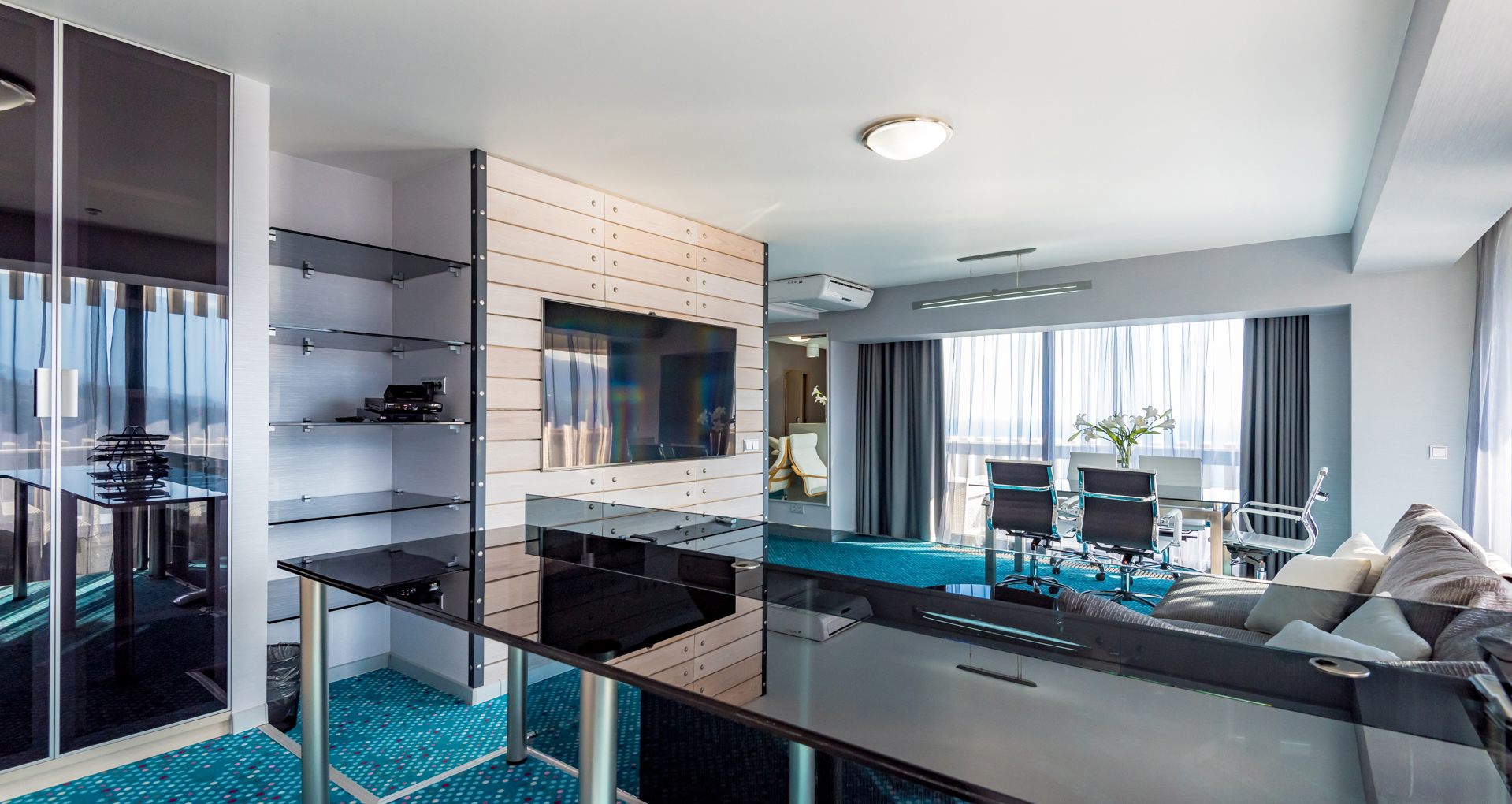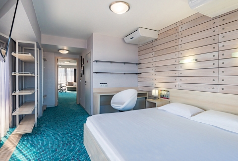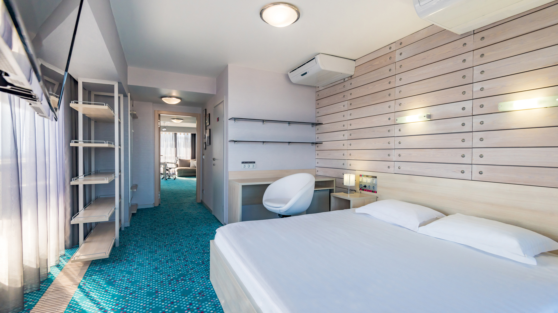 В номере: вешалка, диван, зеркало, кровать двуспальная, прикроватные тумбочки, столик журнальный, стулья, тумба багажная, шкаф, кондиционер, мини-холодильник, сейф, телевизор ЖК, телефон, чайный набор посуды