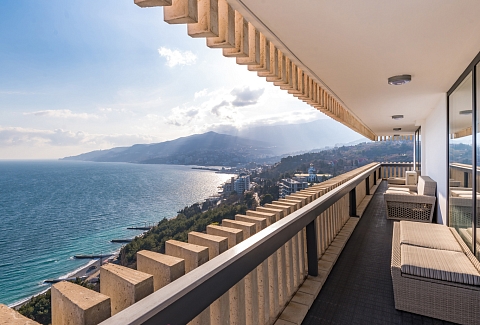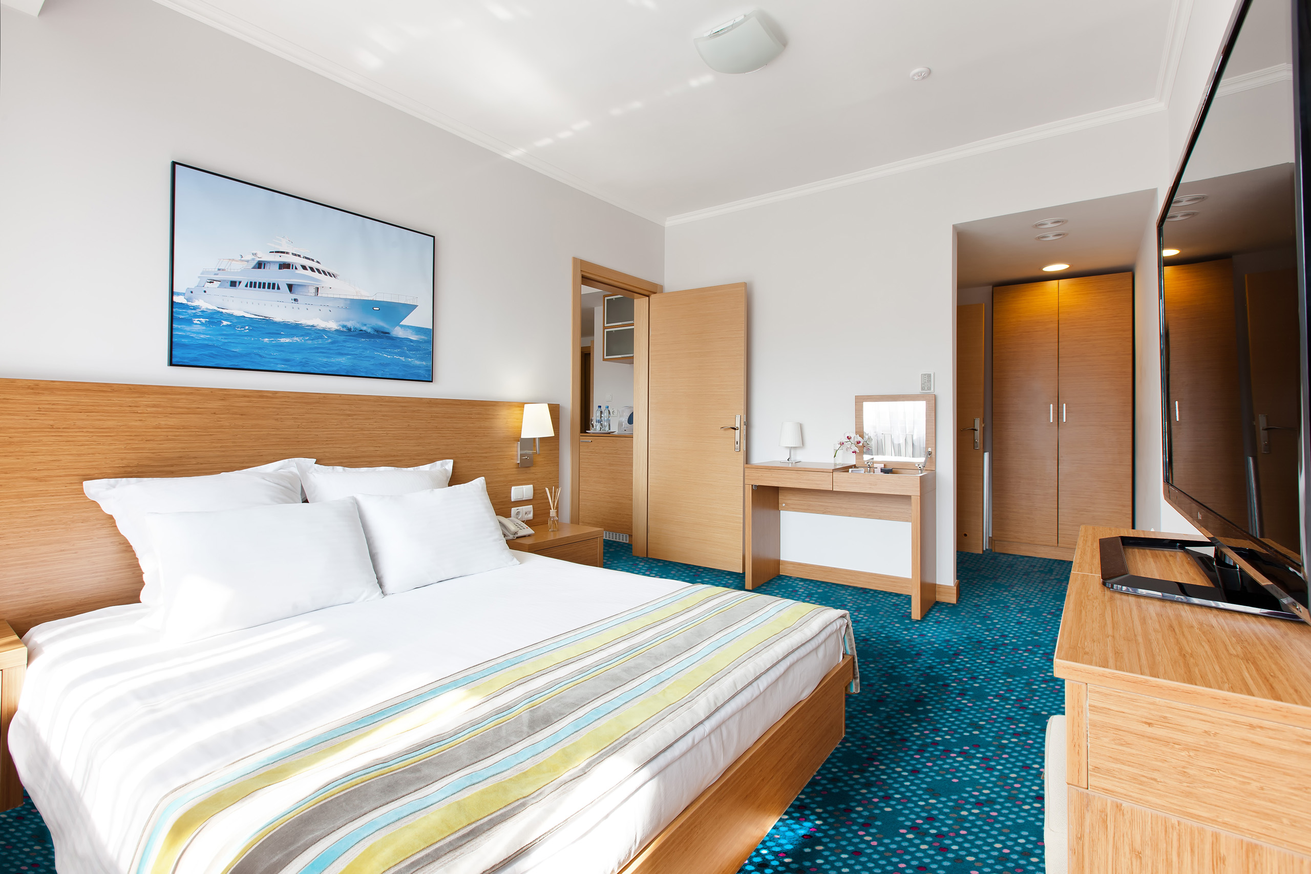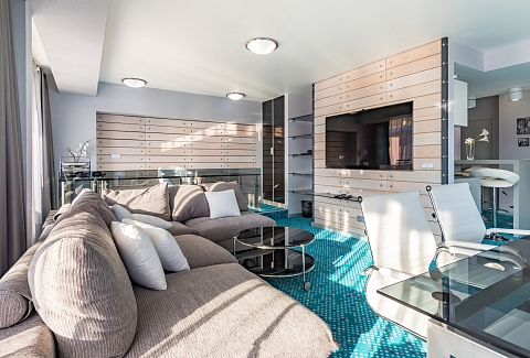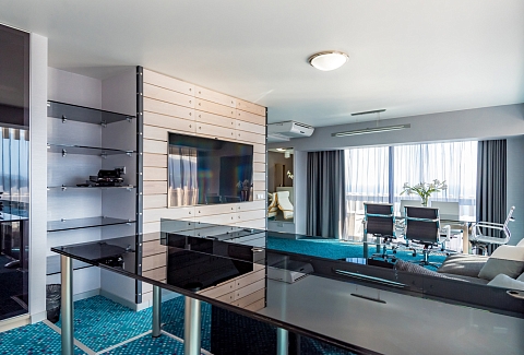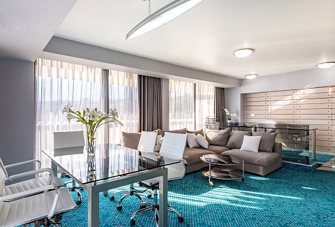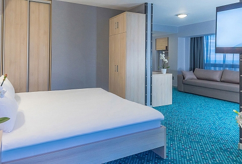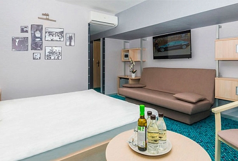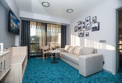 В номере: вешалка, диван, зеркало, кровать двуспальная, прикроватные тумбочки, стол, стулья, шкаф, кондиционер, мини-холодильник, плита электрическая, сейф, телевизор ЖК, телефон, чайный набор посуды, электрочайник