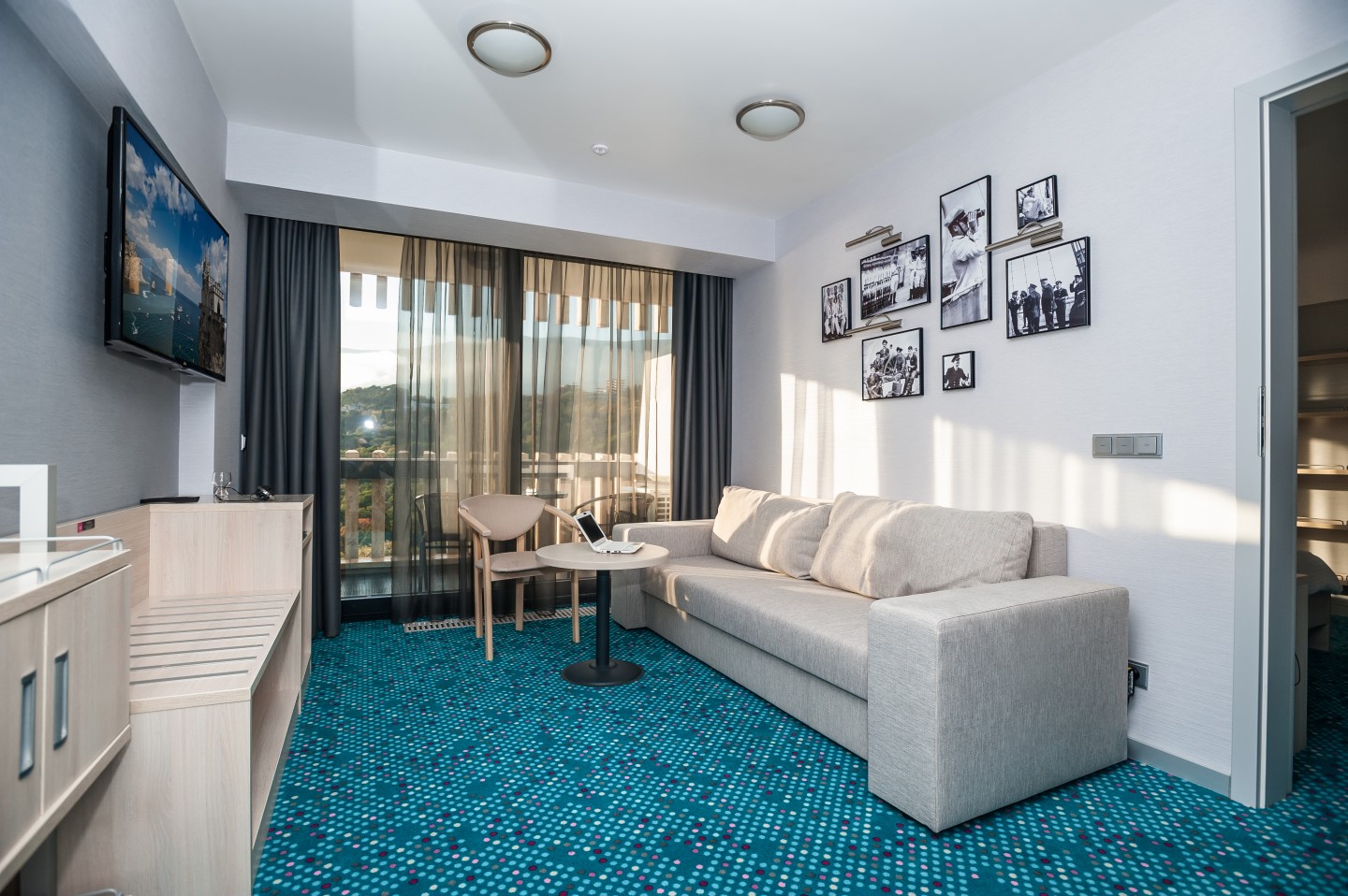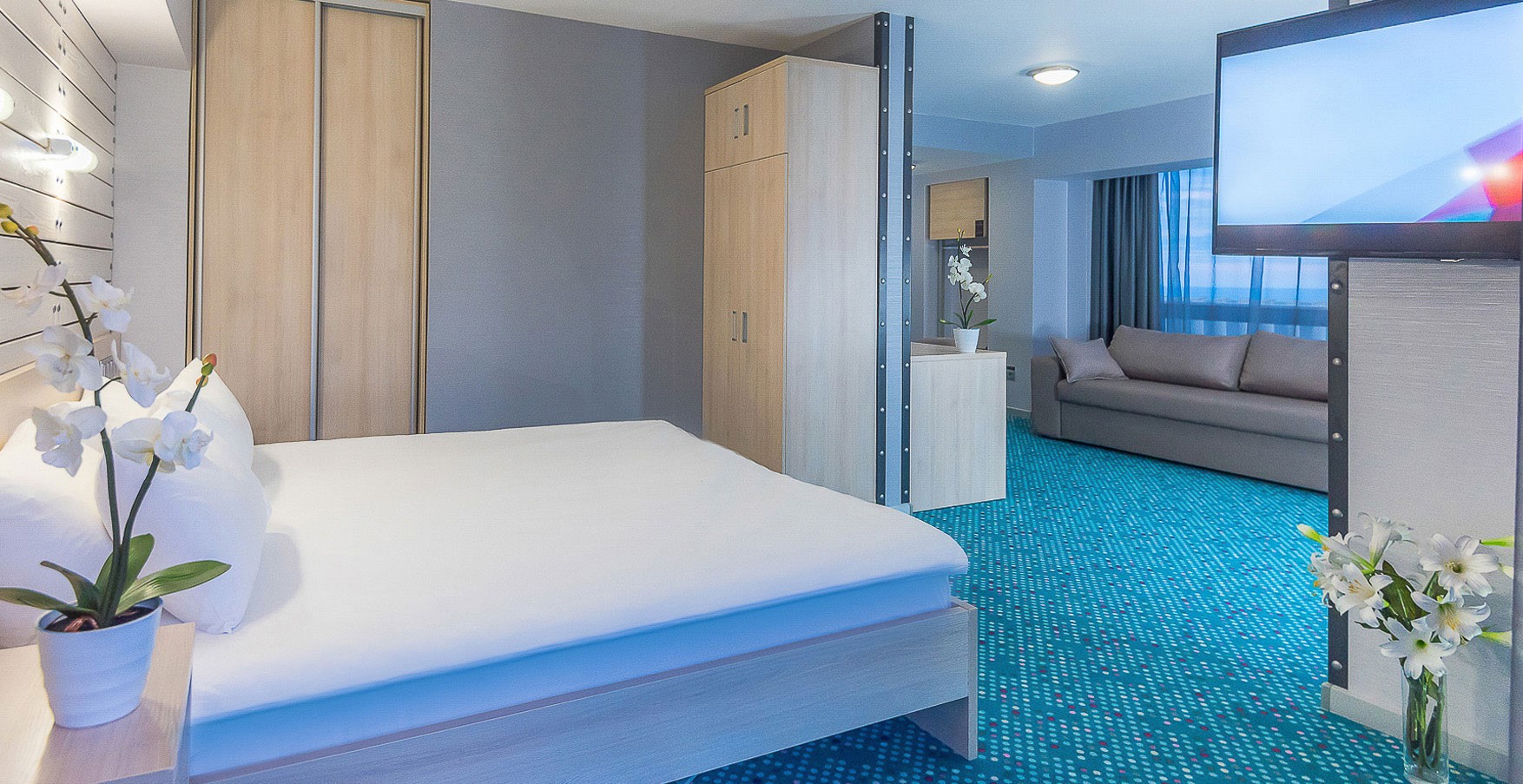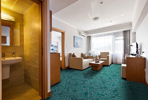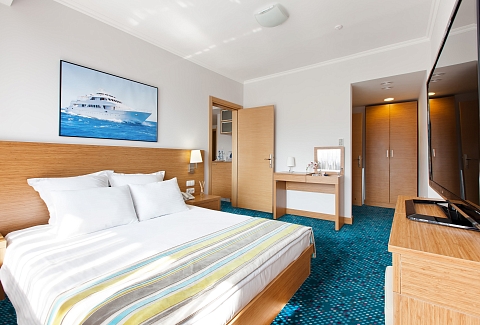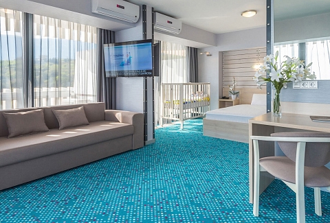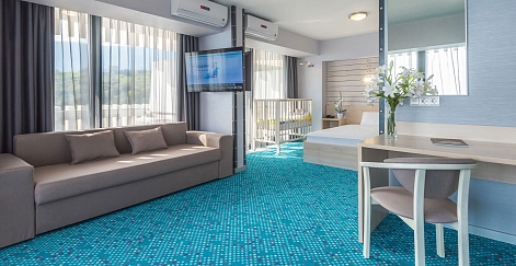 В номере: вешалка, диван, зеркало, кровать двуспальная, прикроватные тумбочки, столик журнальный, стулья, тумба багажная, шкаф, кондиционер, мини-холодильник, телевизор ЖК, телефон, чайный набор посуды