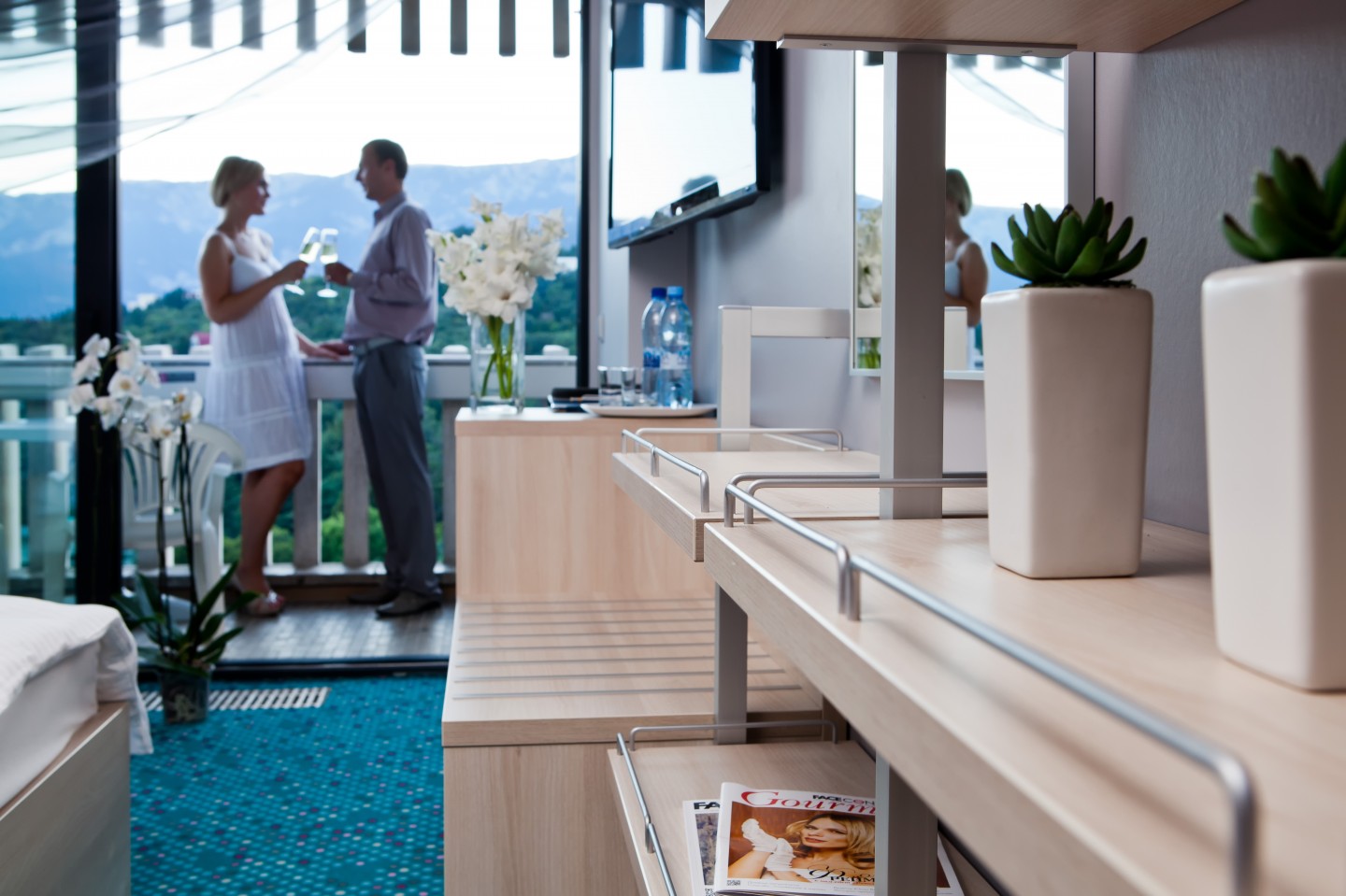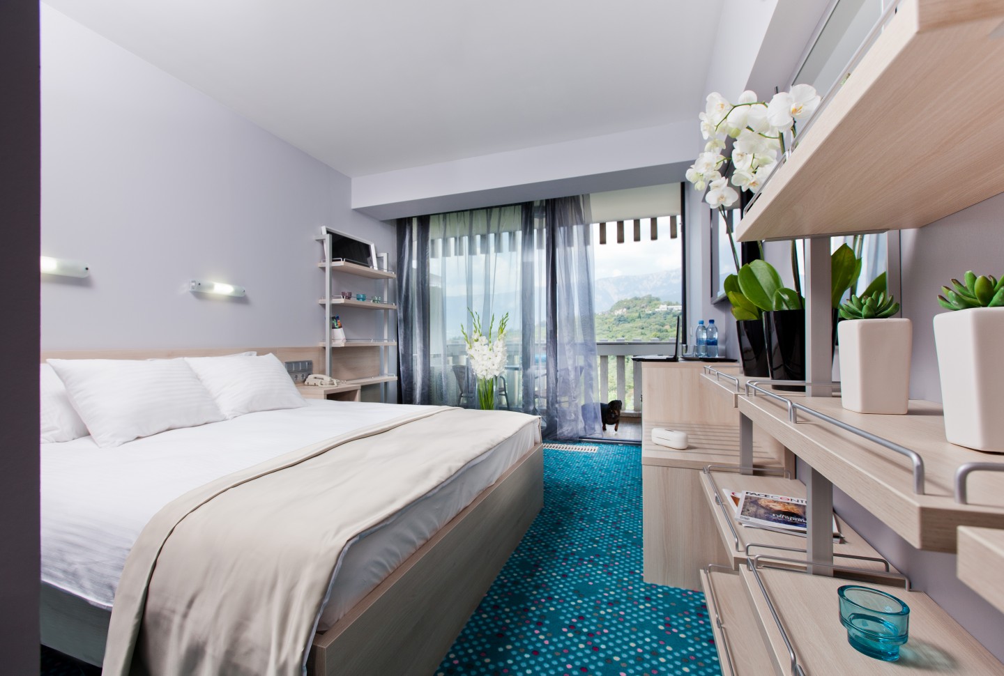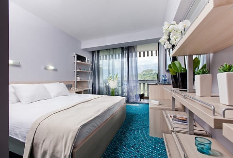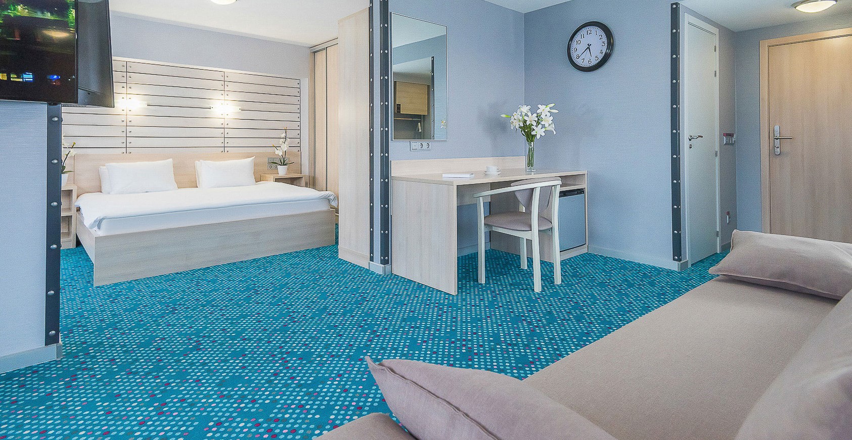 В номере: вешалка, диван, зеркало, кровать двуспальная, прикроватные тумбочки, столик журнальный, стулья, тумба багажная, шкаф, кондиционер, мини-холодильник, телевизор ЖК, телефон, чайный набор посуды