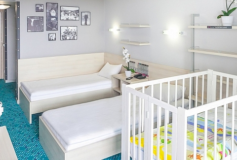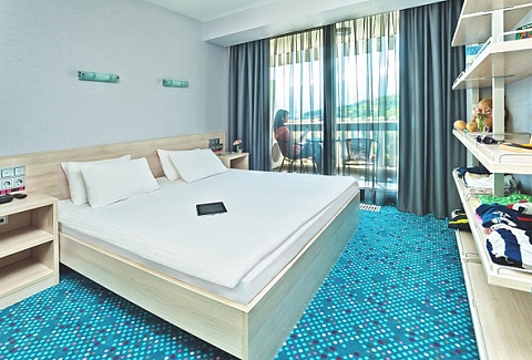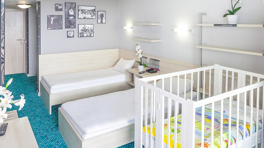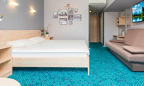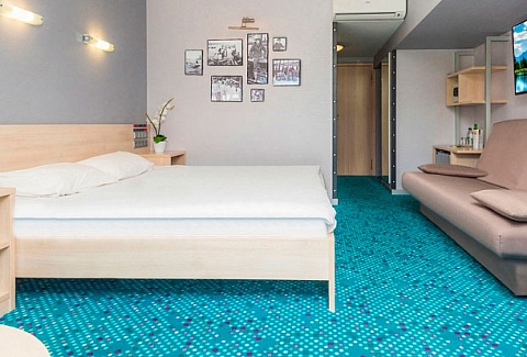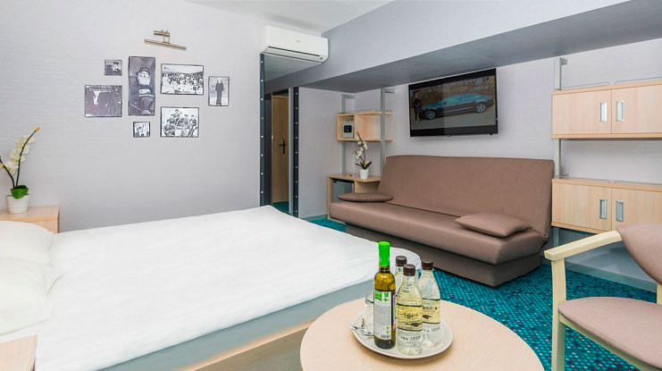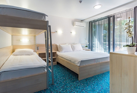 В номере: вешалка, зеркало, кровать двуспальная, кровать двухъярусная, столик журнальный, стулья, тумба багажная, шкаф, кондиционер, мини-холодильник, сейф, телевизор ЖК, телефон, чайный набор посуды