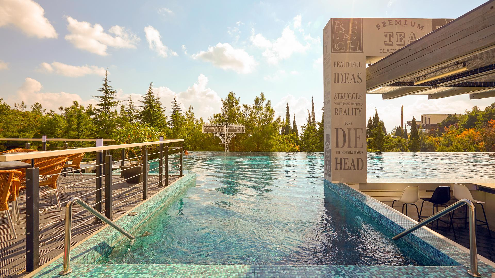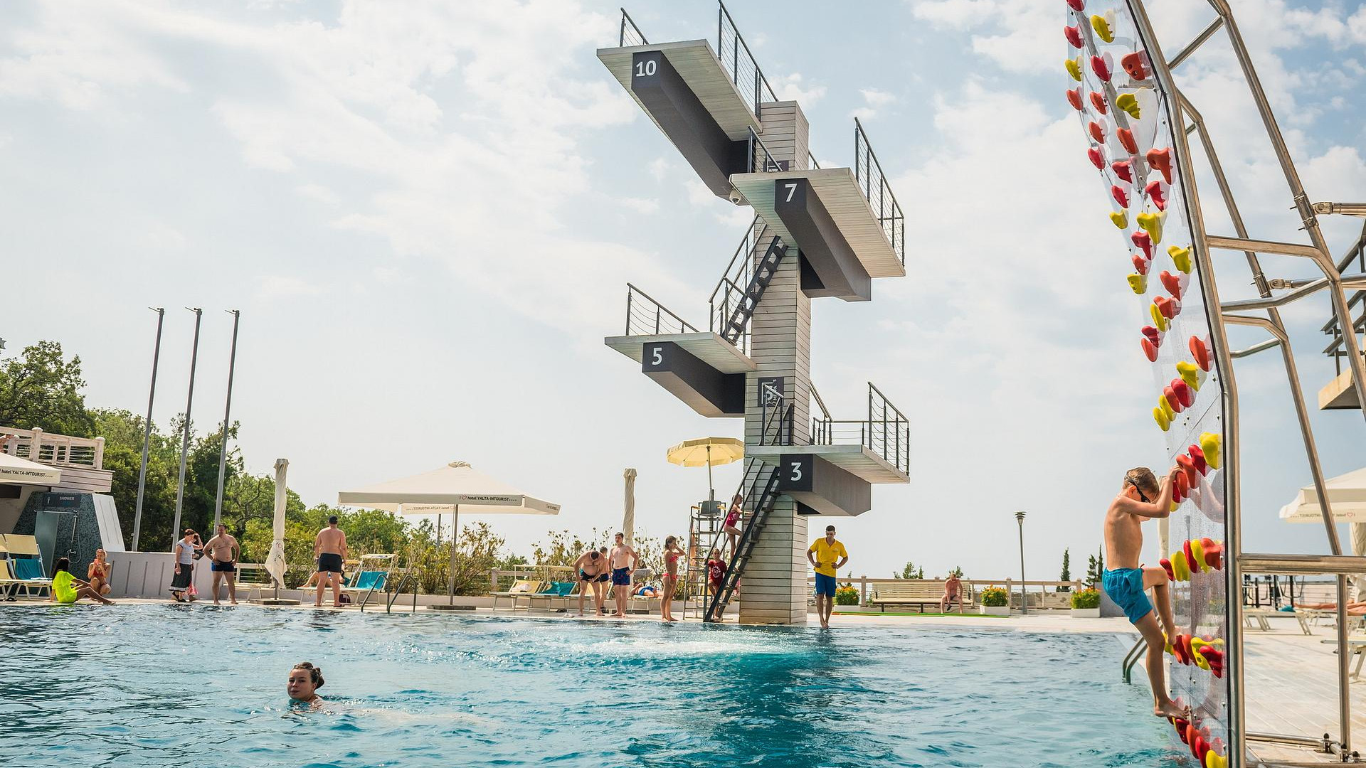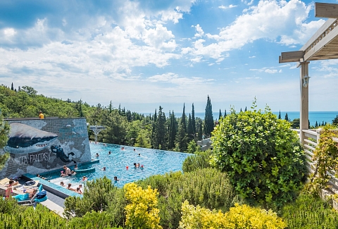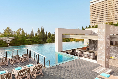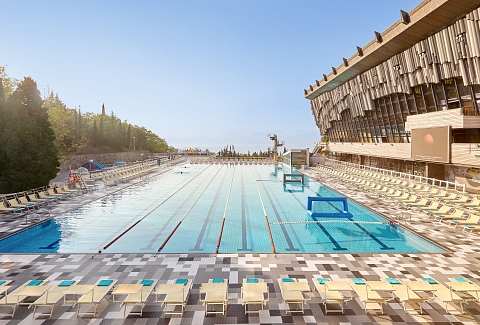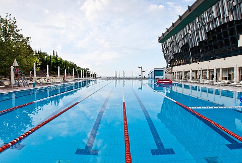 - посещение всех бассейнов на территории (Олимпийский 50-метровый открытый бассейн с подогреваемой морской водой (круглогодично), профессиональный прыжковый бассейн, переливной панорамный бассейн Инфинити с pool-баром и гидромассажем, детские бассейны)
