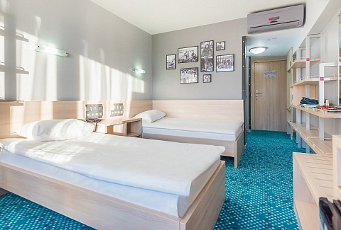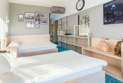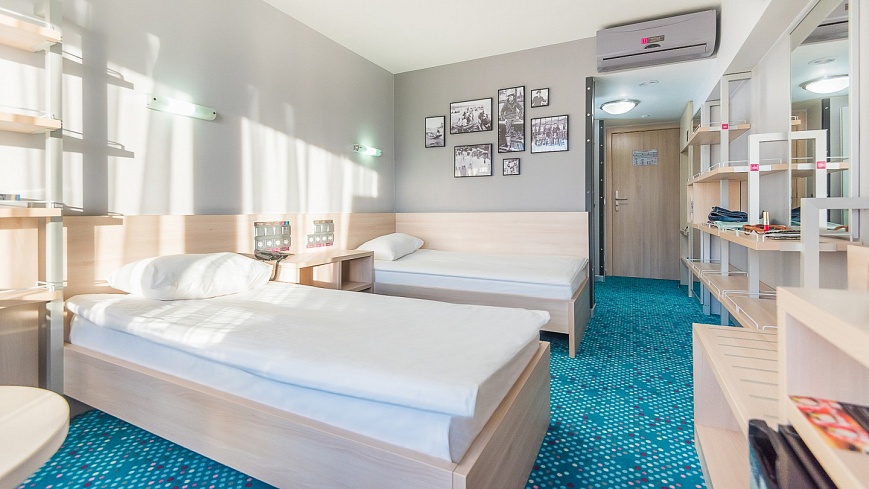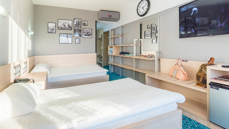 В номере: вешалка, зеркало, кровати односпальные, прикроватные тумбочки, стол, стулья, тумба багажная, шкаф, кондиционер, мини-холодильник, сейф, телевизор ЖК, телефон, чайный набор посуды