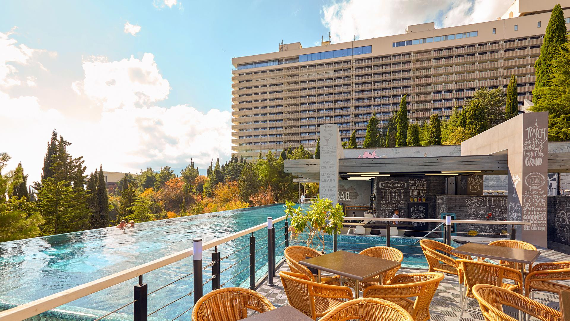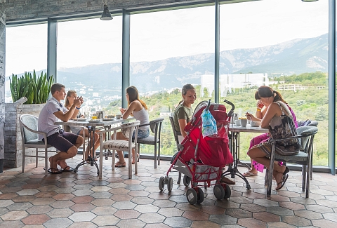 - ресторан панорамный на 16 этаже «Ай-Петри», европейская кухня; итальянский «A-Tavola»; русский «Мамины пельмешки»; восточный «Тюбетейка»; японский «Старик и рыба»; «Бездна»; крымский «Синее море»