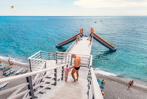 Семь просторных и чистых мелко галечных пляжей, протяженностью 500 метров, оборудованных раздевалками, душевыми, туалетами, специальной песочной зоной – все по европейским стандартам.