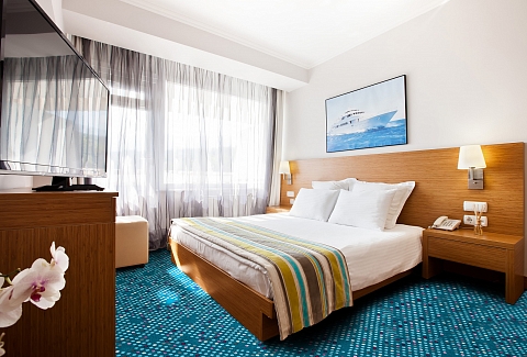 В номере: вешалка, зеркало, кровать двуспальная, прикроватные тумбочки, столик журнальный, стулья, тумба багажная, шкаф, кондиционер, мини-холодильник, сейф, телевизор ЖК, телефон, чайный набор посуды
