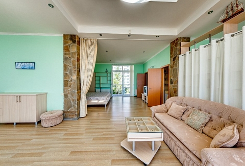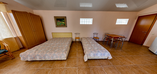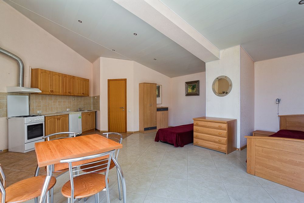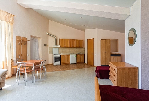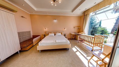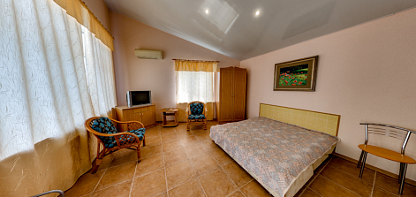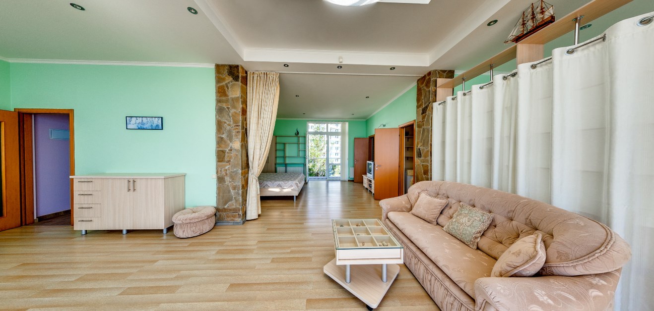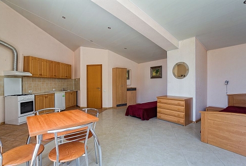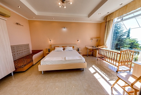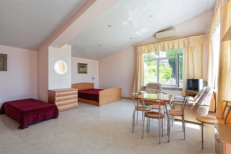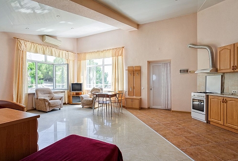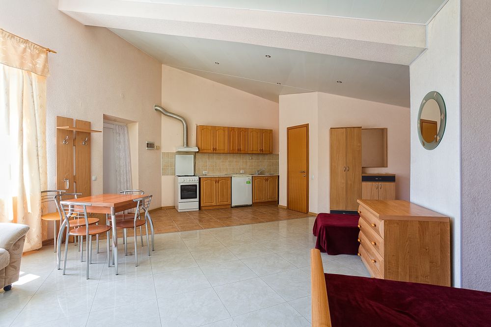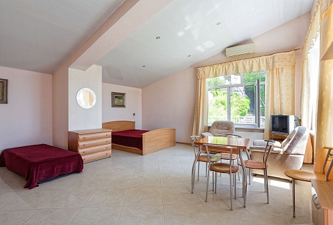 В номере: вешалка, диван, зеркало, кровати односпальные, кровать двуспальная, стол, стул, шкаф, кондиционер, микроволновая печь, набор посуды, телевизор, холодильник, электрочайник