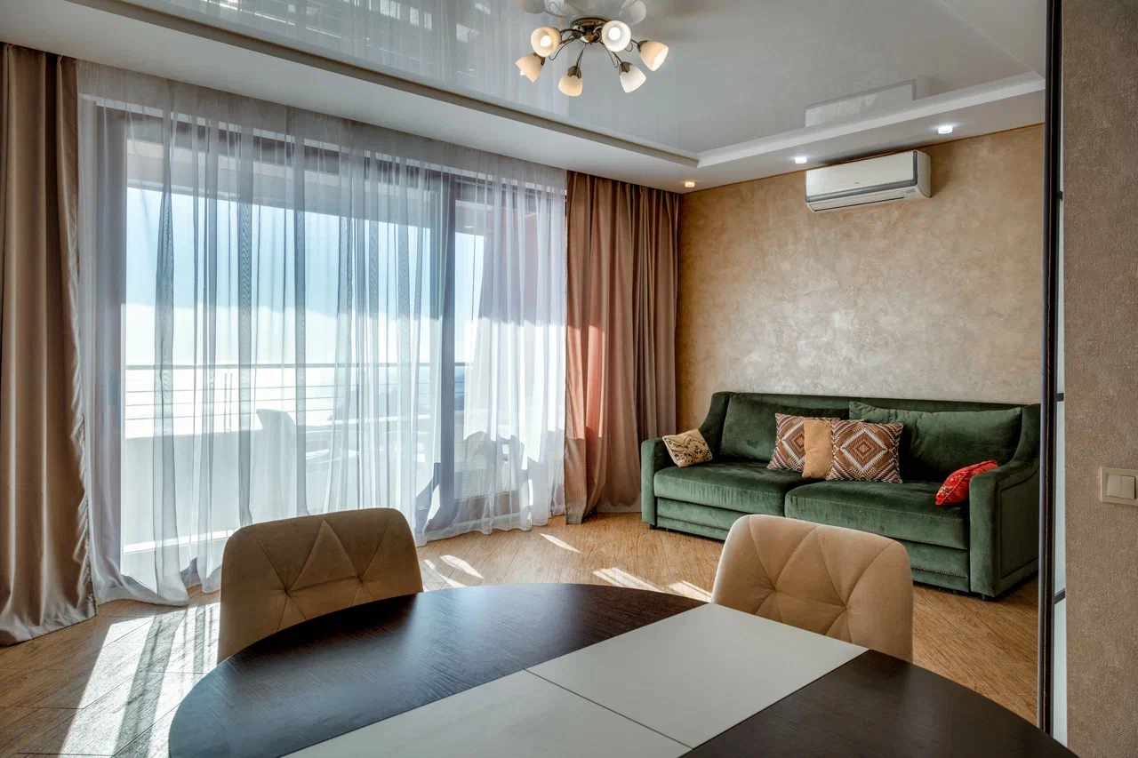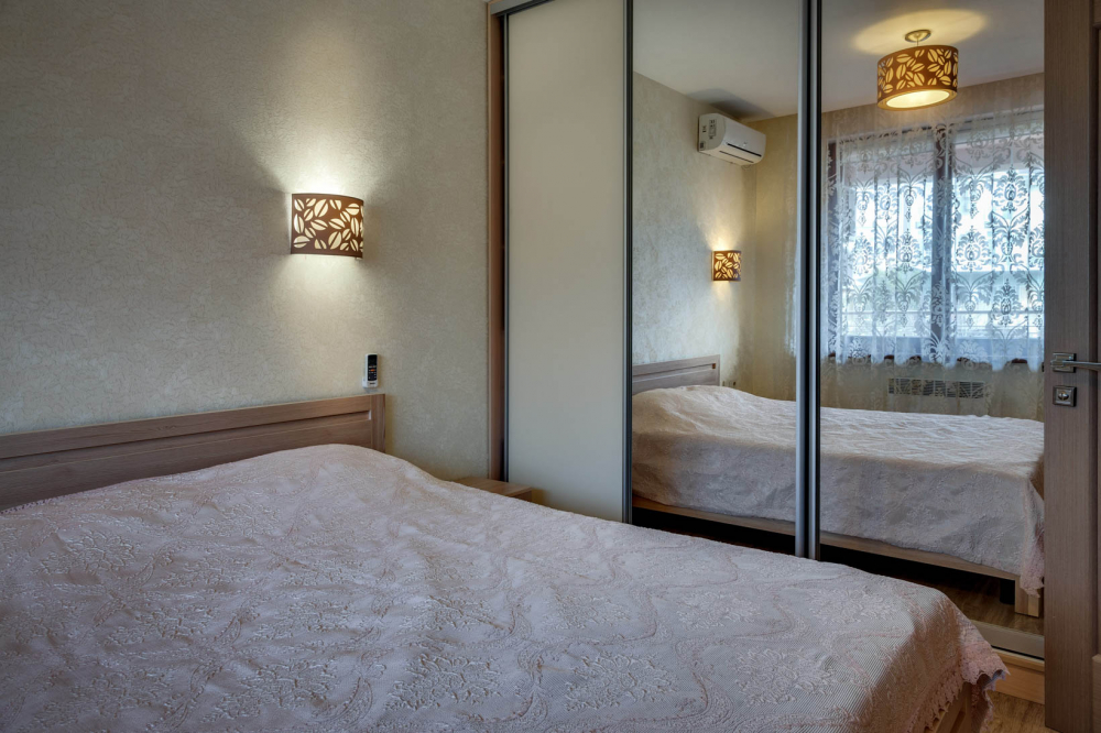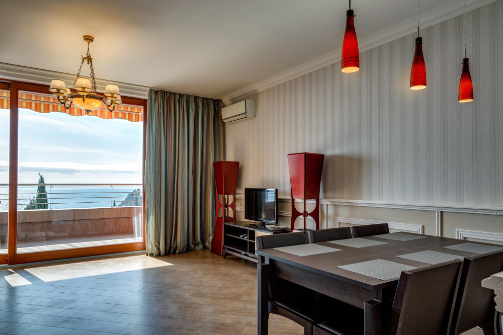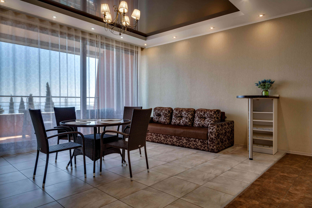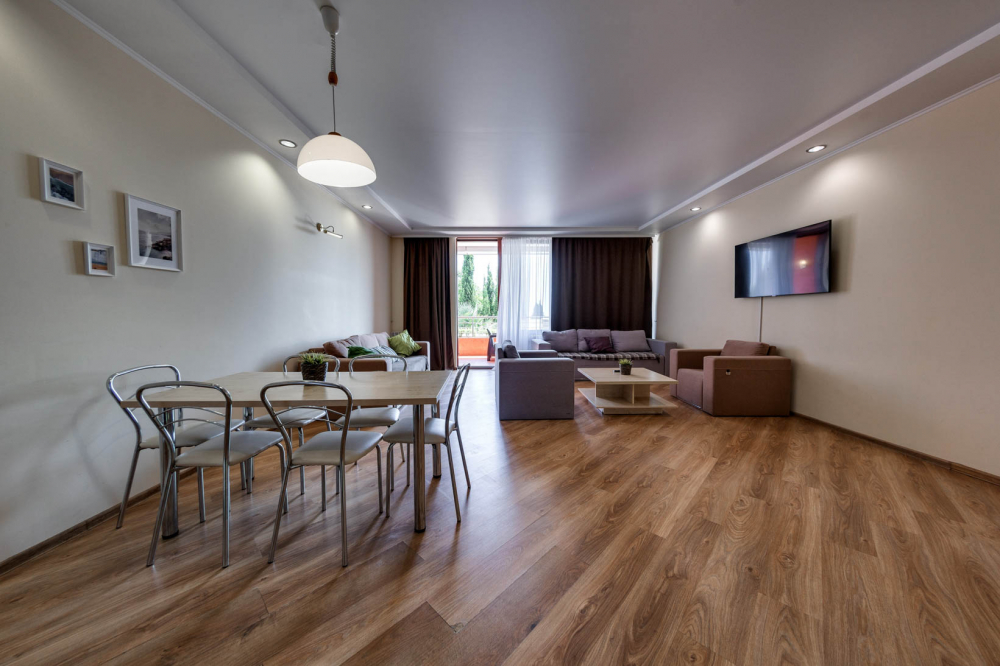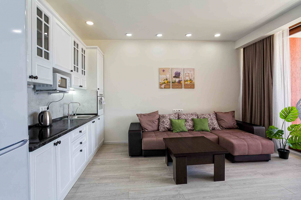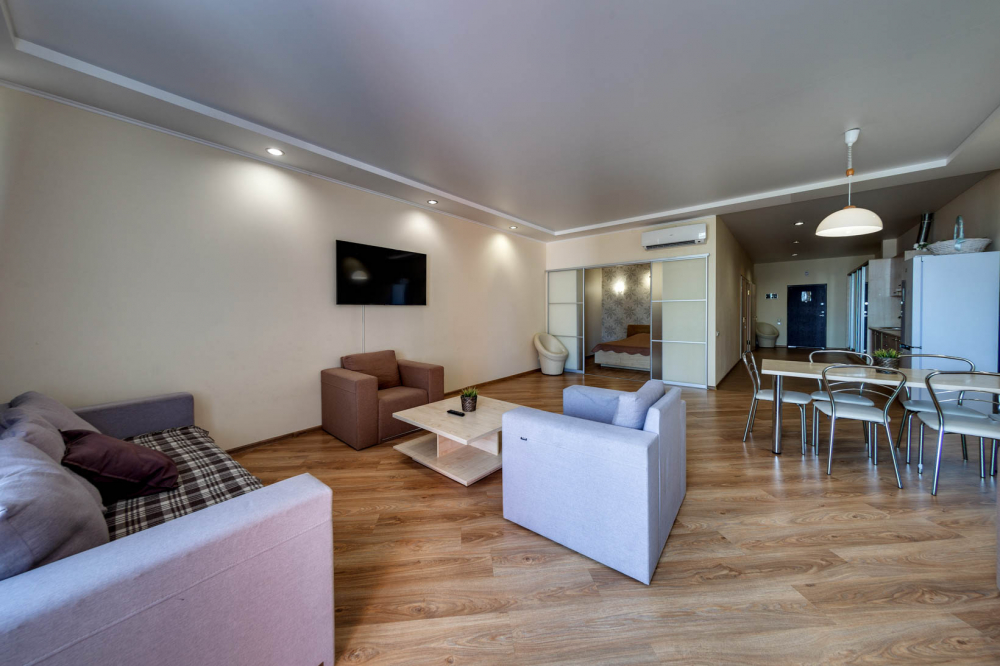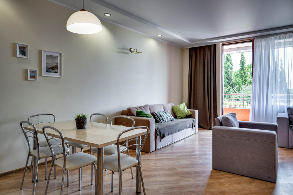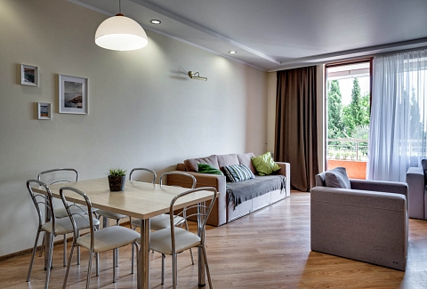 В номере: вешалка, диван, диван раскладной, зеркало, кровать двуспальная, кровать односпальная, кухонная мебель, прикроватные тумбочки, стол, стулья, шкаф, кондиционер, микроволновая печь, плита электрическая, телевизор, холодильник, электрочайник