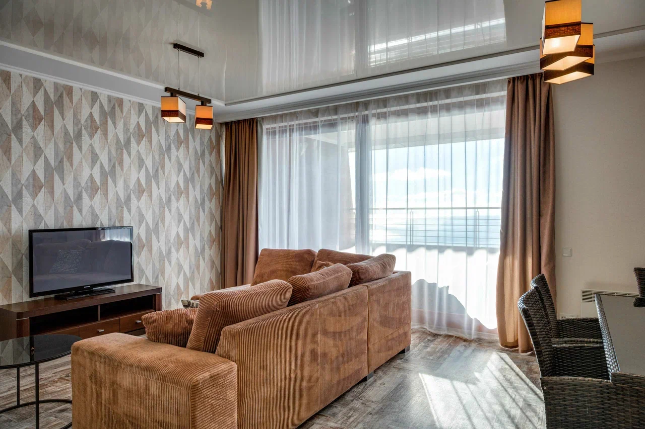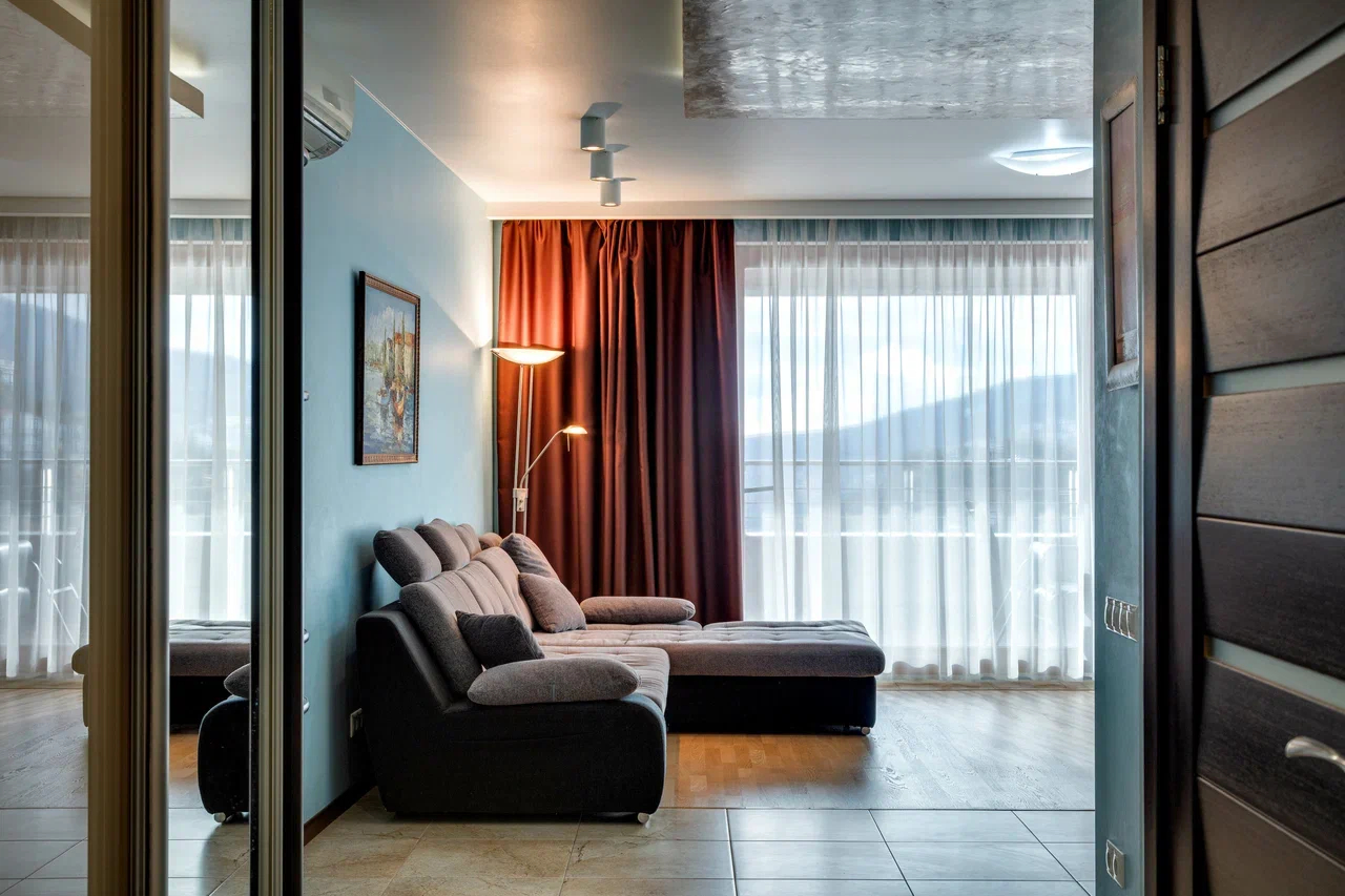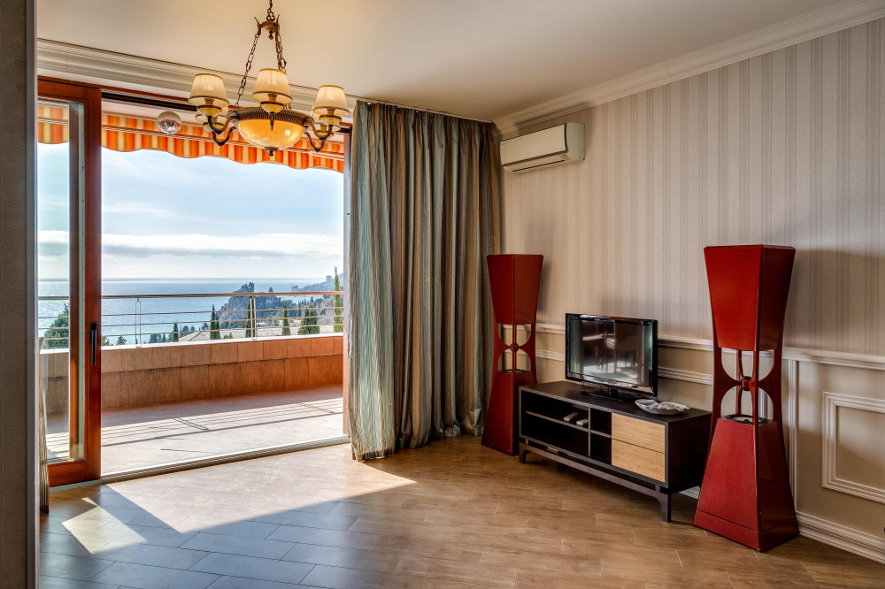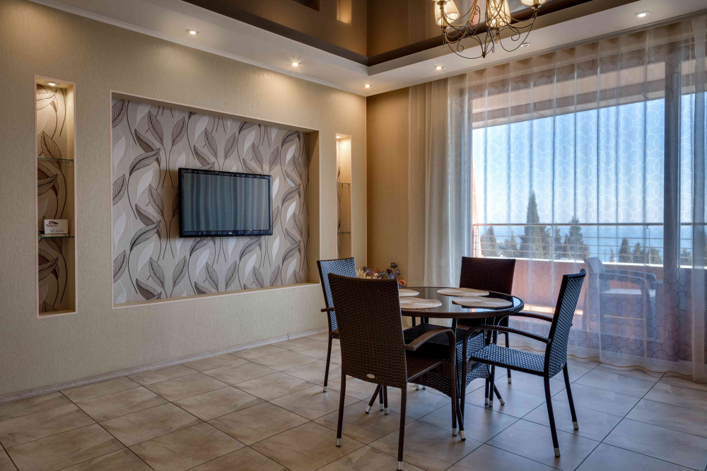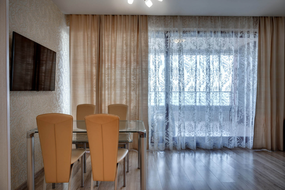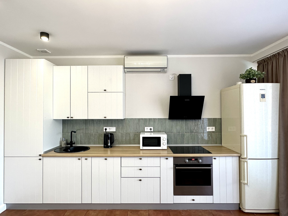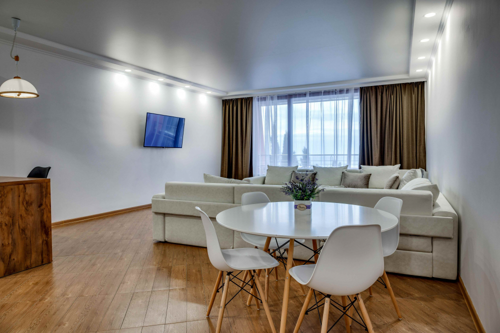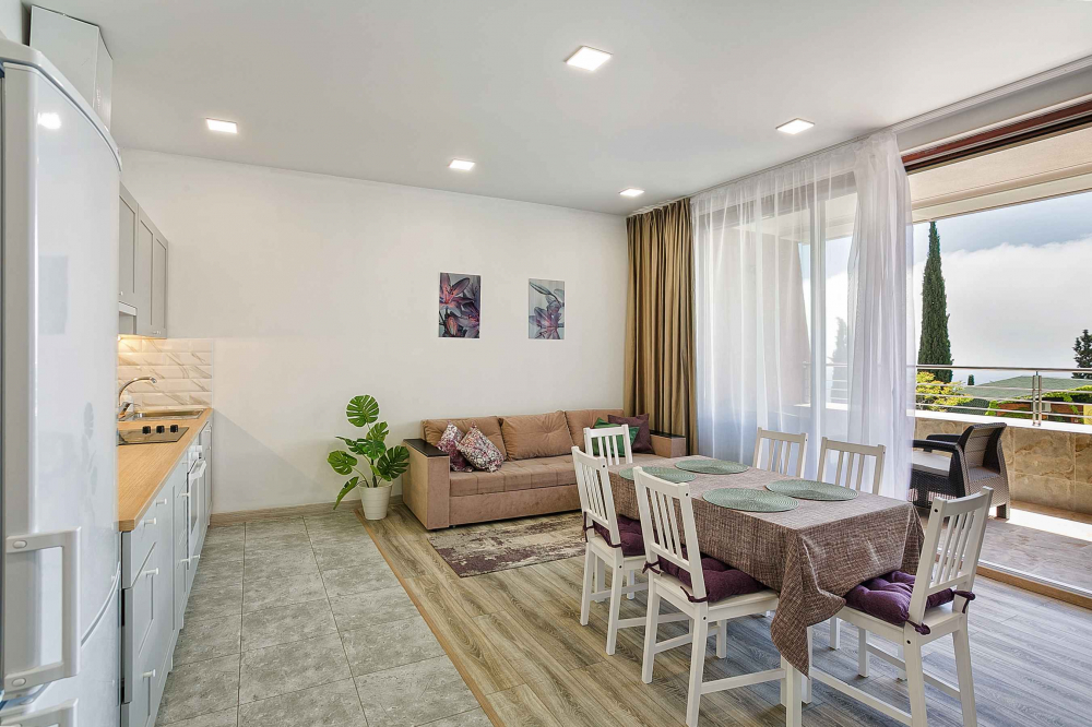В номере: вешалка, диван, диван раскладной, зеркало, кровать двуспальная, кровать односпальная, кухонная мебель, прикроватные тумбочки, стол, стулья, шкаф, кондиционер, микроволновая печь, плита электрическая, телевизор, холодильник, электрочайник