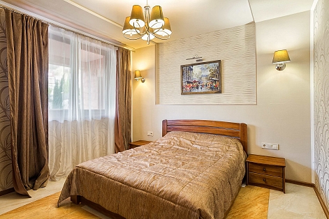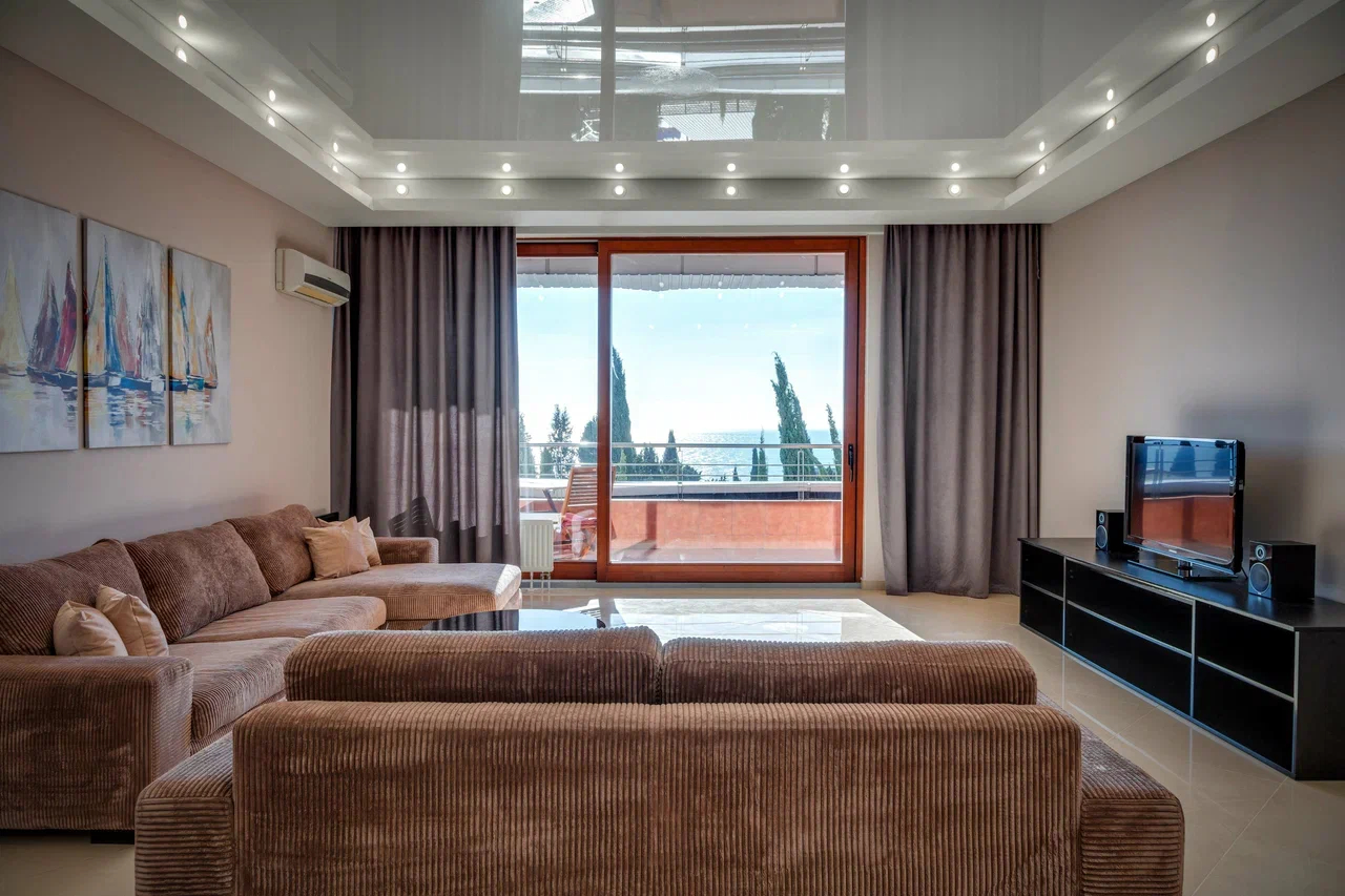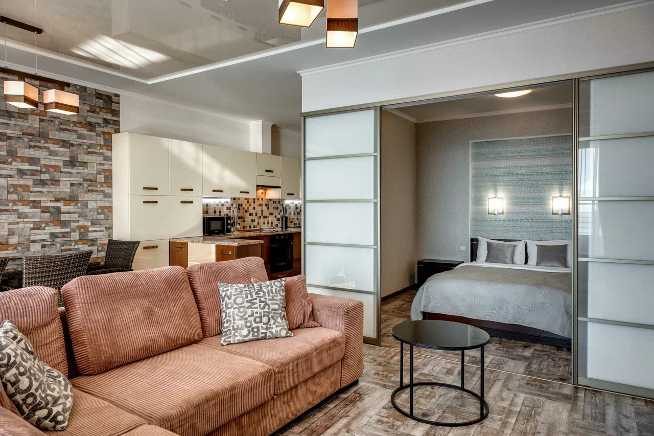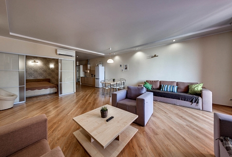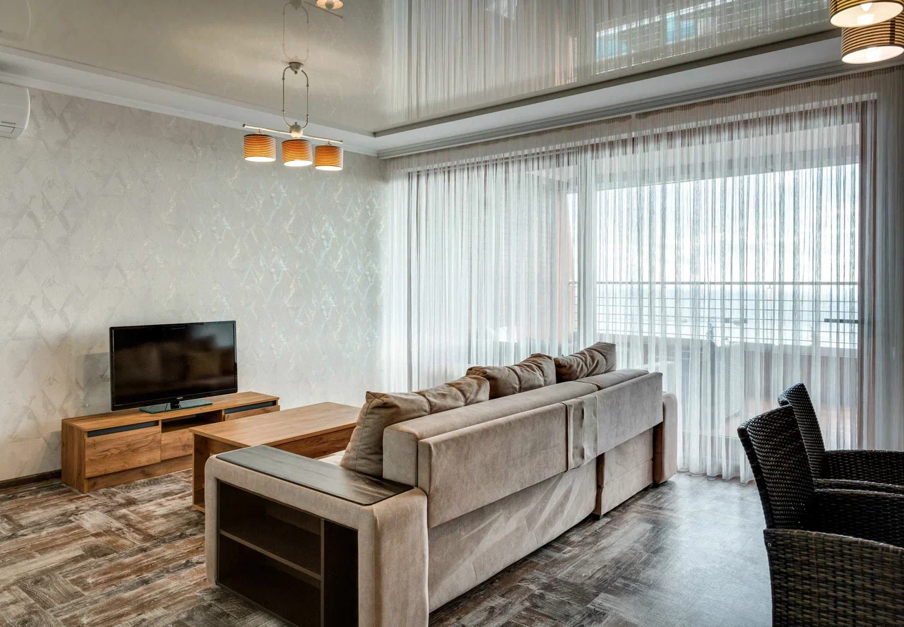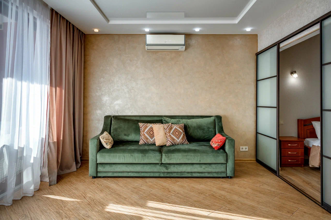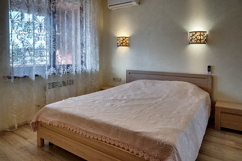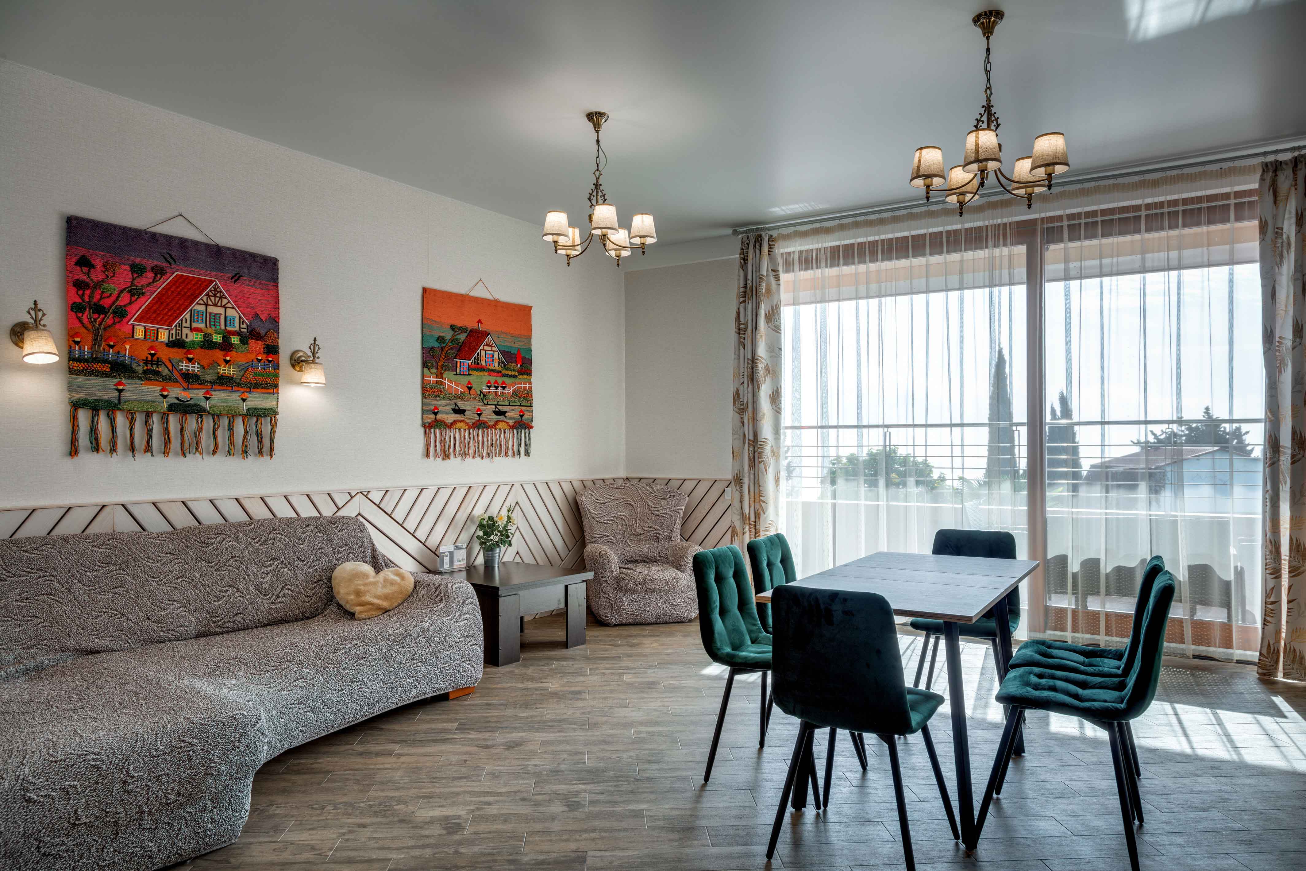 В номере: вешалка, диван, диван раскладной, зеркало, кровать двуспальная, кровать односпальная, кухонная мебель, прикроватные тумбочки, стол, стулья, шкаф, кондиционер, микроволновая печь, плита электрическая, телевизор, холодильник, электрочайник