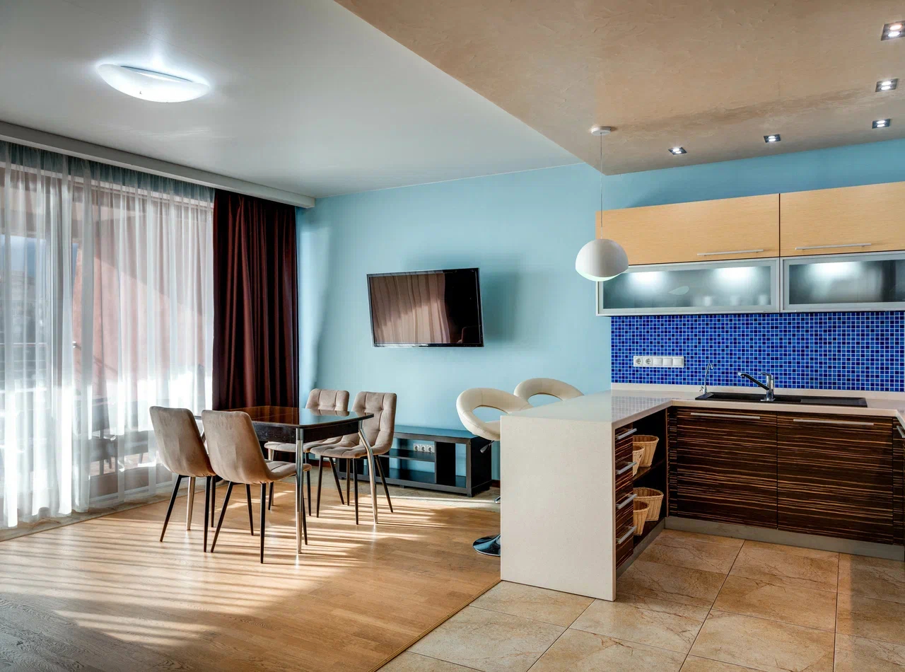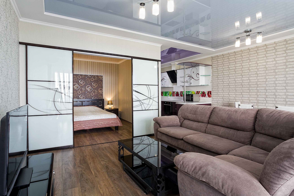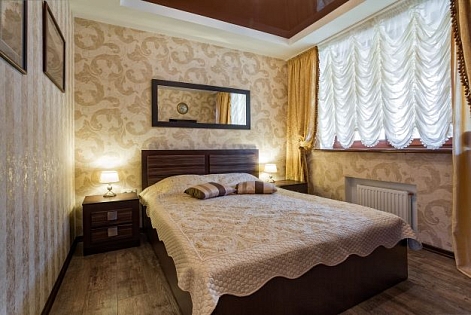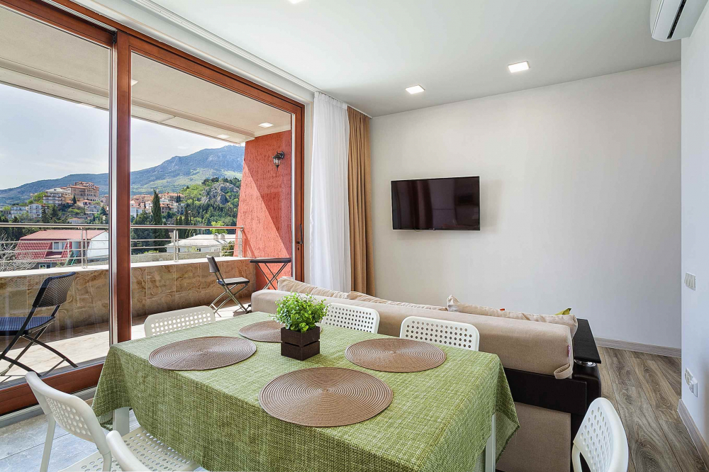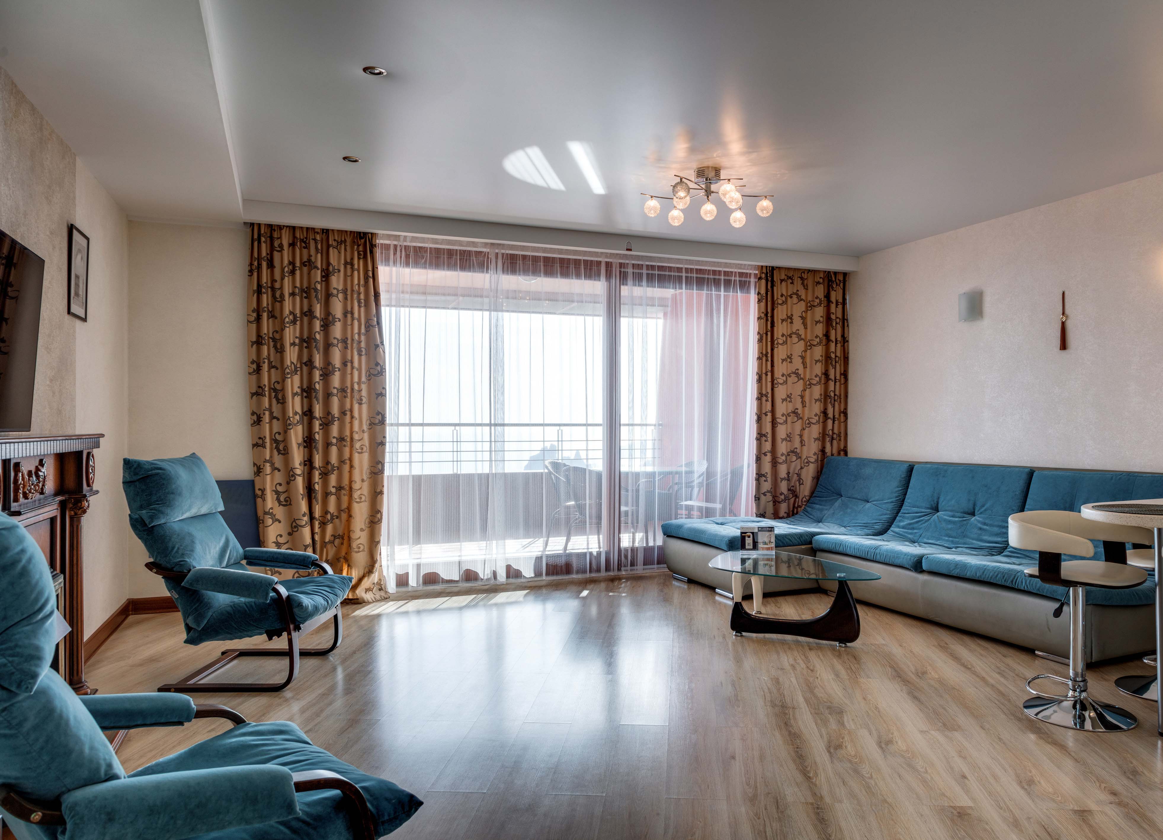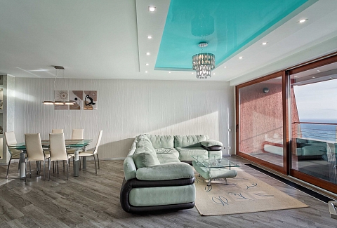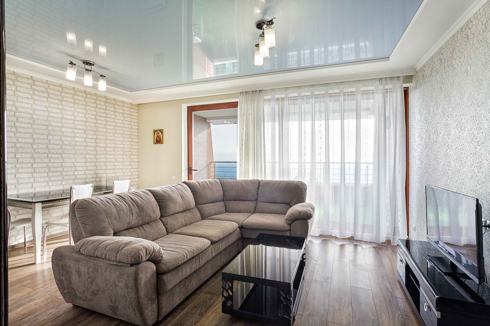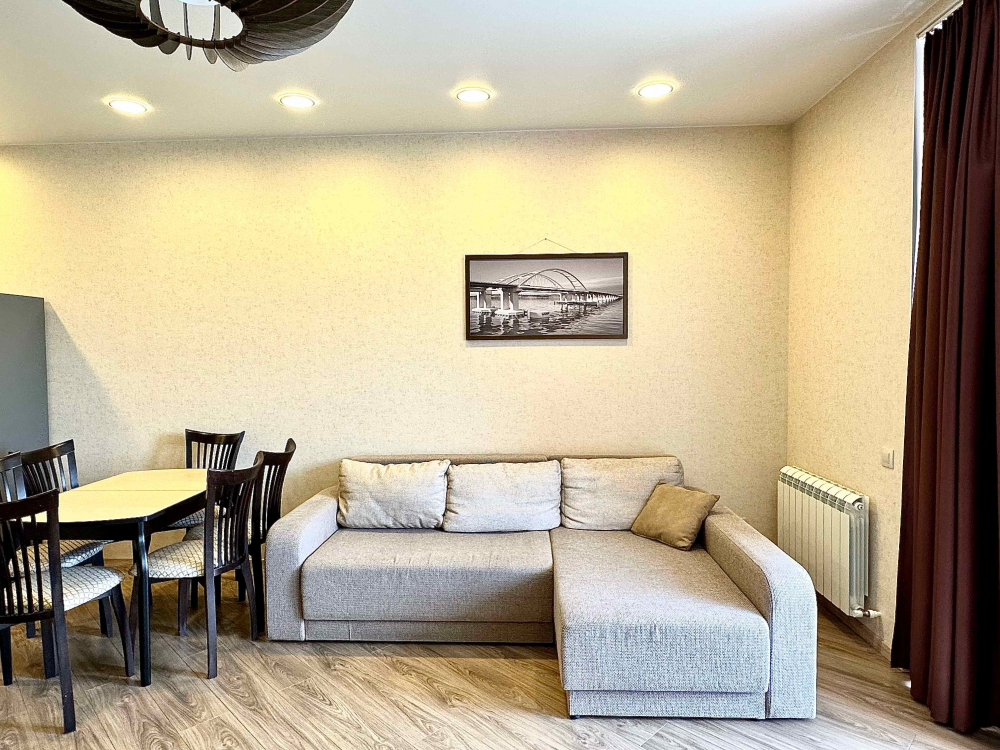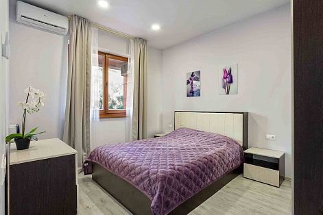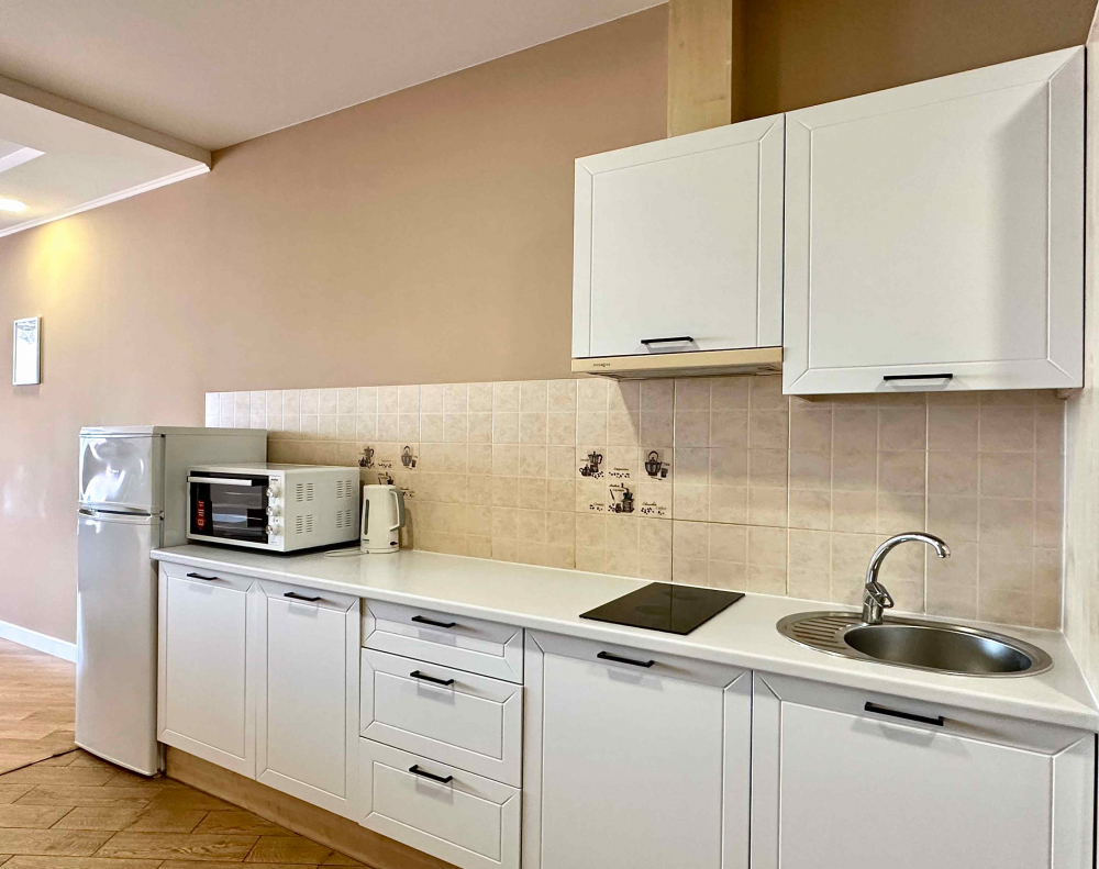 В номере: вешалка, диван, диван раскладной, зеркало, кровать двуспальная, кровать односпальная, кухонная мебель, прикроватные тумбочки, стол, стулья, шкаф, кондиционер, микроволновая печь, плита электрическая, телевизор, холодильник, электрочайник