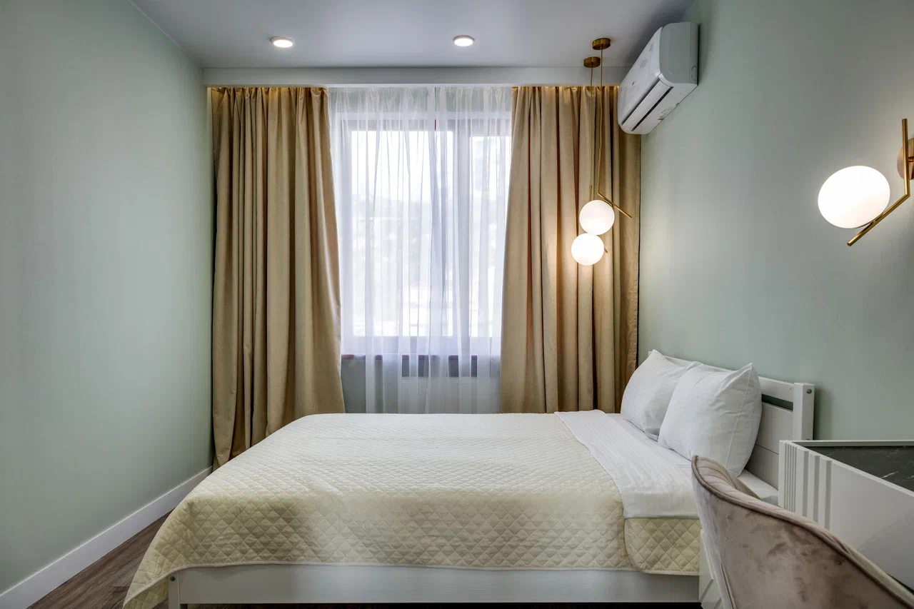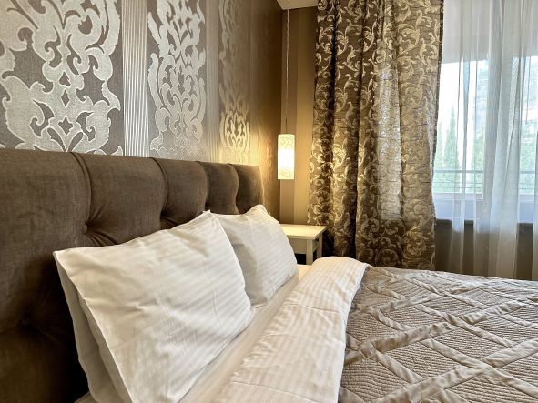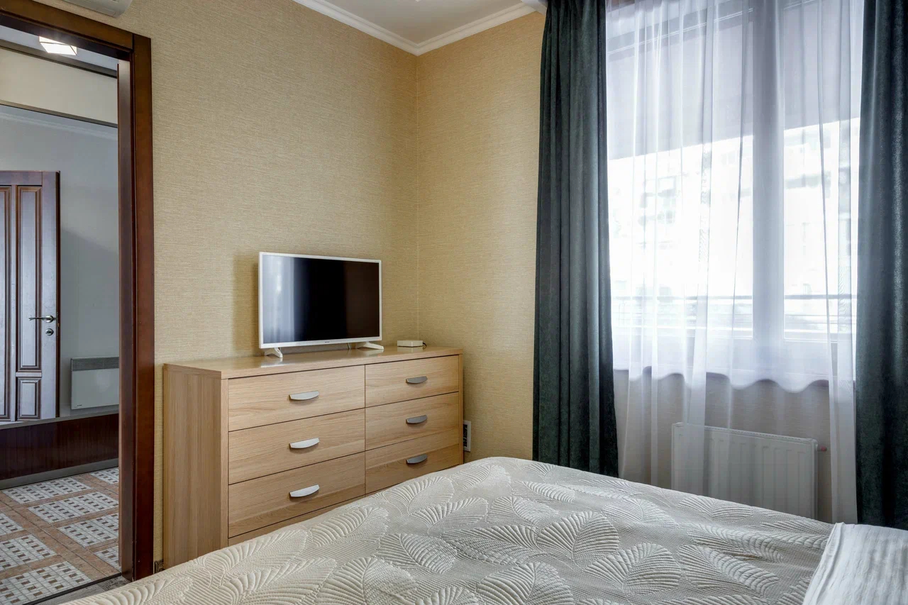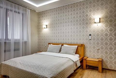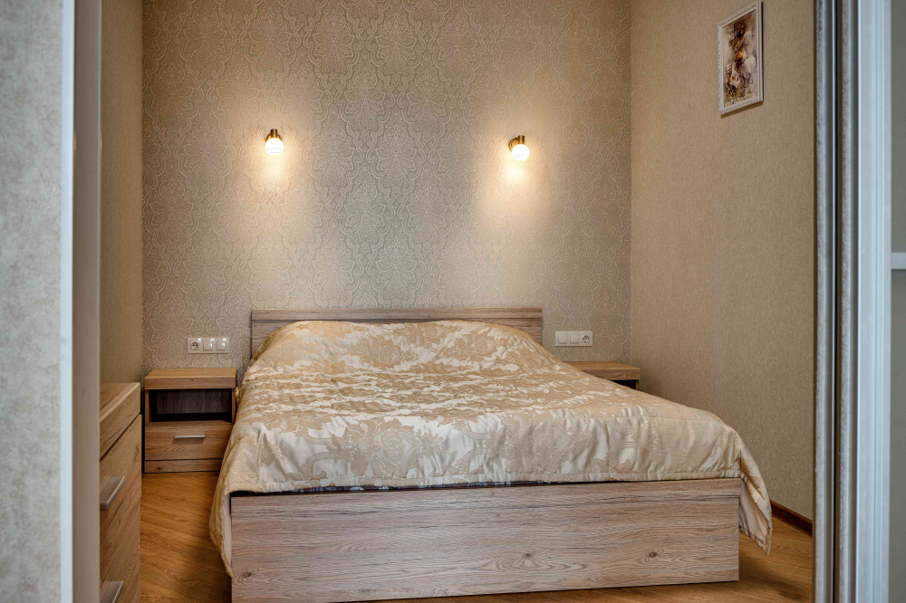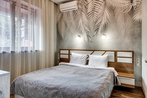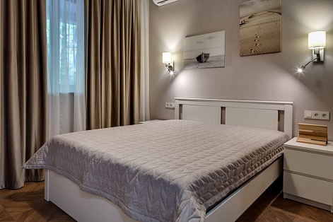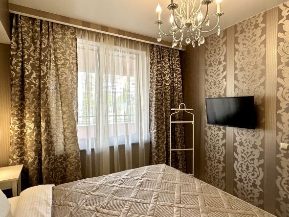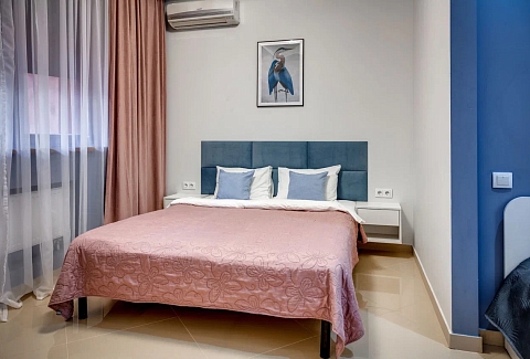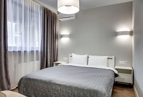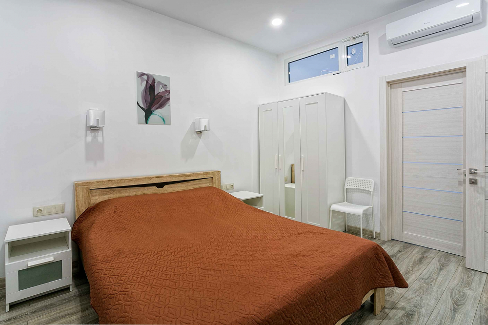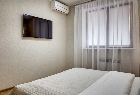 В номере: вешалка, диван раскладной, зеркало, кровать двуспальная, прикроватные тумбочки, стол, стулья, шкаф, кондиционер, микроволновая печь, плита электрическая, стиральная машина, телевизор, холодильник, электрочайник