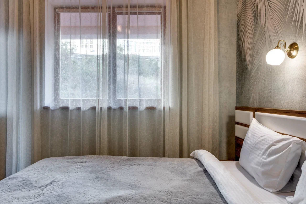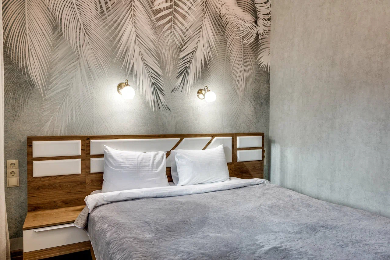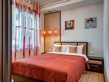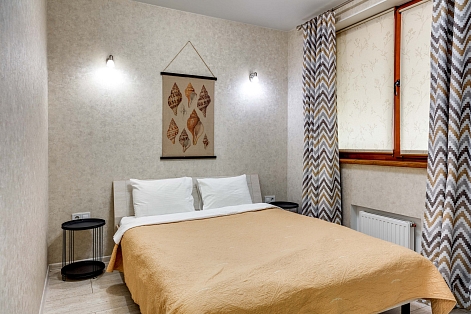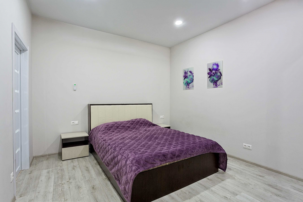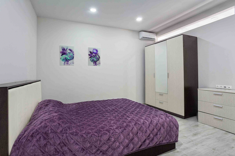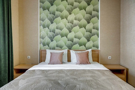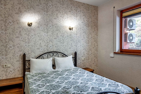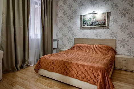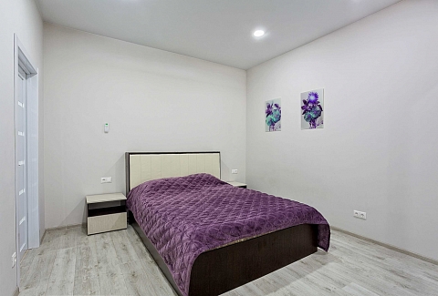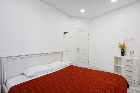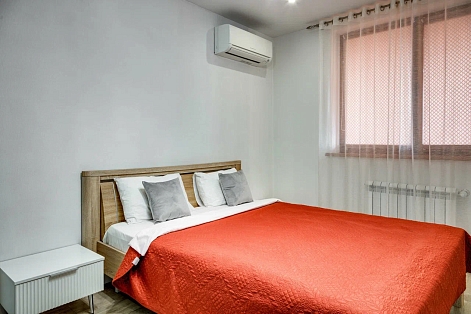 В номере: вешалка, диван раскладной, зеркало, кровать двуспальная, прикроватные тумбочки, стол, стулья, шкаф, кондиционер, микроволновая печь, плита электрическая, стиральная машина, телевизор, холодильник, электрочайник