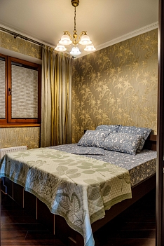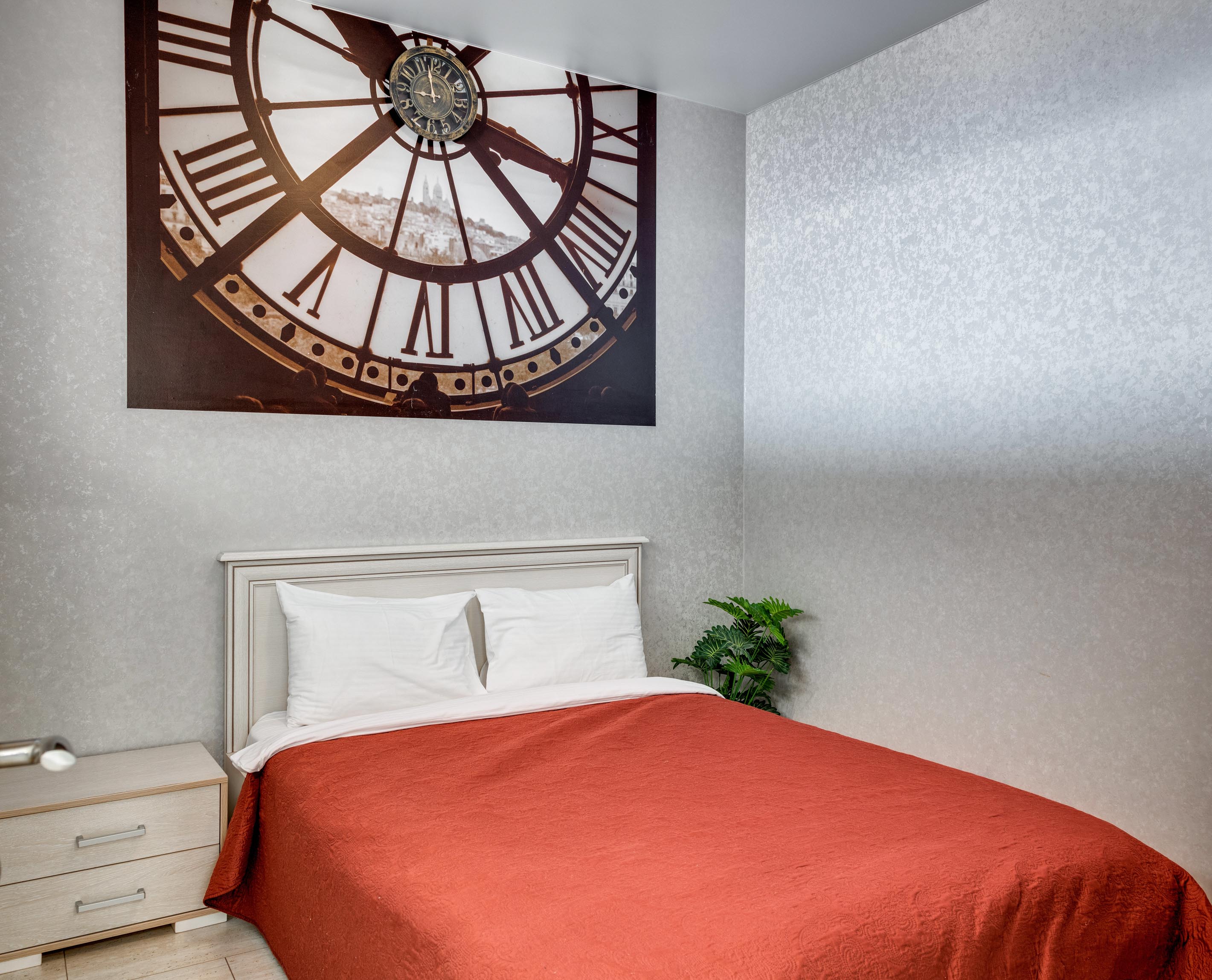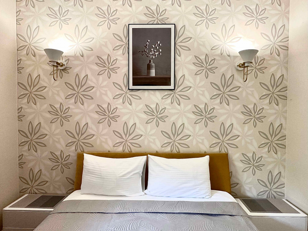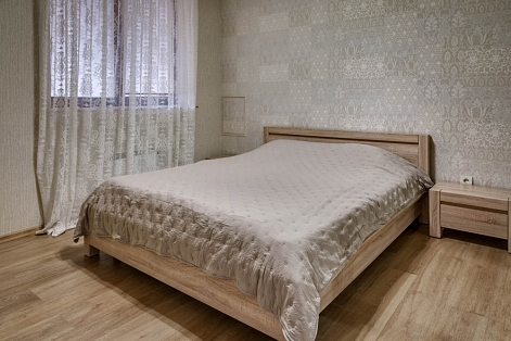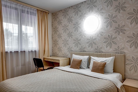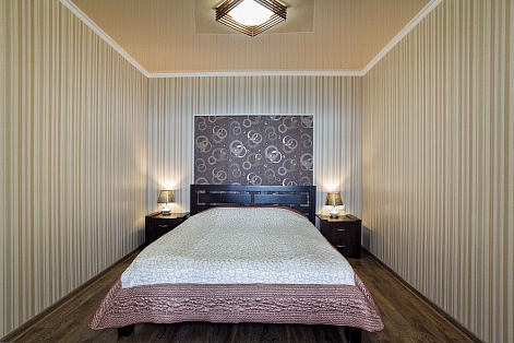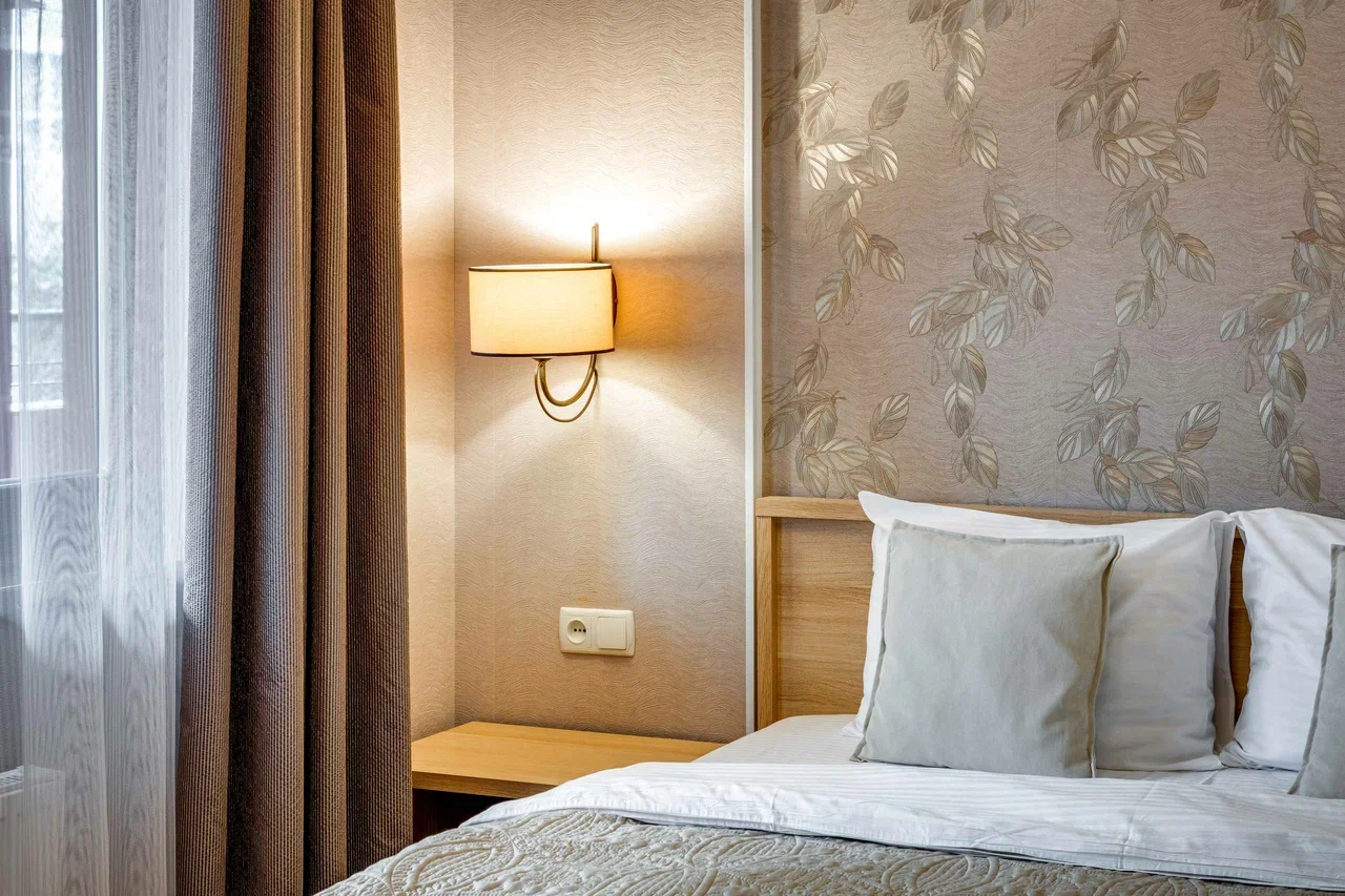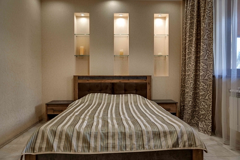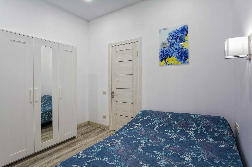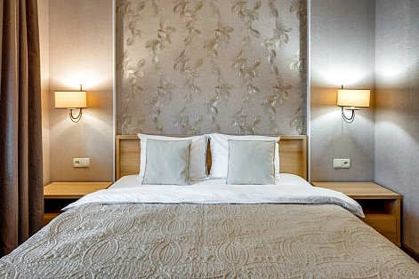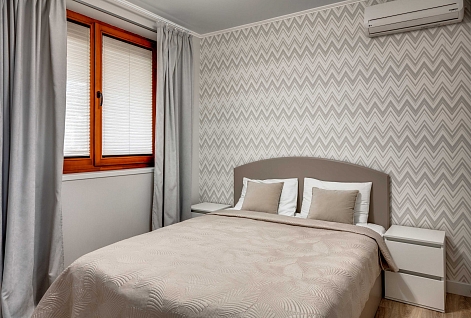 В номере: вешалка, диван раскладной, зеркало, кровать двуспальная, прикроватные тумбочки, стол, стулья, шкаф, кондиционер, микроволновая печь, плита электрическая, стиральная машина, телевизор, холодильник, электрочайник