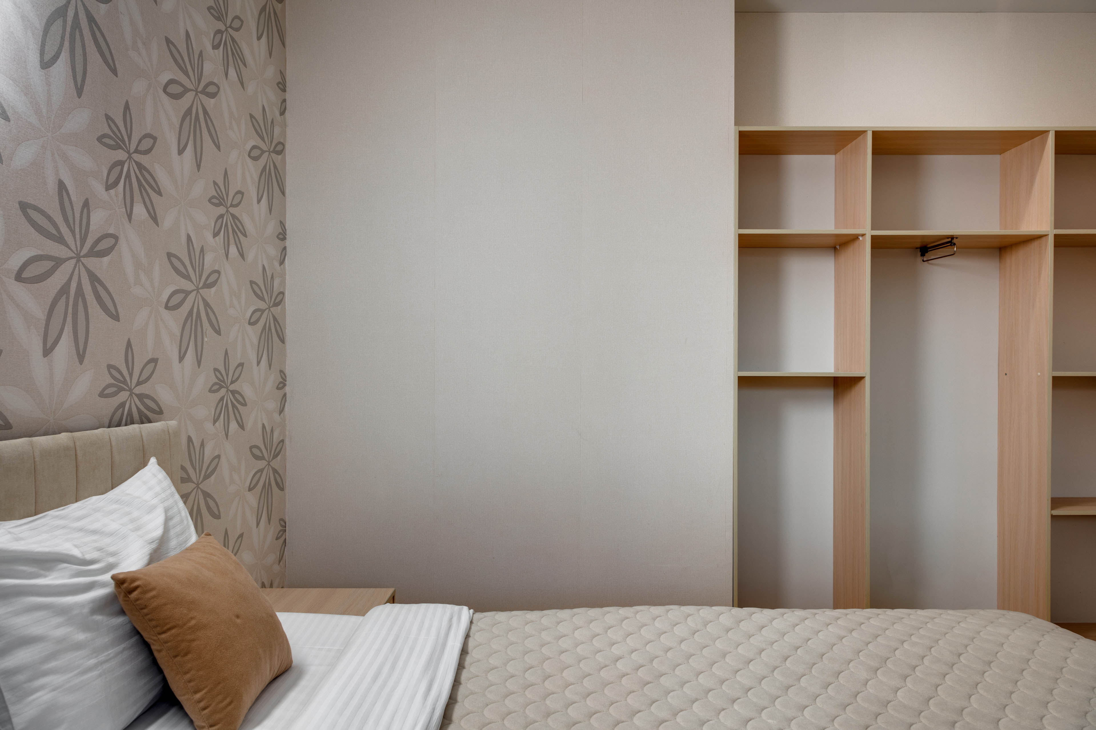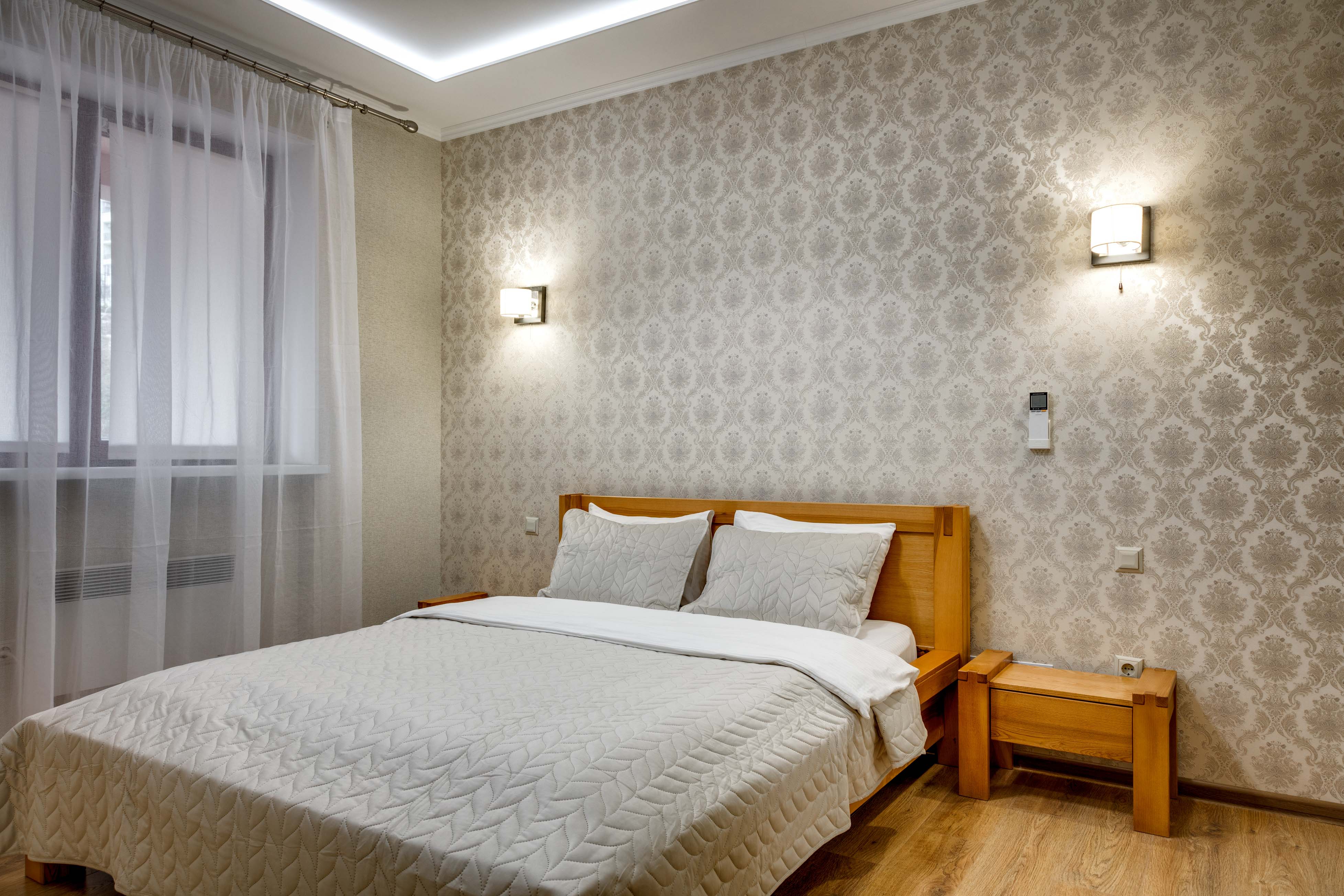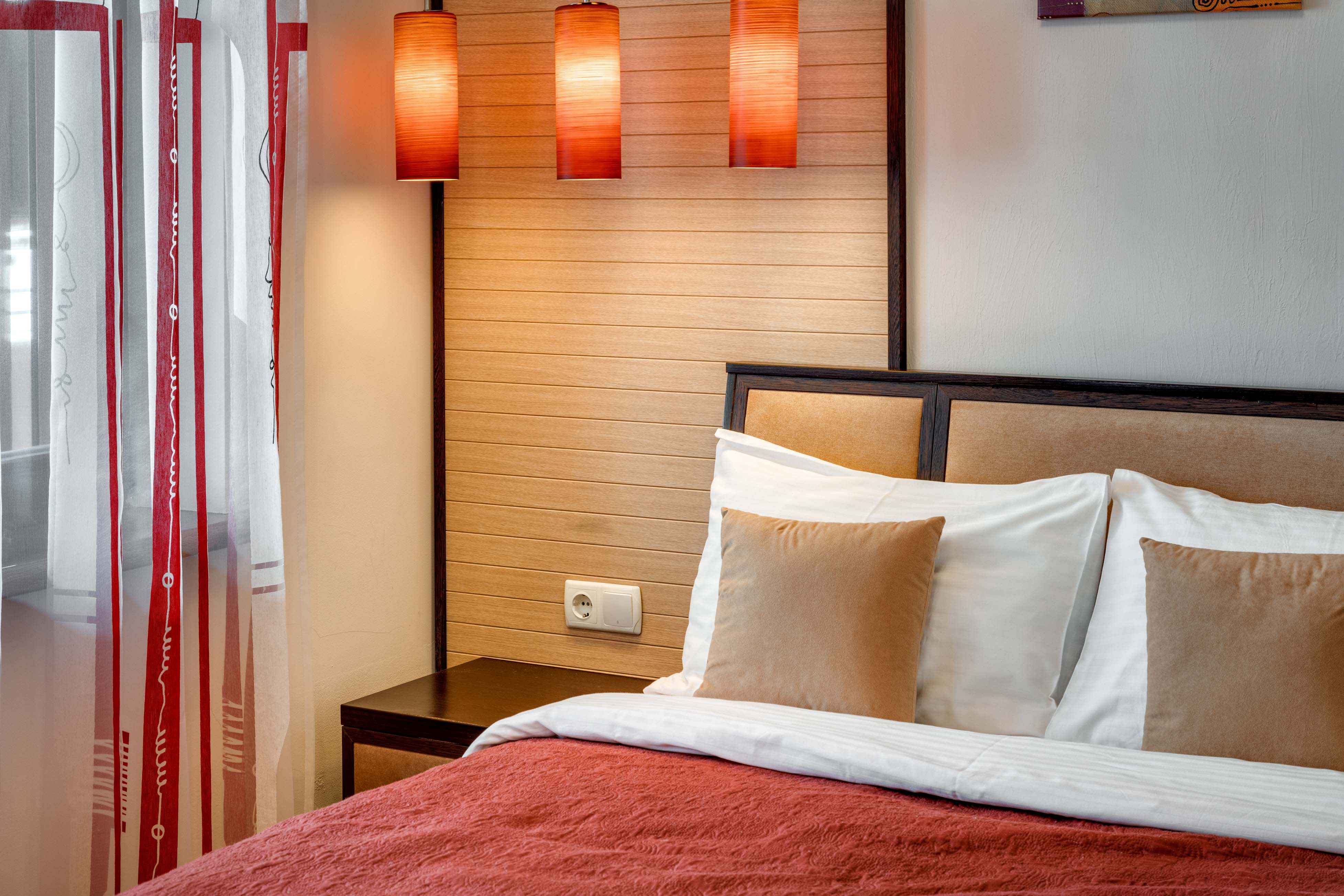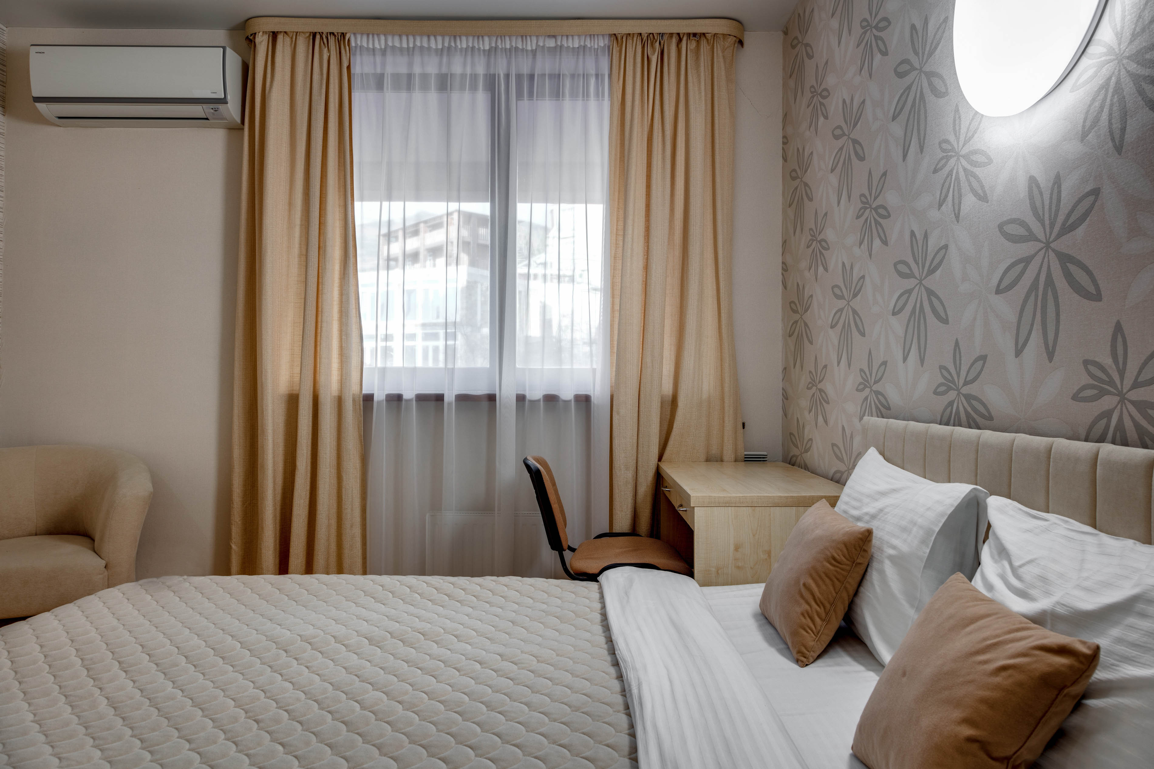 В номере: вешалка, диван раскладной, зеркало, кровать двуспальная, прикроватные тумбочки, стол, стулья, шкаф, кондиционер, микроволновая печь, плита электрическая, стиральная машина, телевизор, холодильник, электрочайник