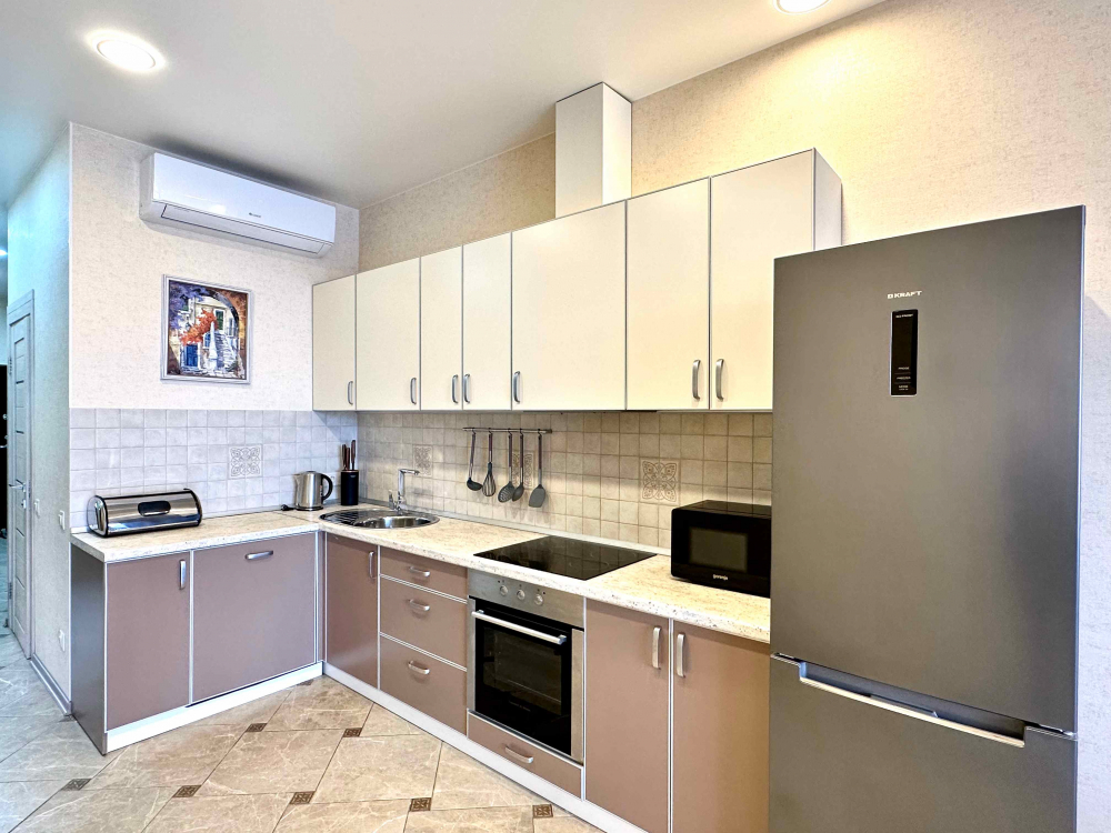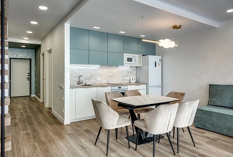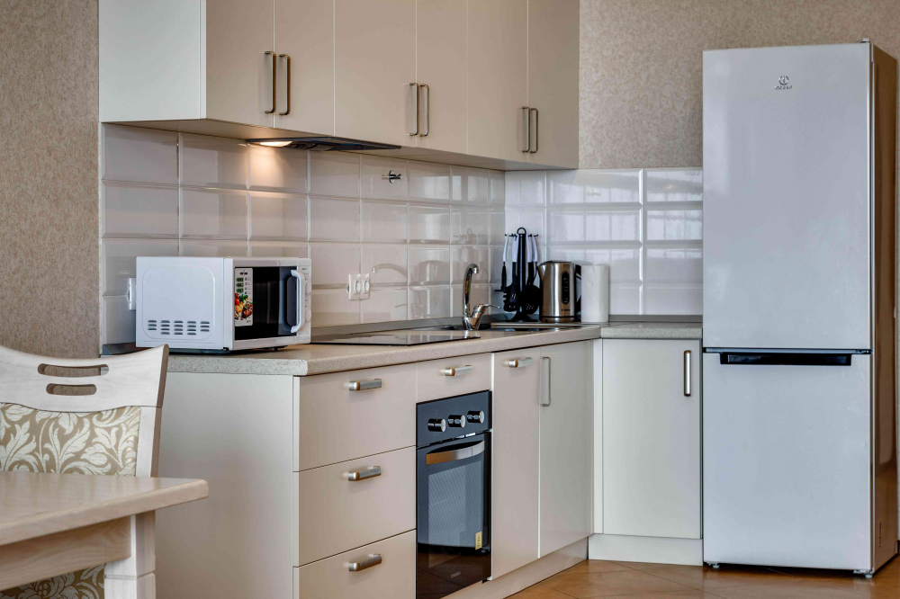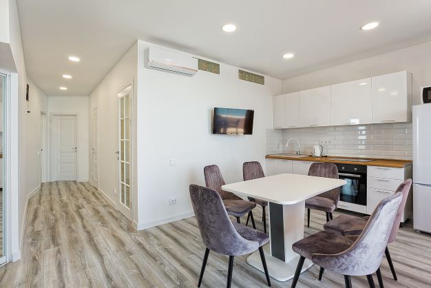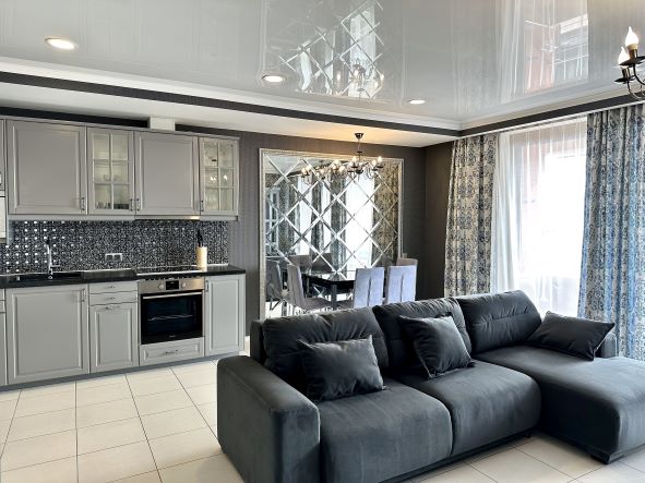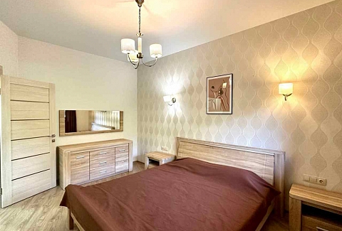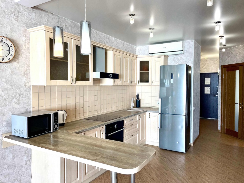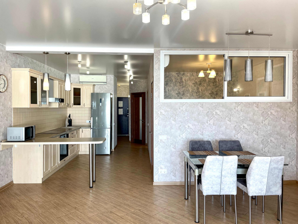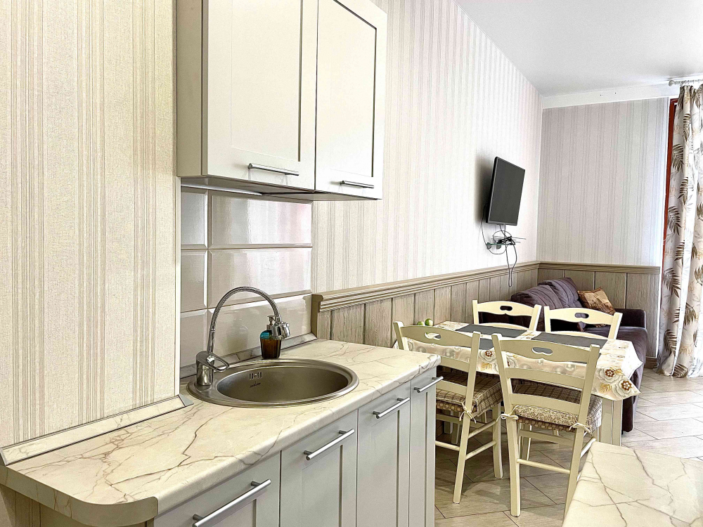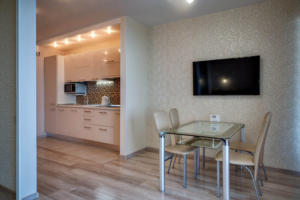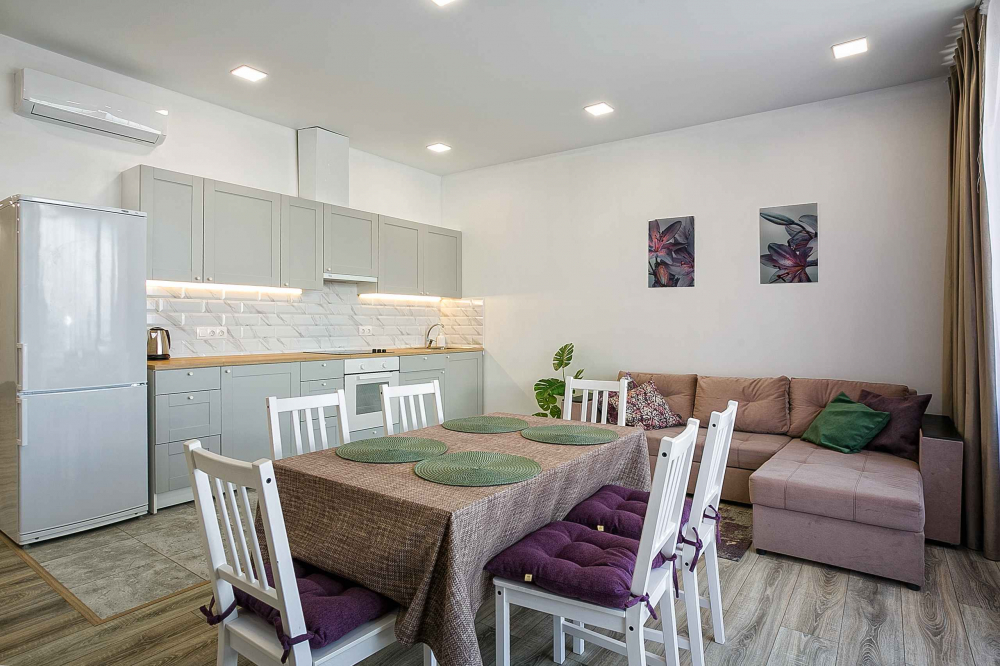 В номере: вешалка, диван, зеркало, кровать двуспальная, кухонная мебель, прикроватная тумбочка, стол, стулья, шкаф, микроволновая печь, плита электрическая, посудомоечная машина, телевизор, холодильник, электрочайник