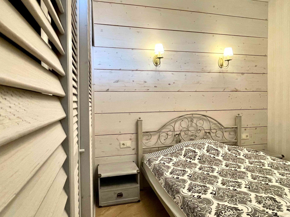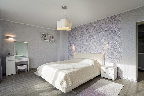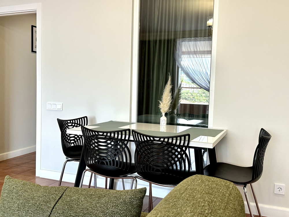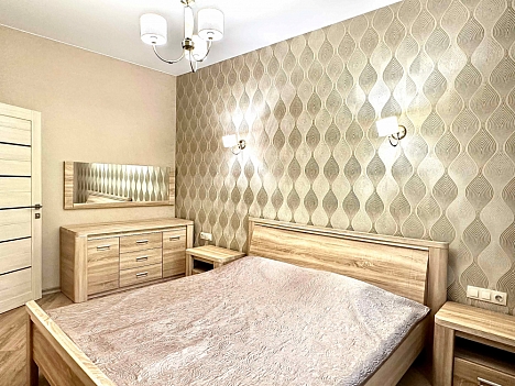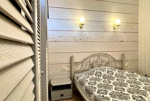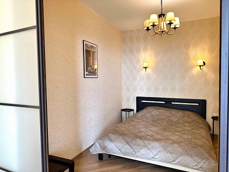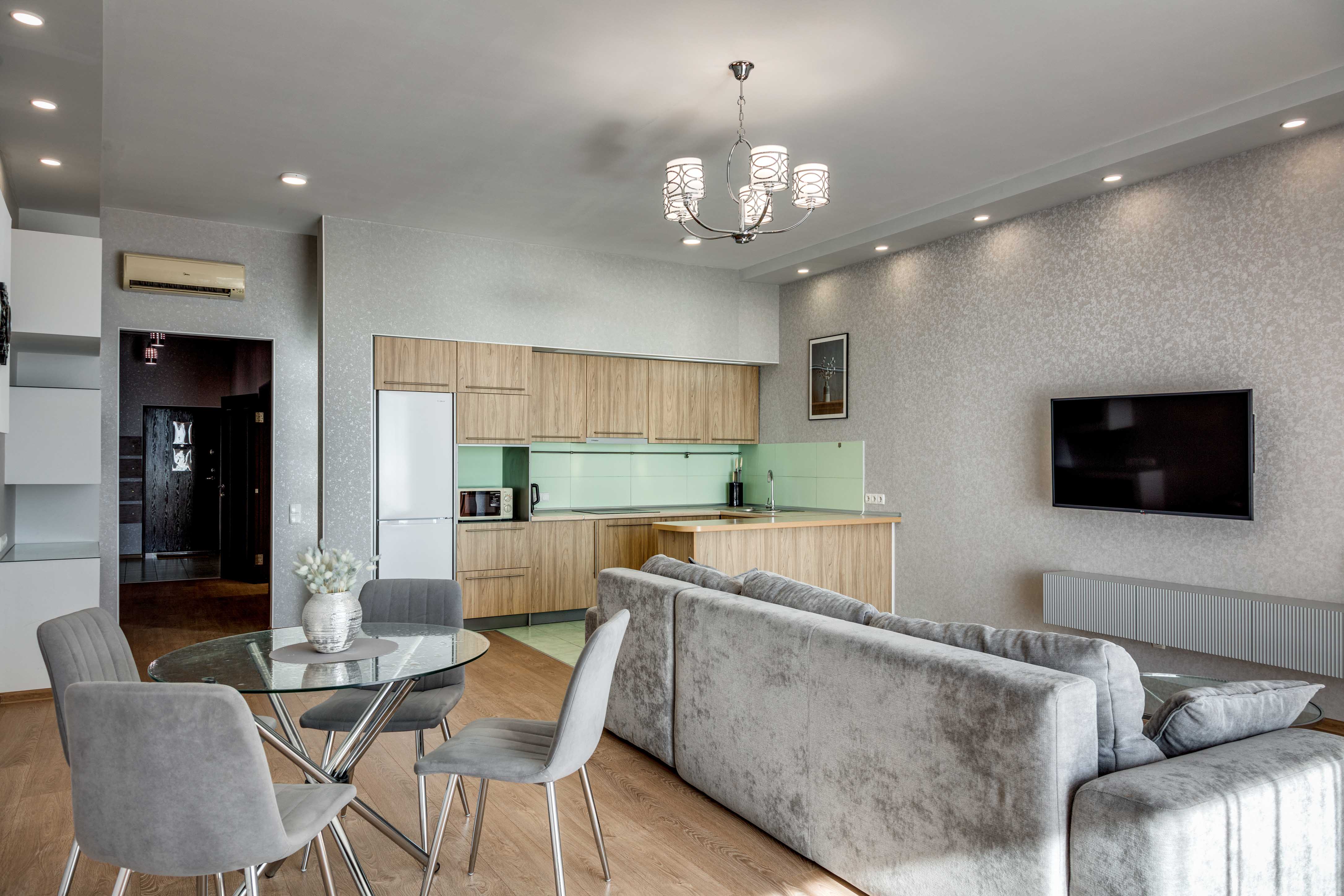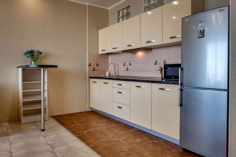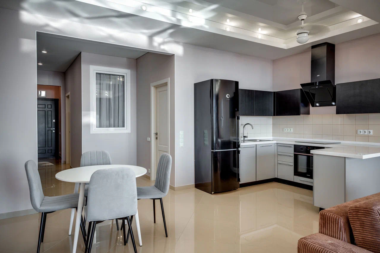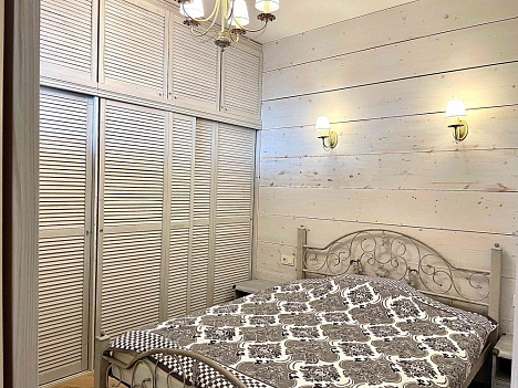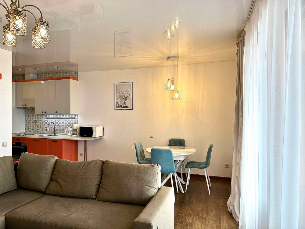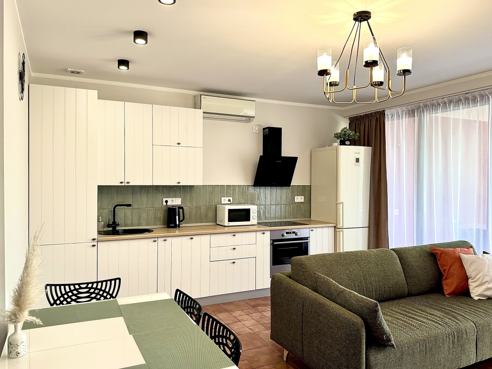 В номере: вешалка, диван, зеркало, кровать двуспальная, кухонная мебель, прикроватная тумбочка, стол, стулья, шкаф, микроволновая печь, плита электрическая, посудомоечная машина, телевизор, холодильник, электрочайник